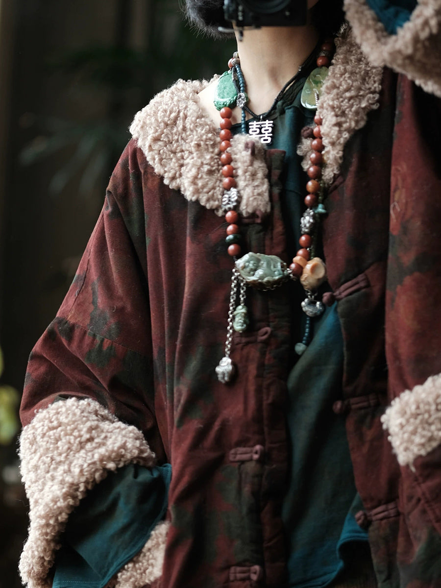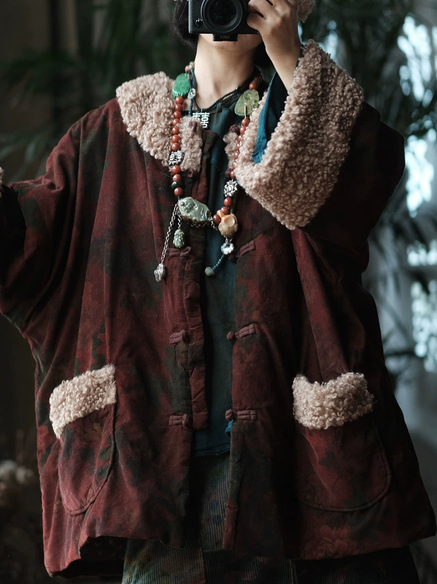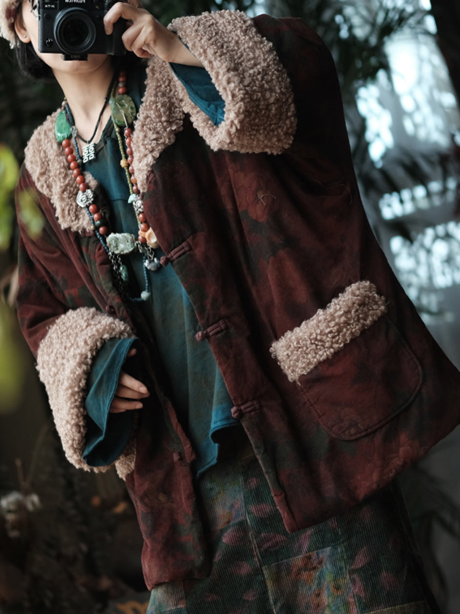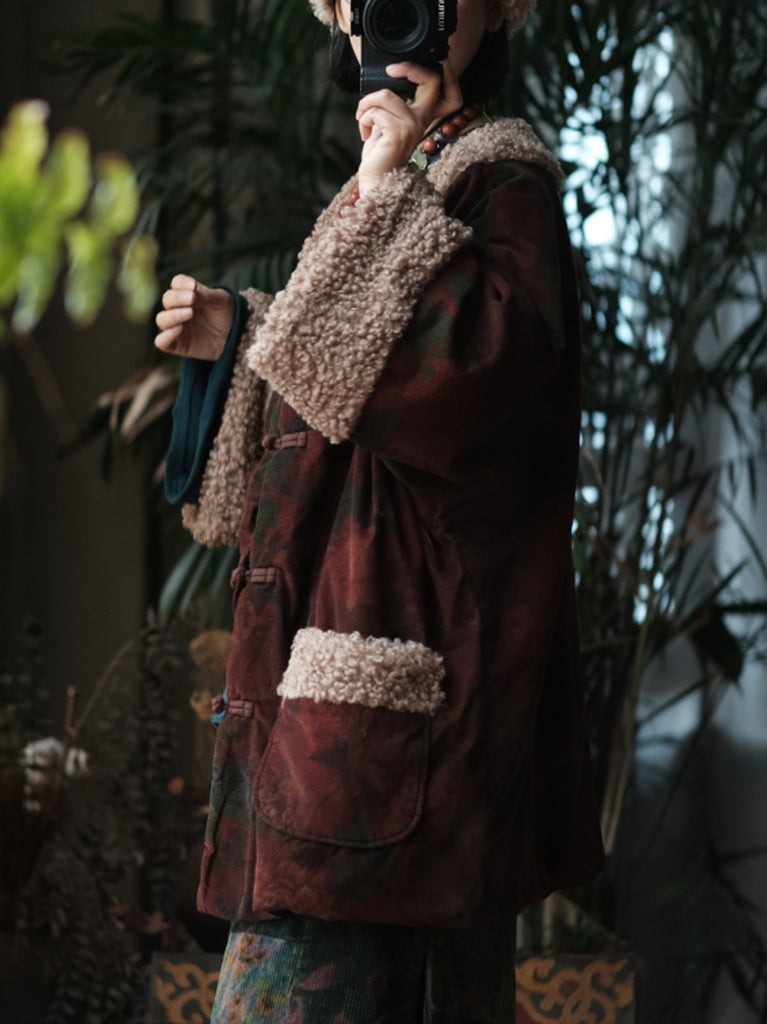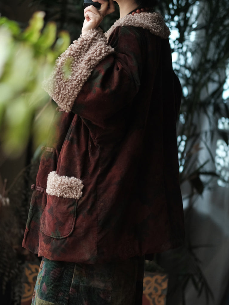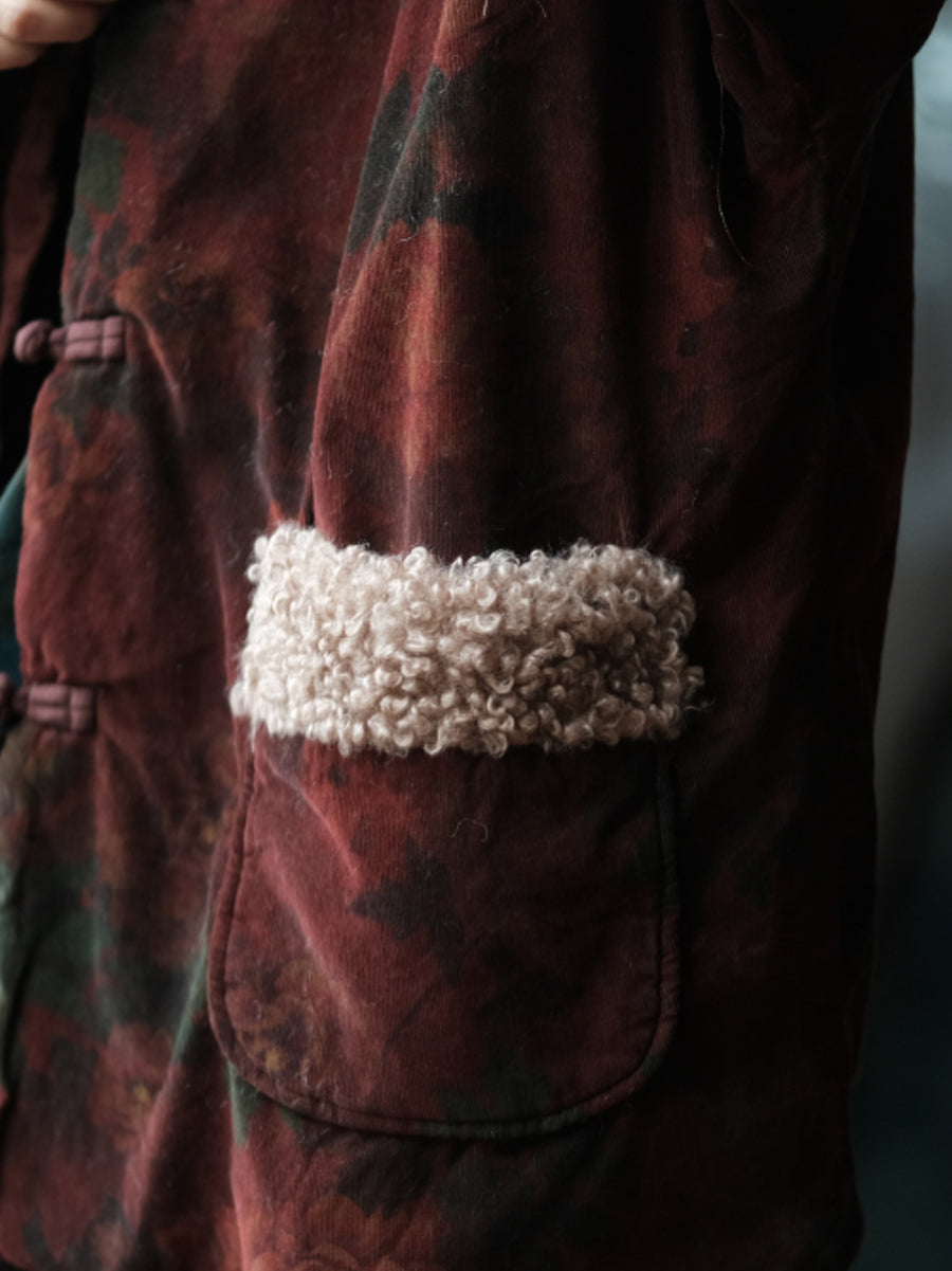 Casaco feminino de inverno com estampa floral, forrado em algodão e com gola redonda.