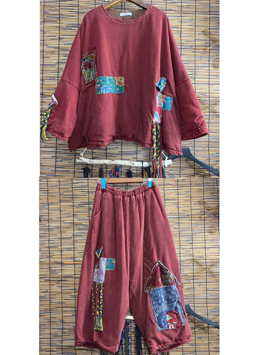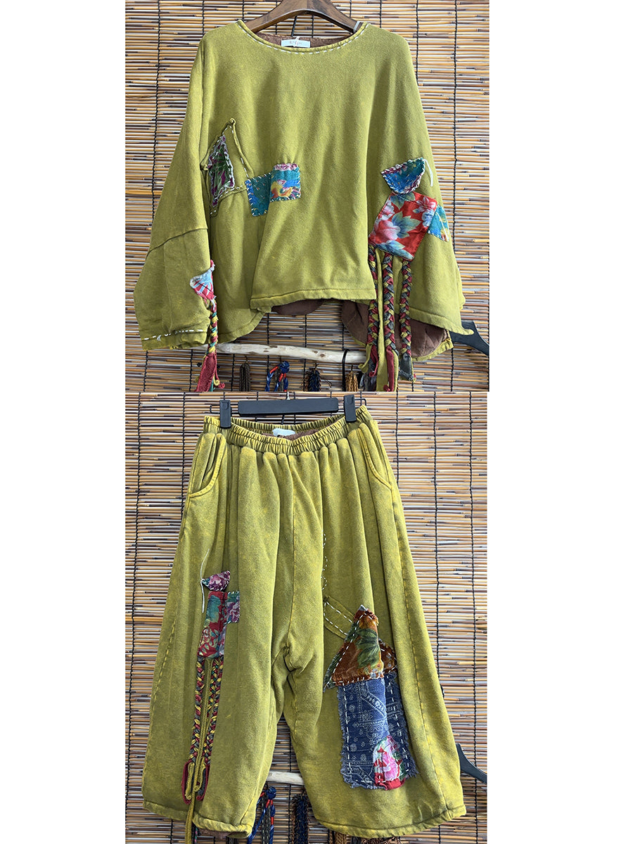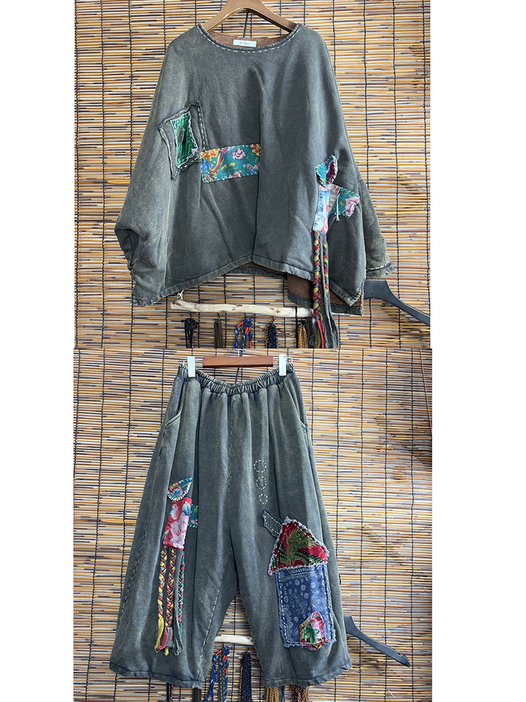 Conjunto feminino de inverno retrô com patchwork, gola redonda e franjas.