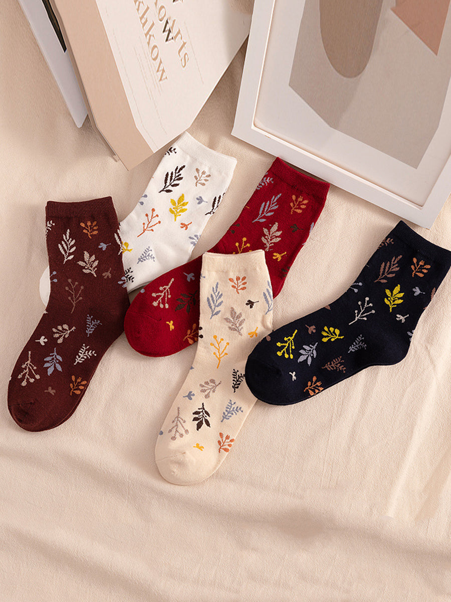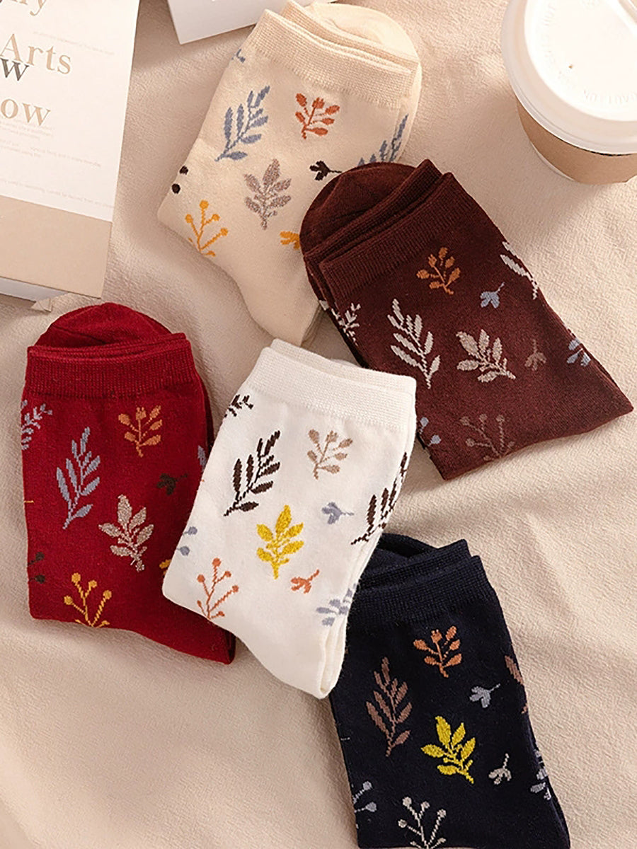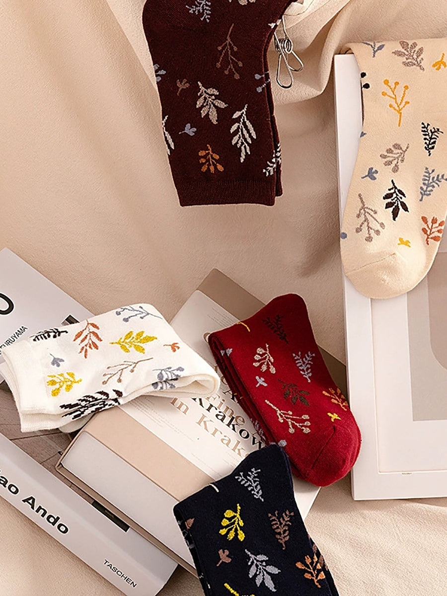 5 pares de meias femininas de algodão com estampa vintage de folhas.