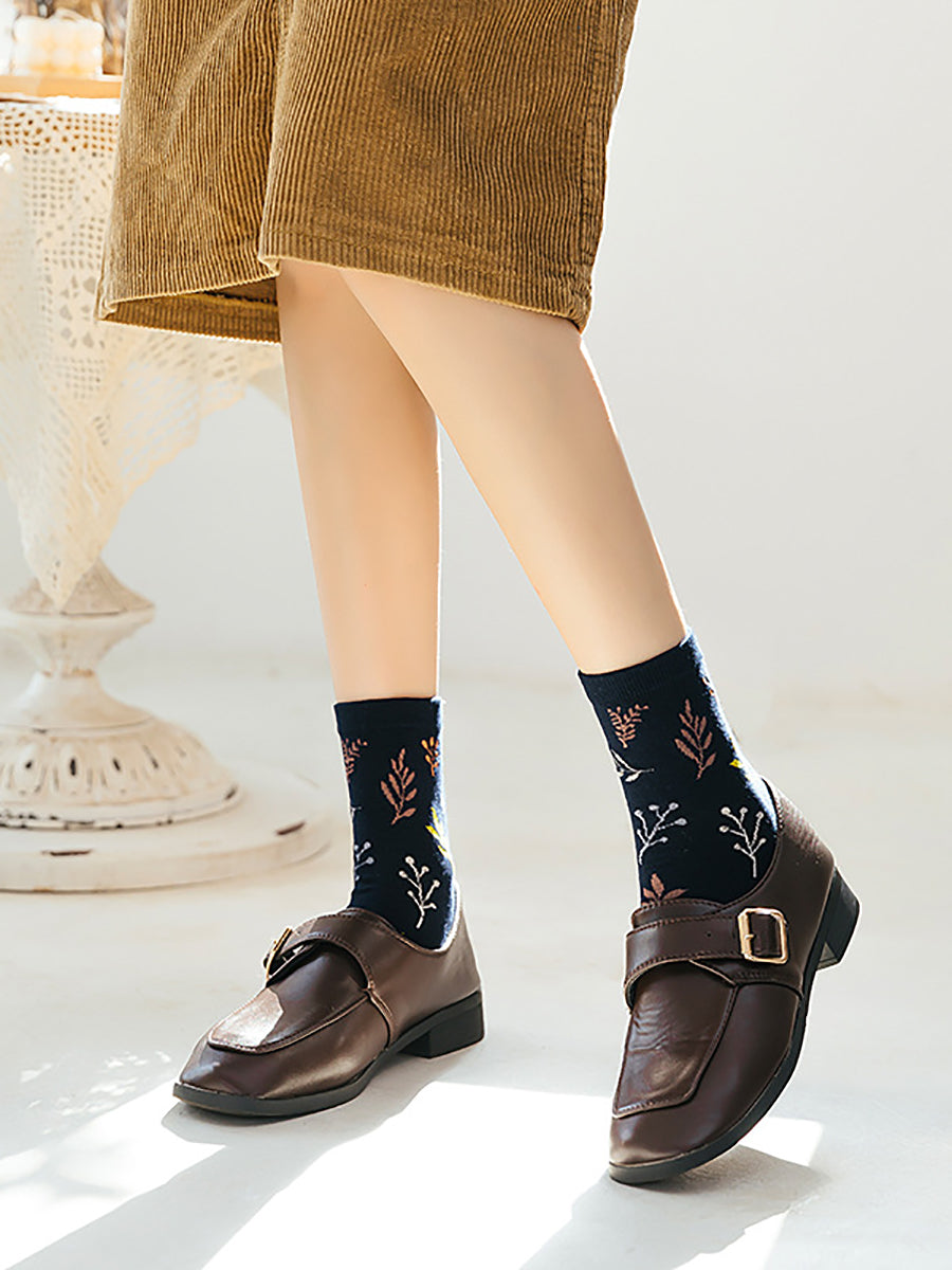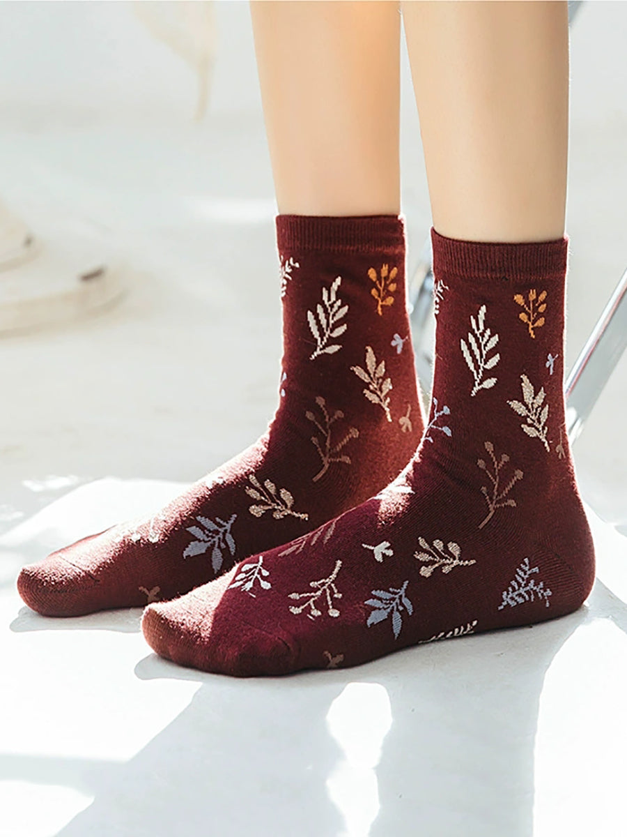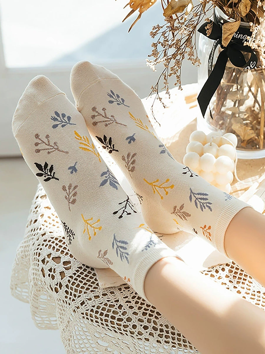 5 pares de meias femininas de algodão com estampa vintage de folhas.