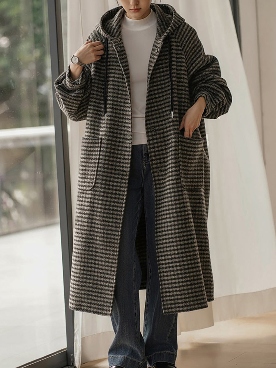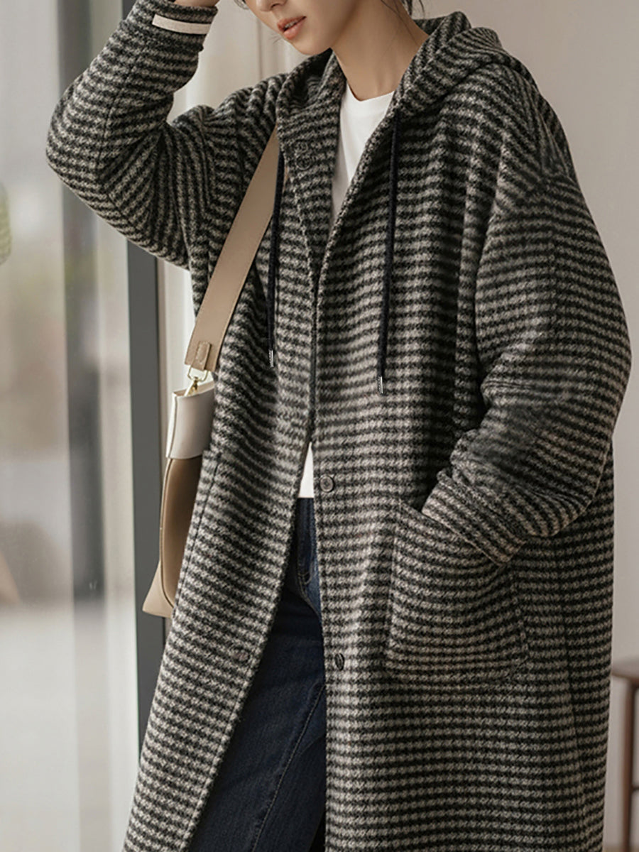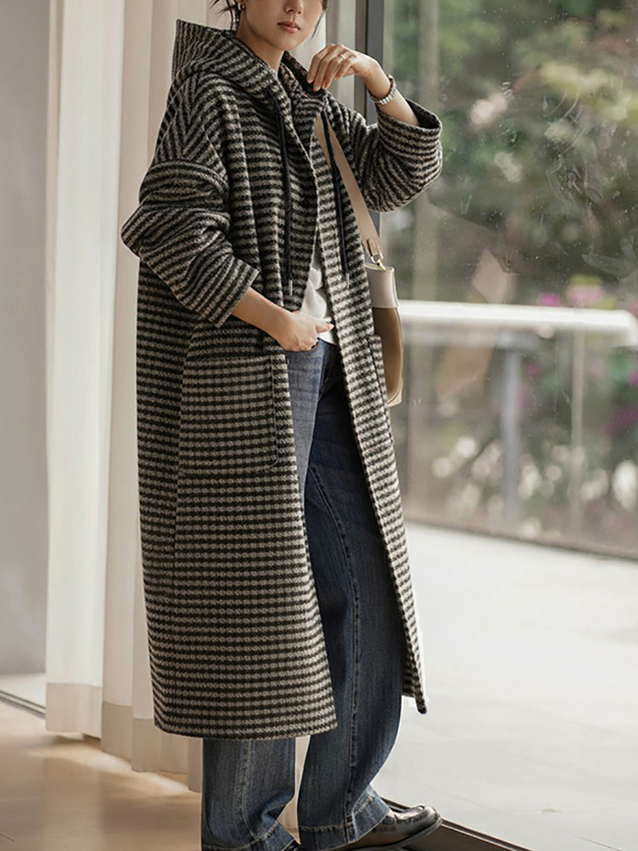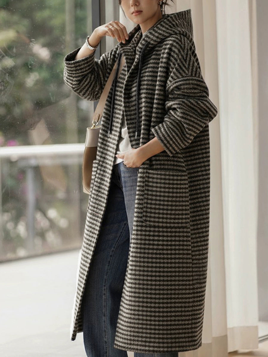 Casaco feminino vintage de inverno com listras e capuz