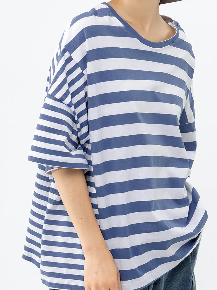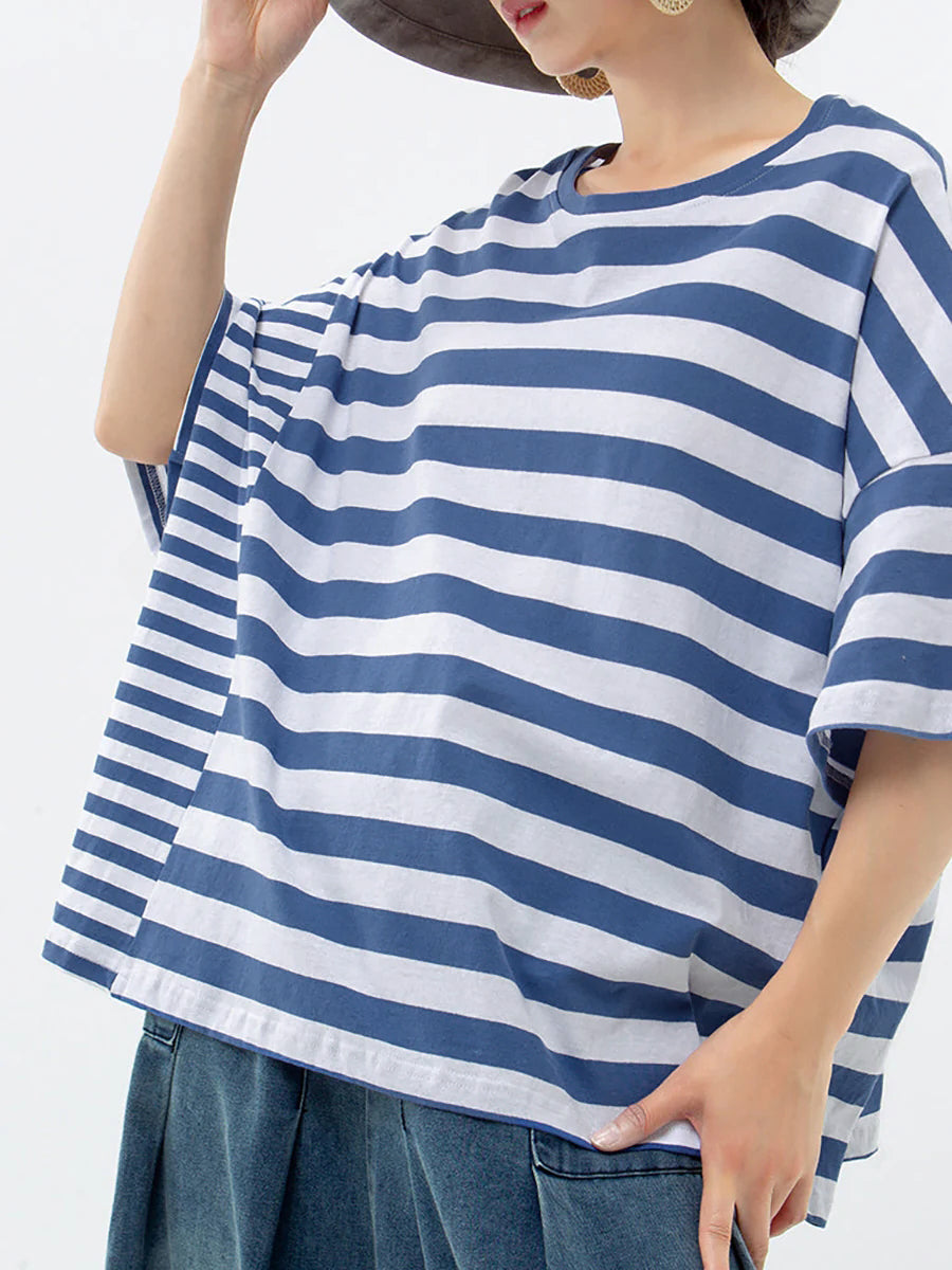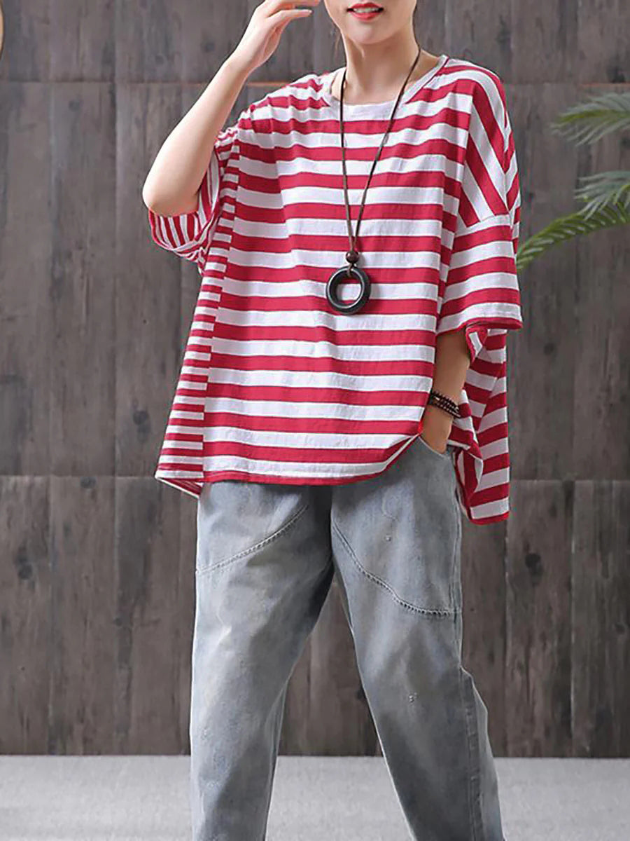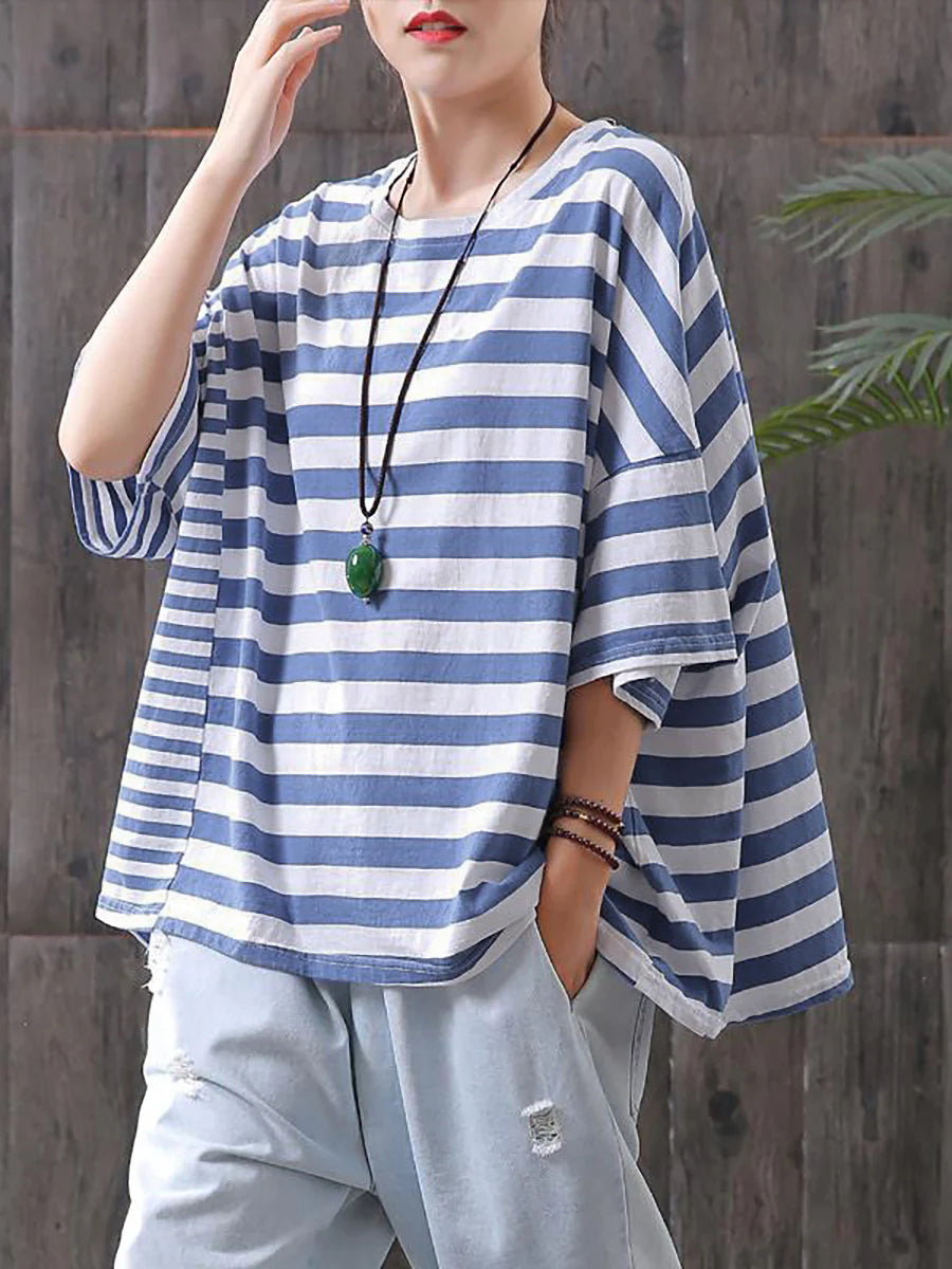 Plus Size – Camiseta casual listrada 100% algodão Buykud