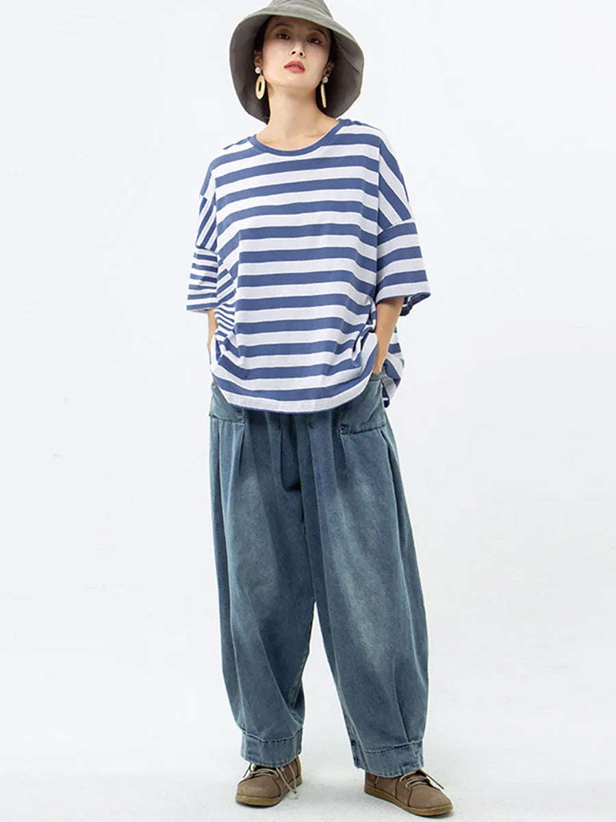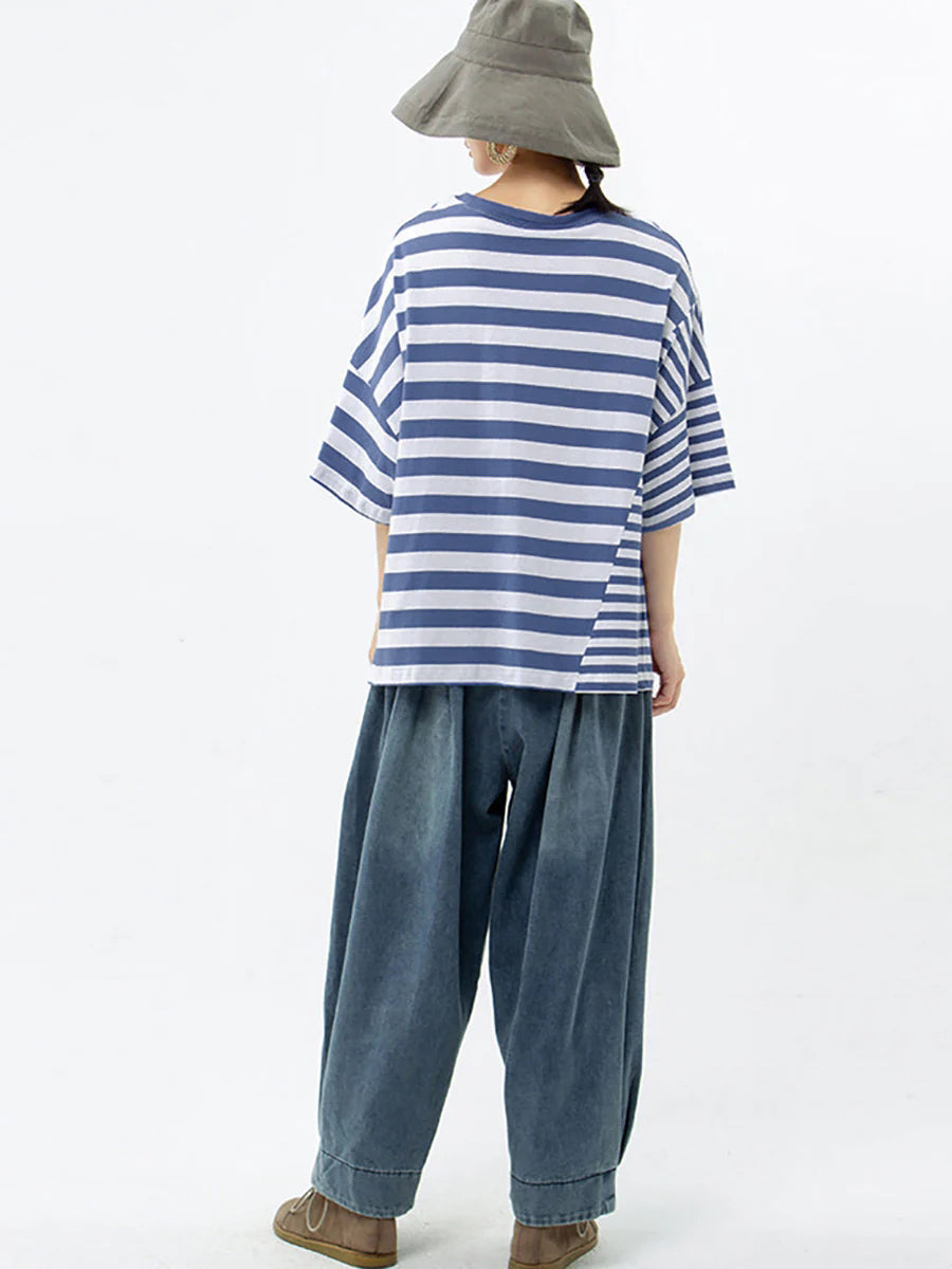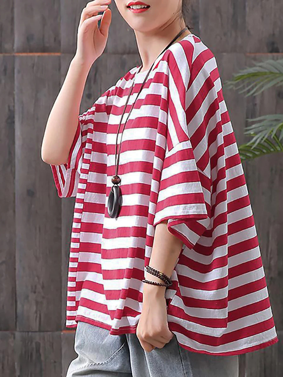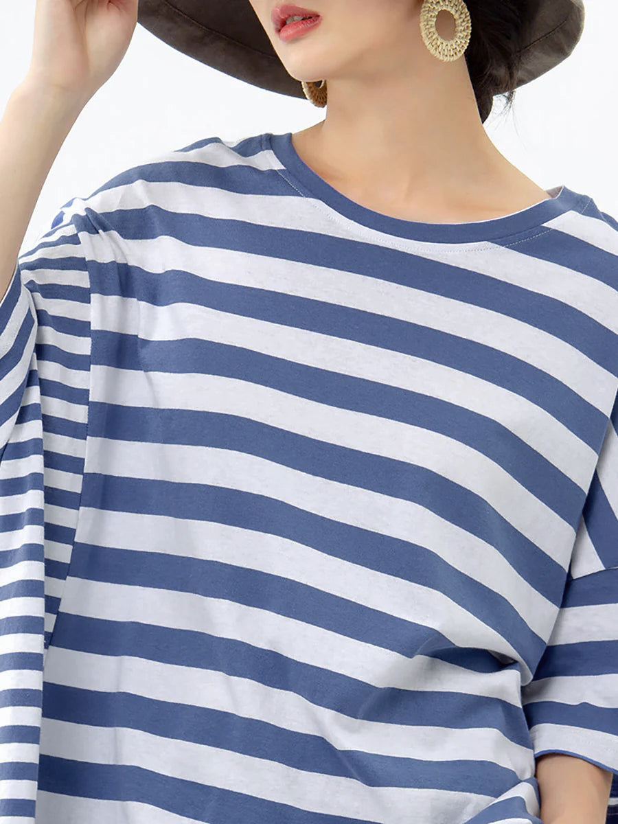 Plus Size – Camiseta casual listrada 100% algodão Buykud