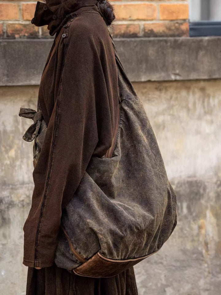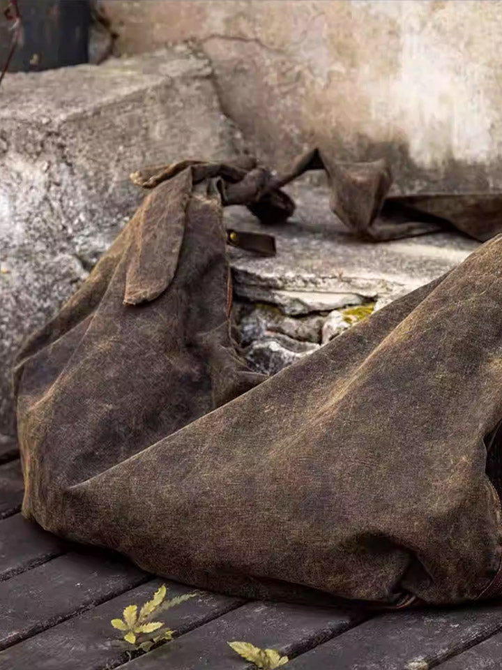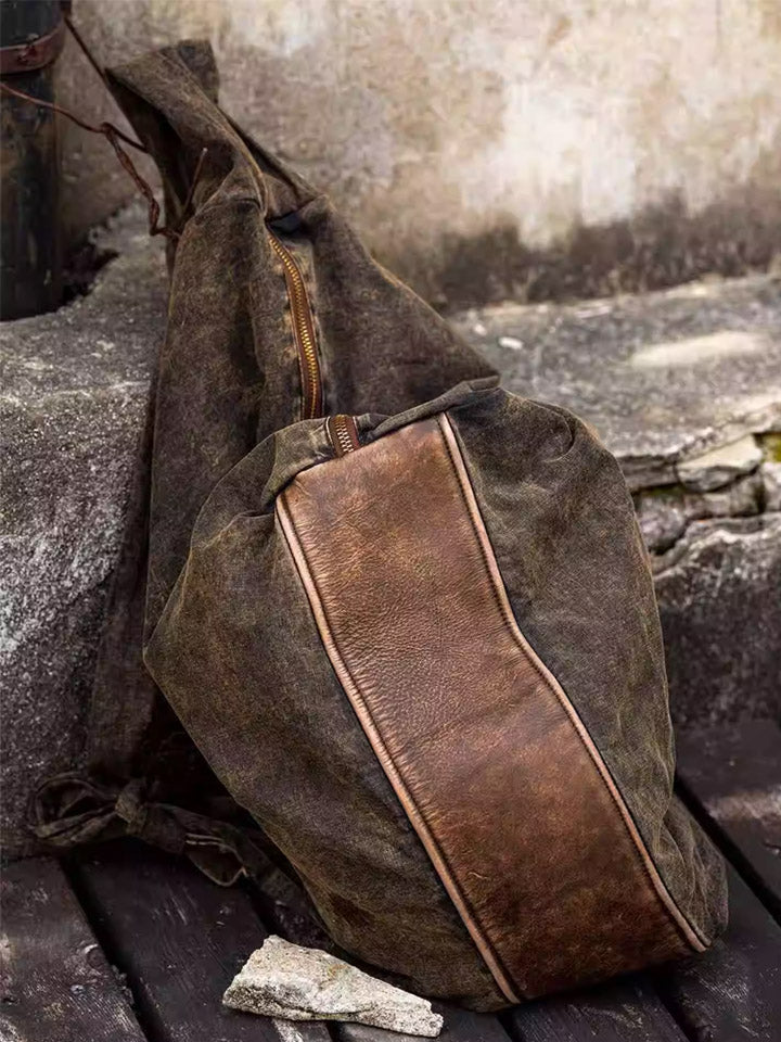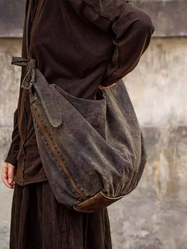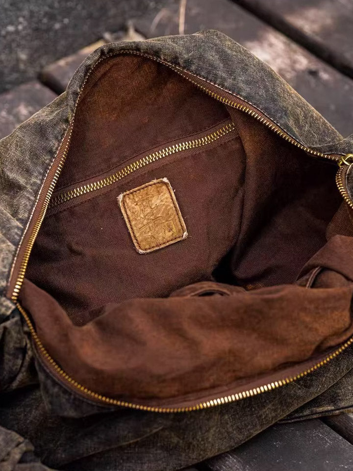 041203 Bolsa Transversal Vintage em Couro com Detalhes em Algodão e Linho