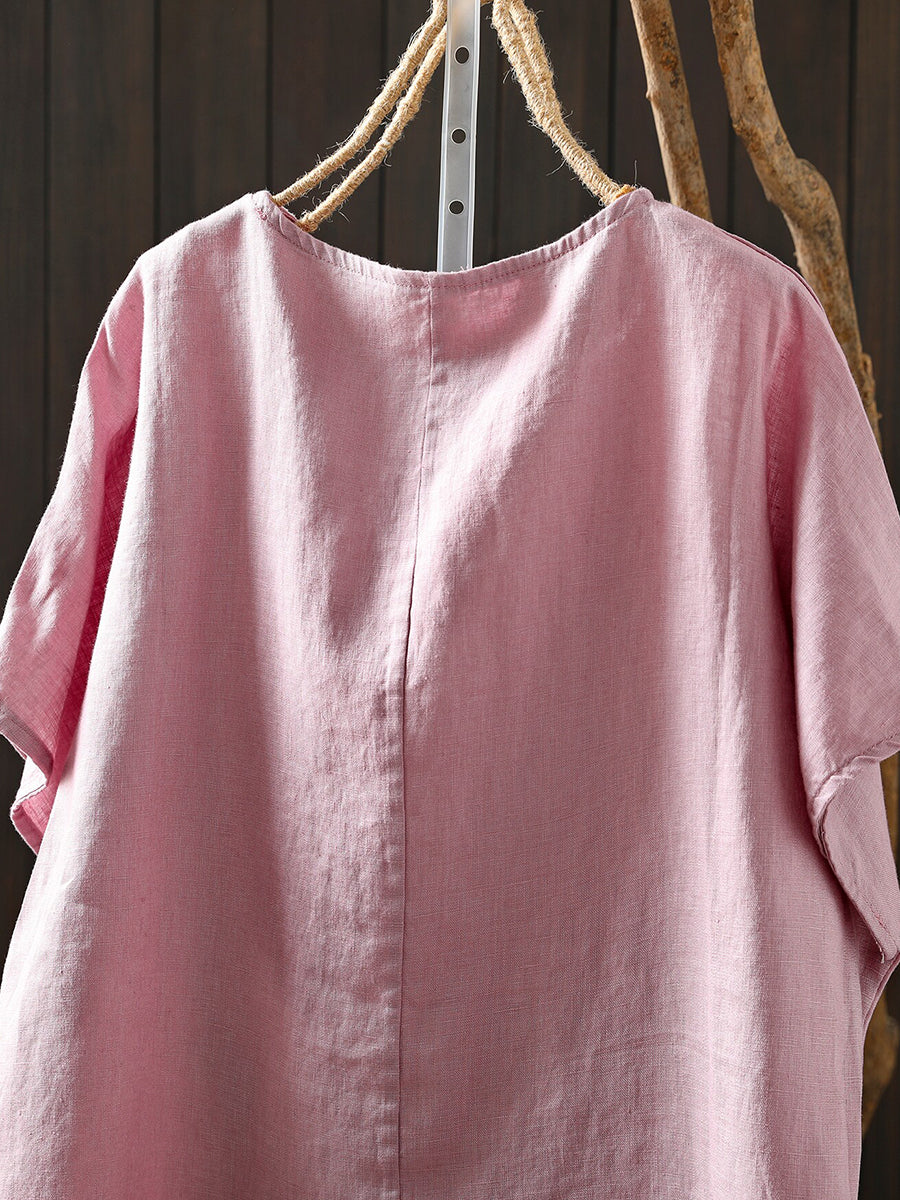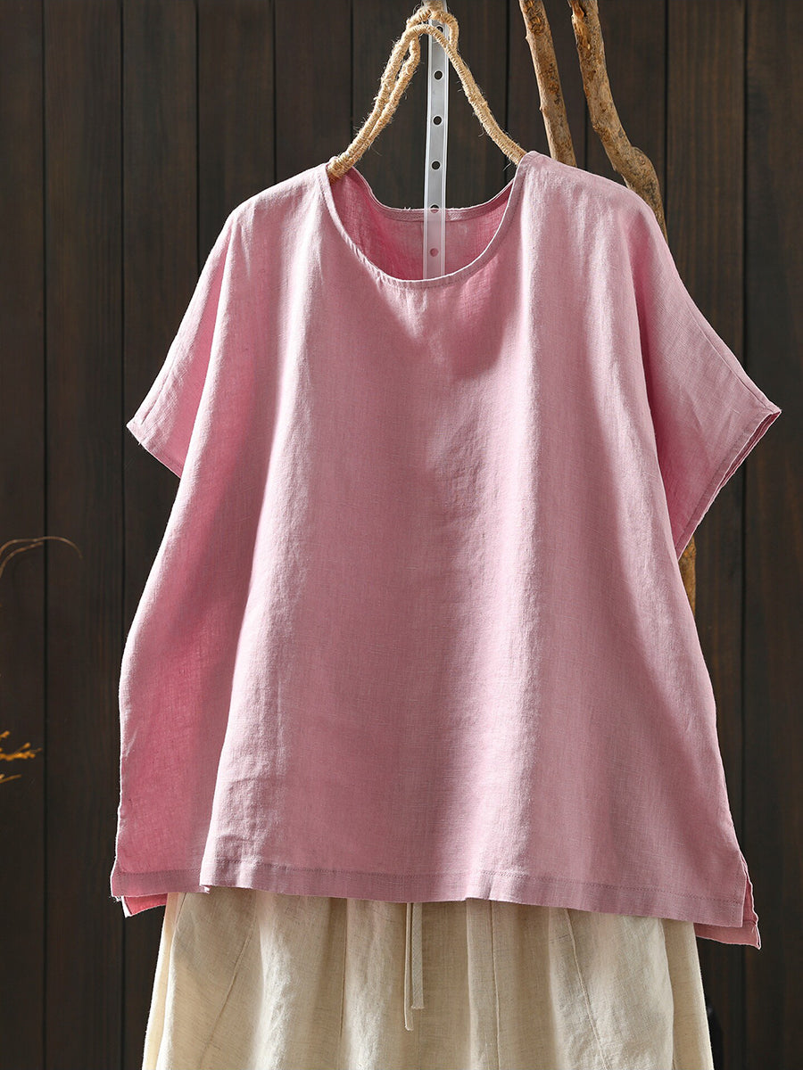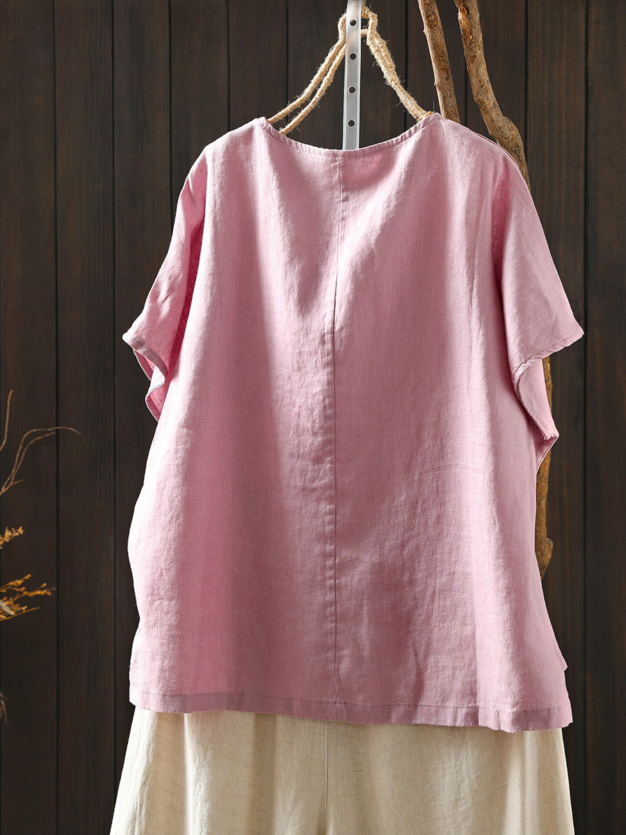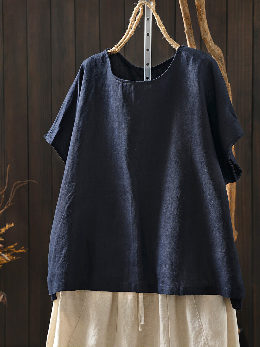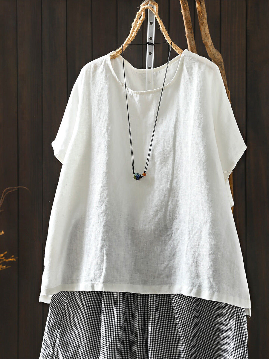 Camiseta feminina de verão com estampa artística, cor lisa, gola redonda, 100% linho.