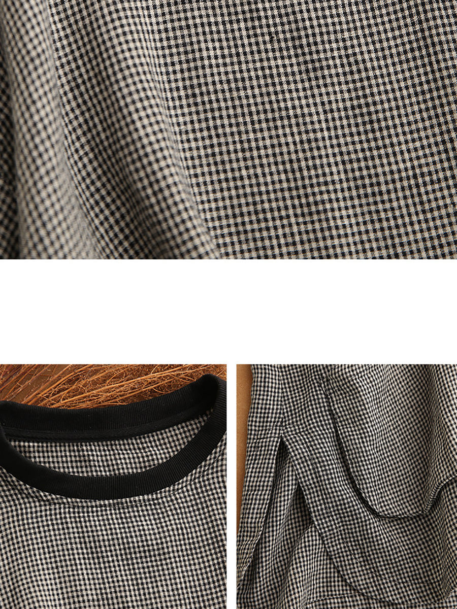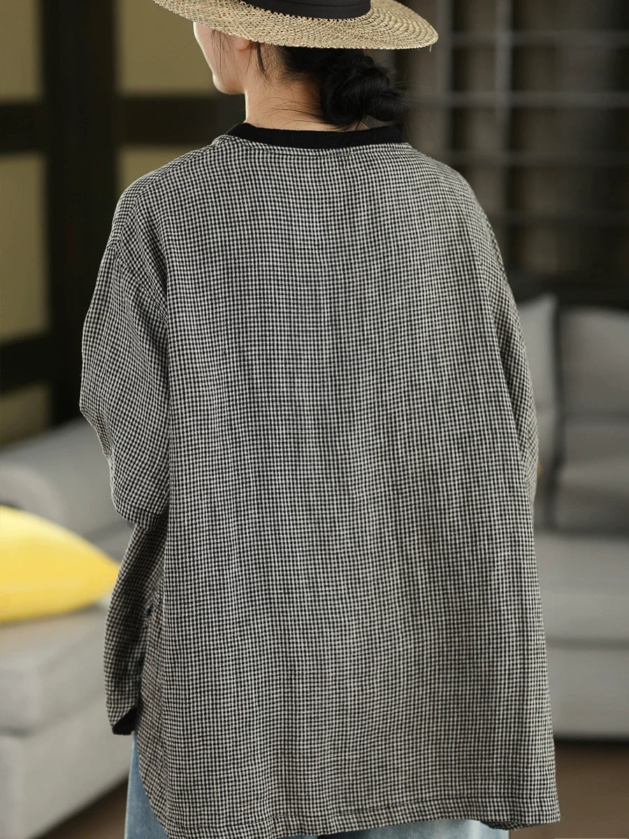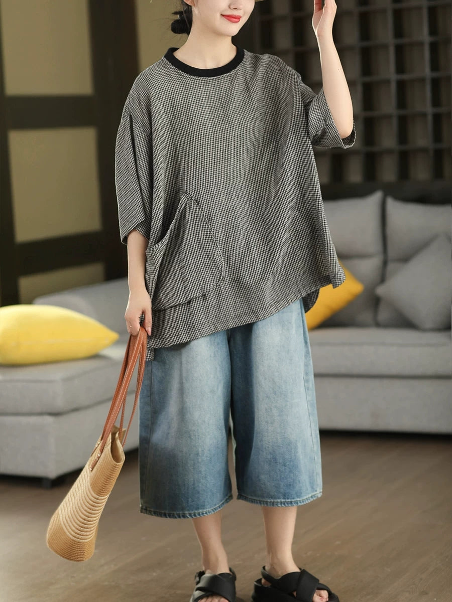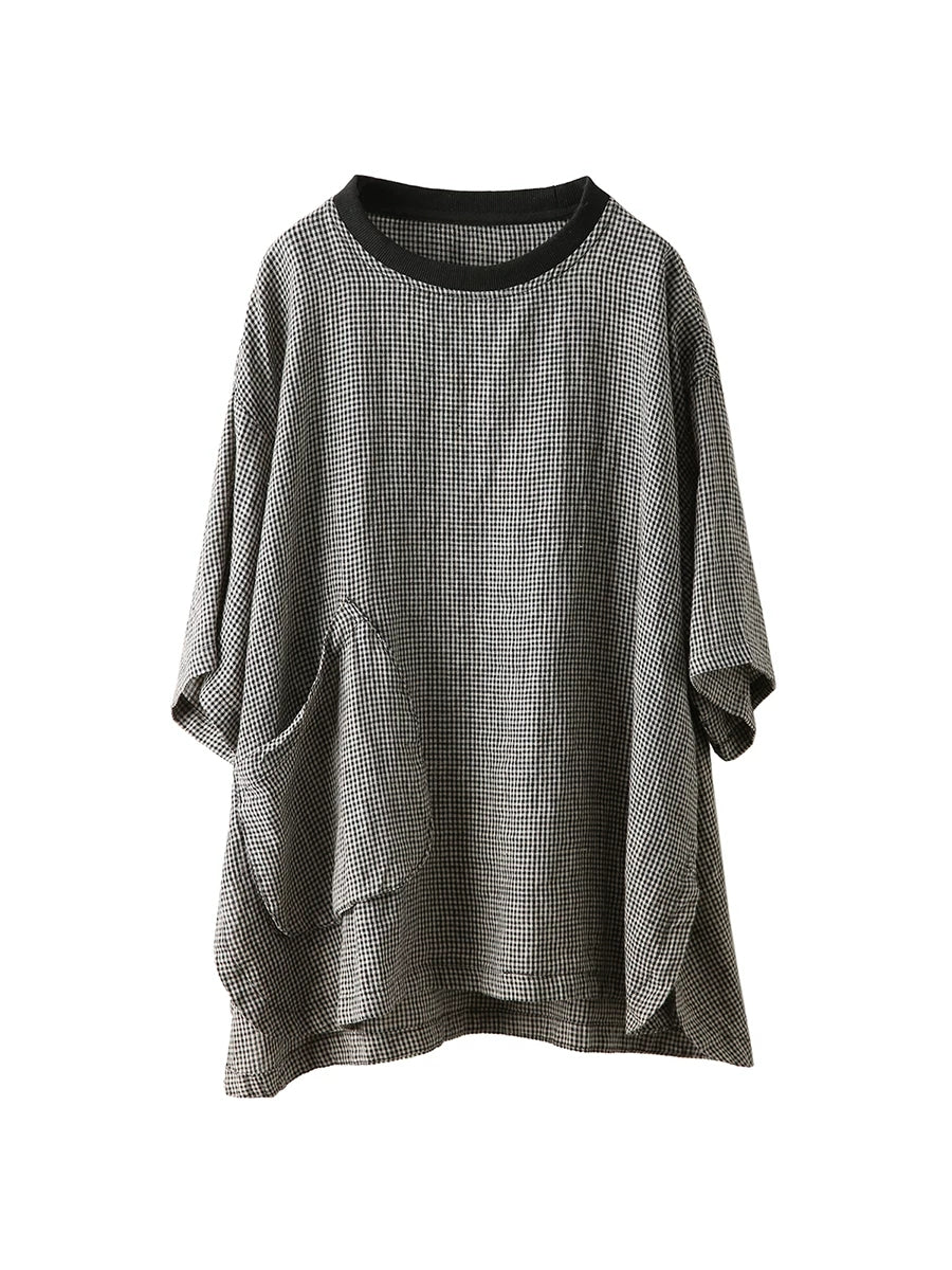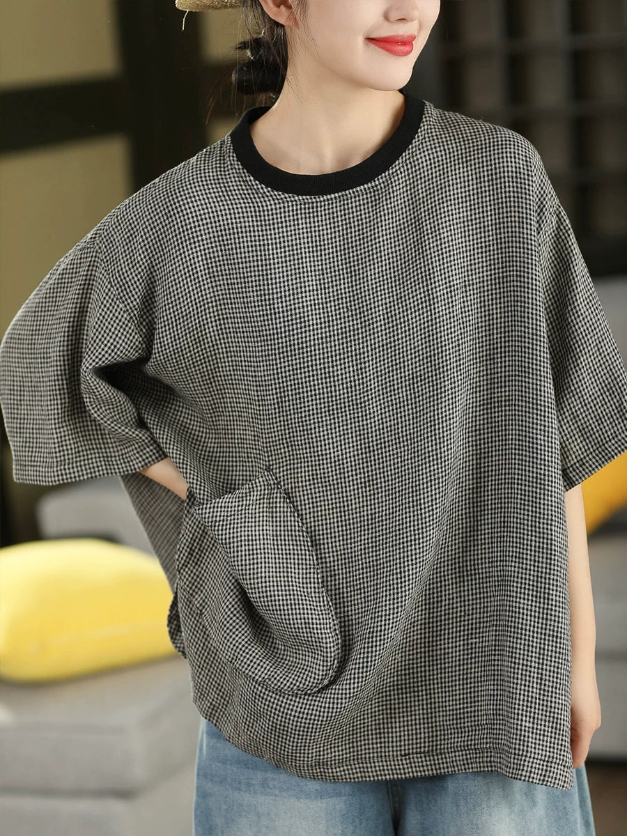 Camiseta feminina de verão retrô xadrez com gola redonda, 100% linho.