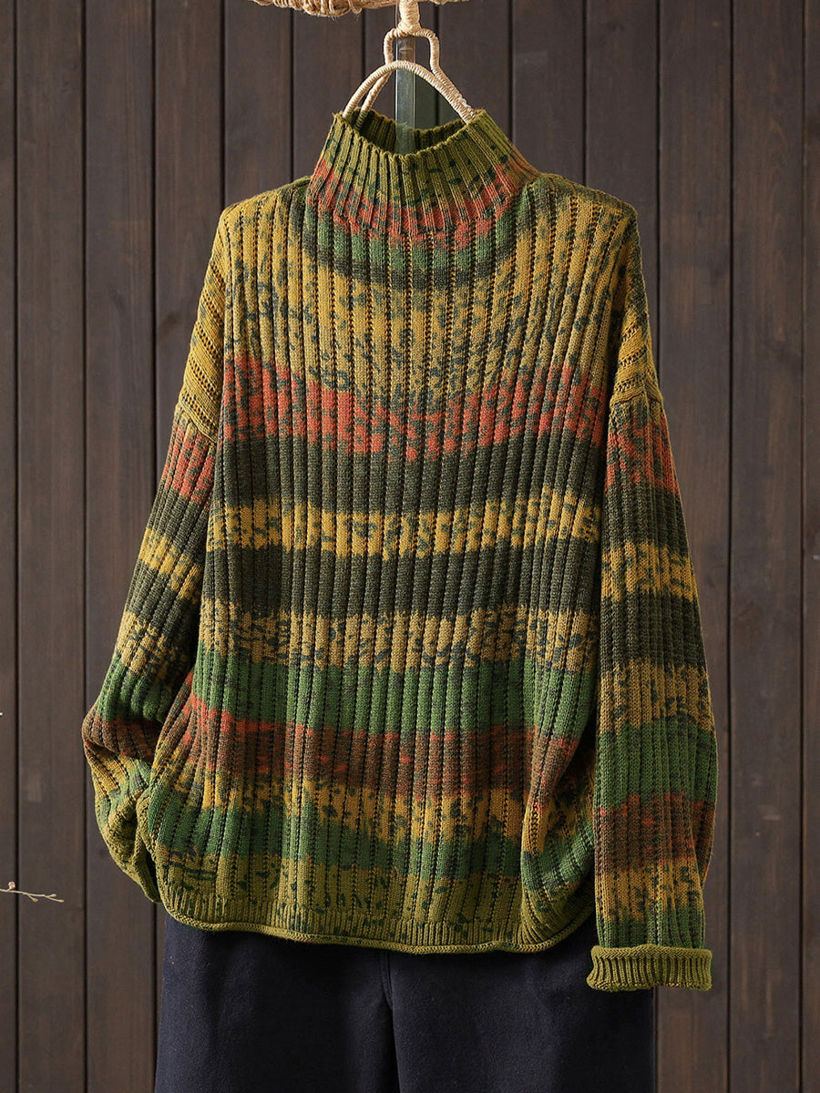Suéter feminino de gola alta com listras coloridas e blocos de outono