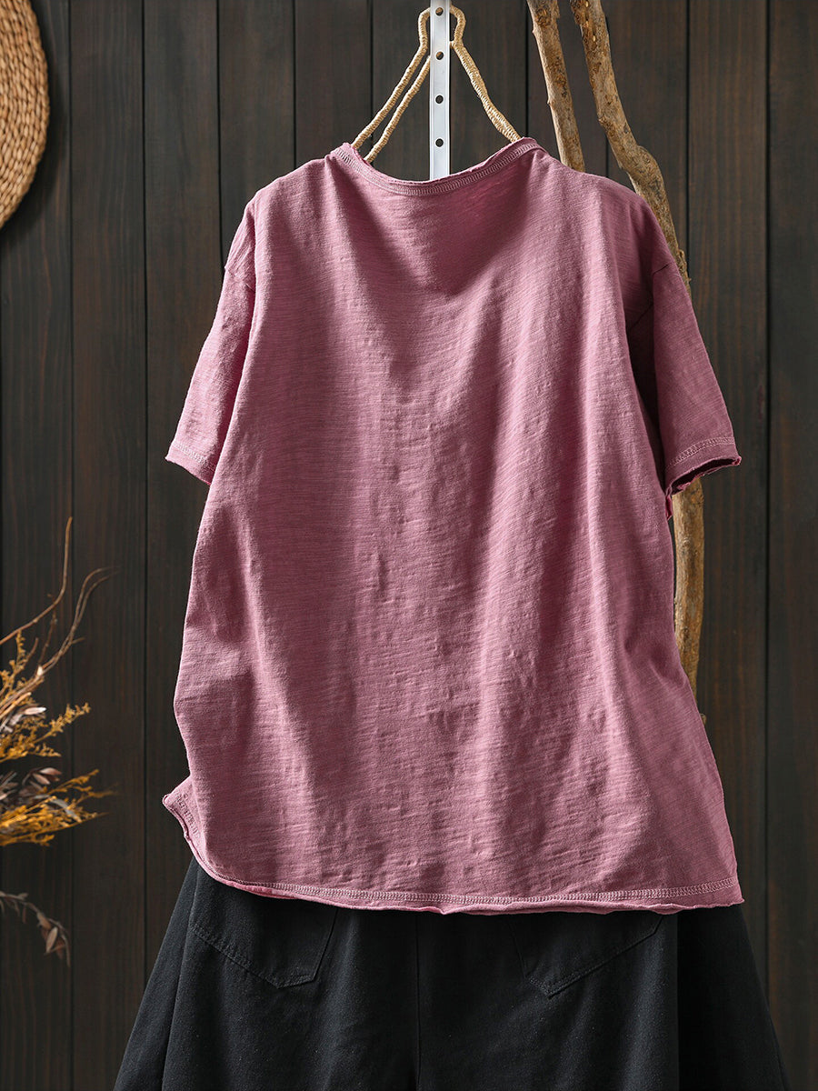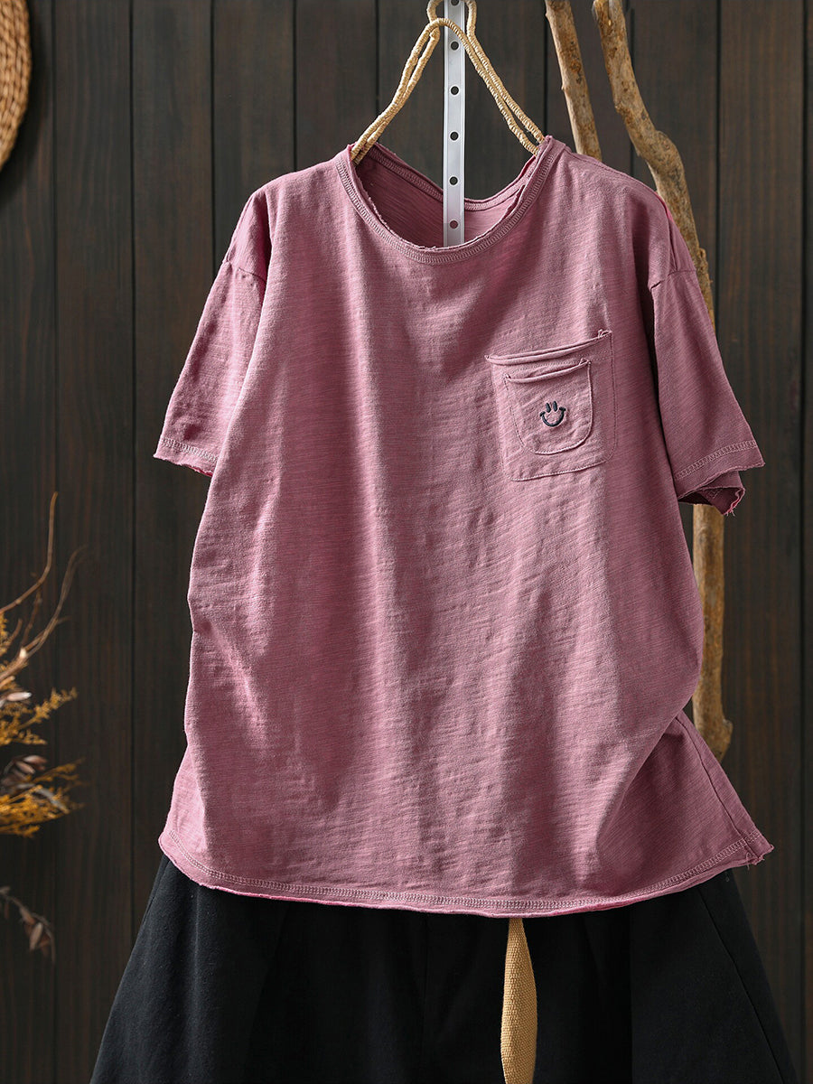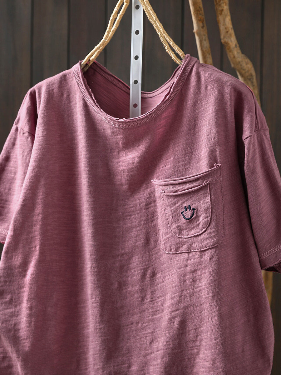 Camisa feminina de verão com estampa artística de sorriso e gola redonda, 100% algodão.