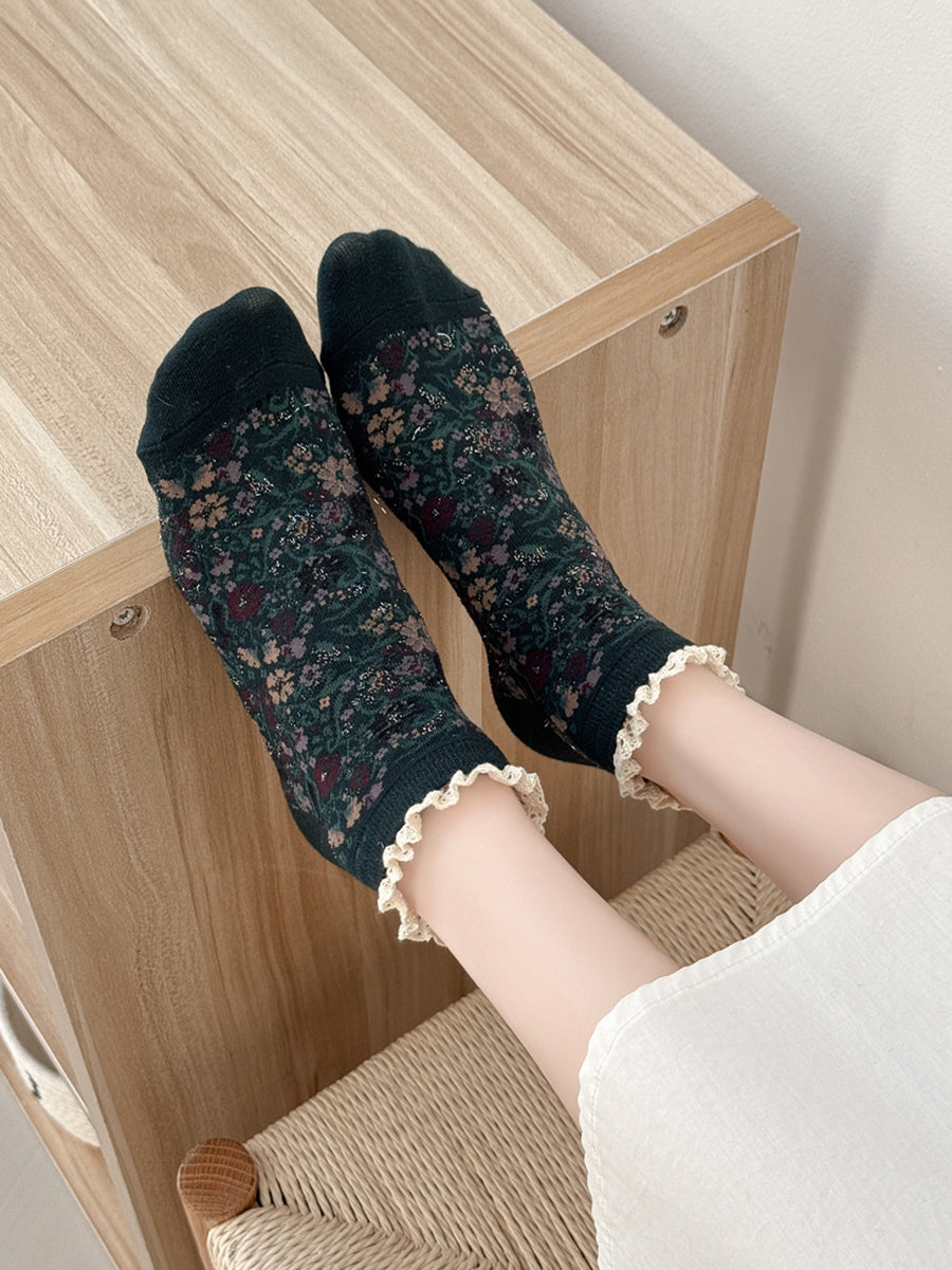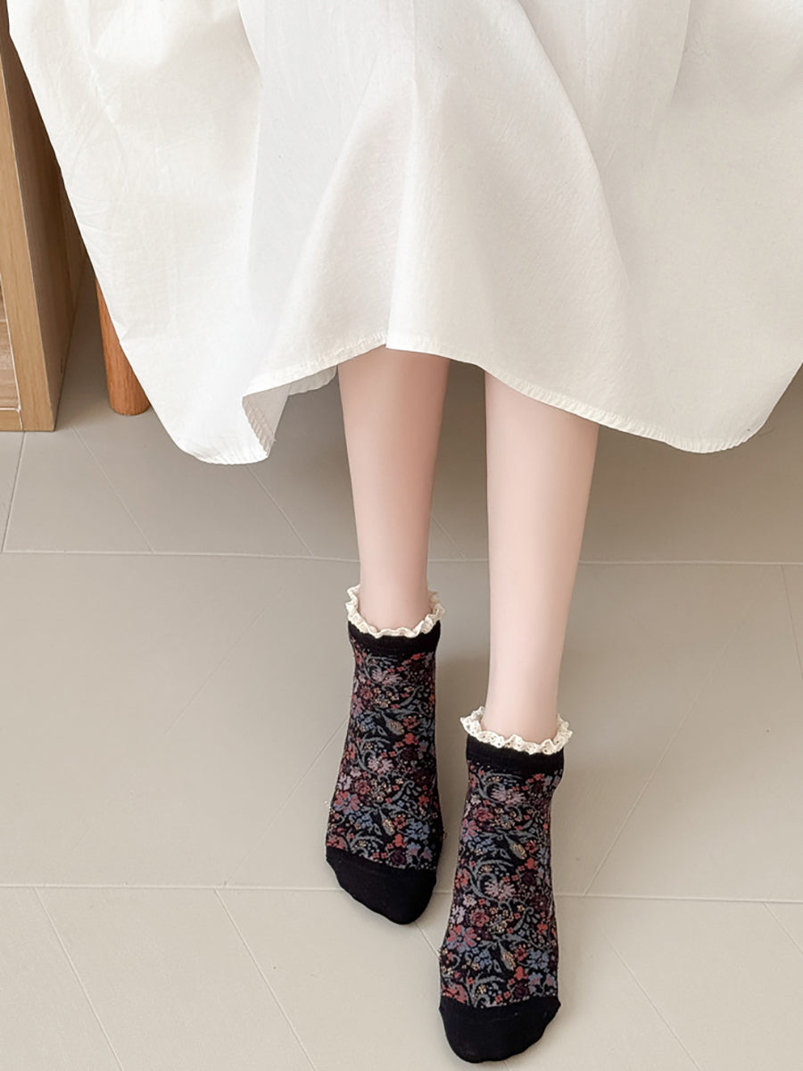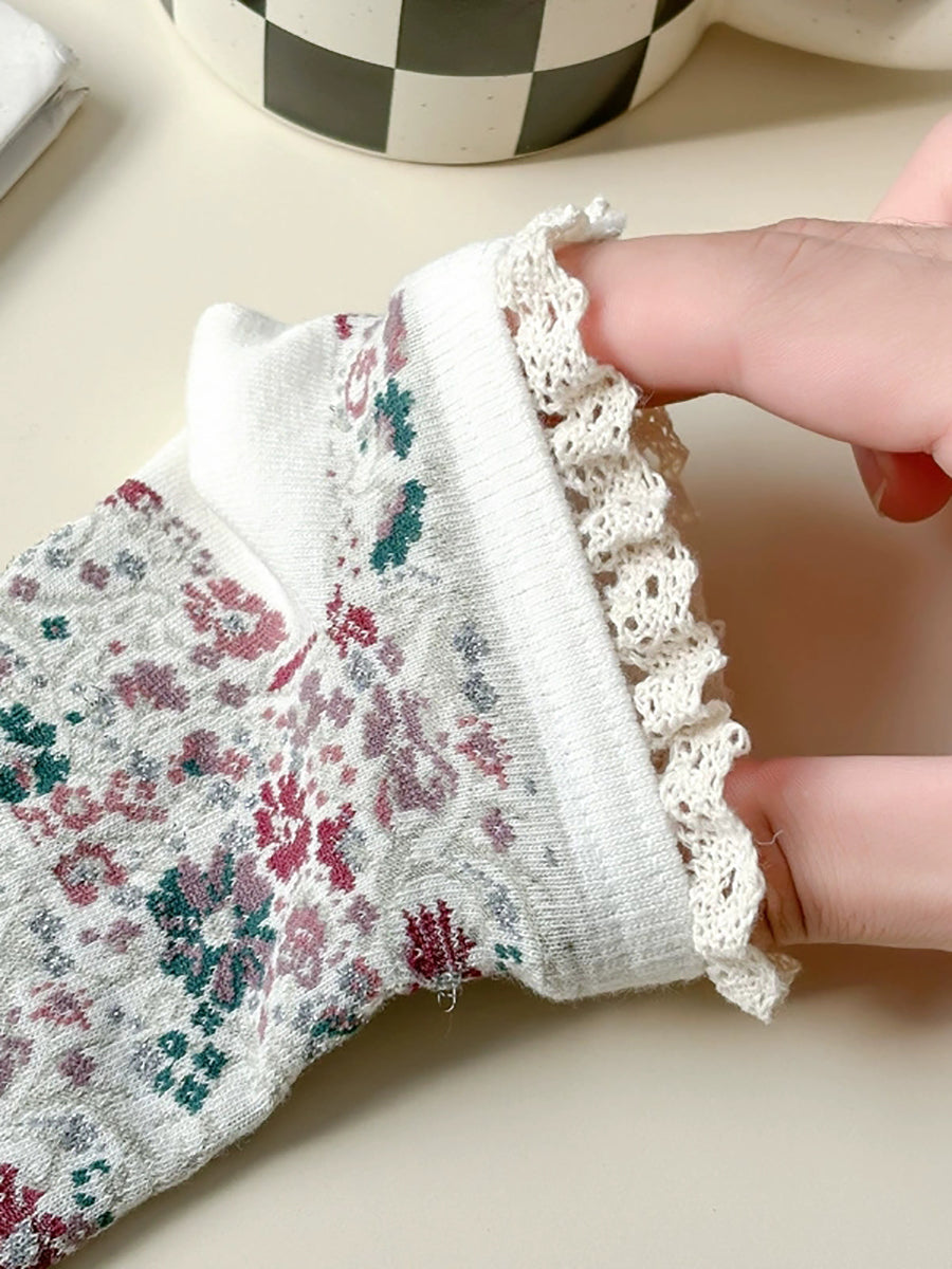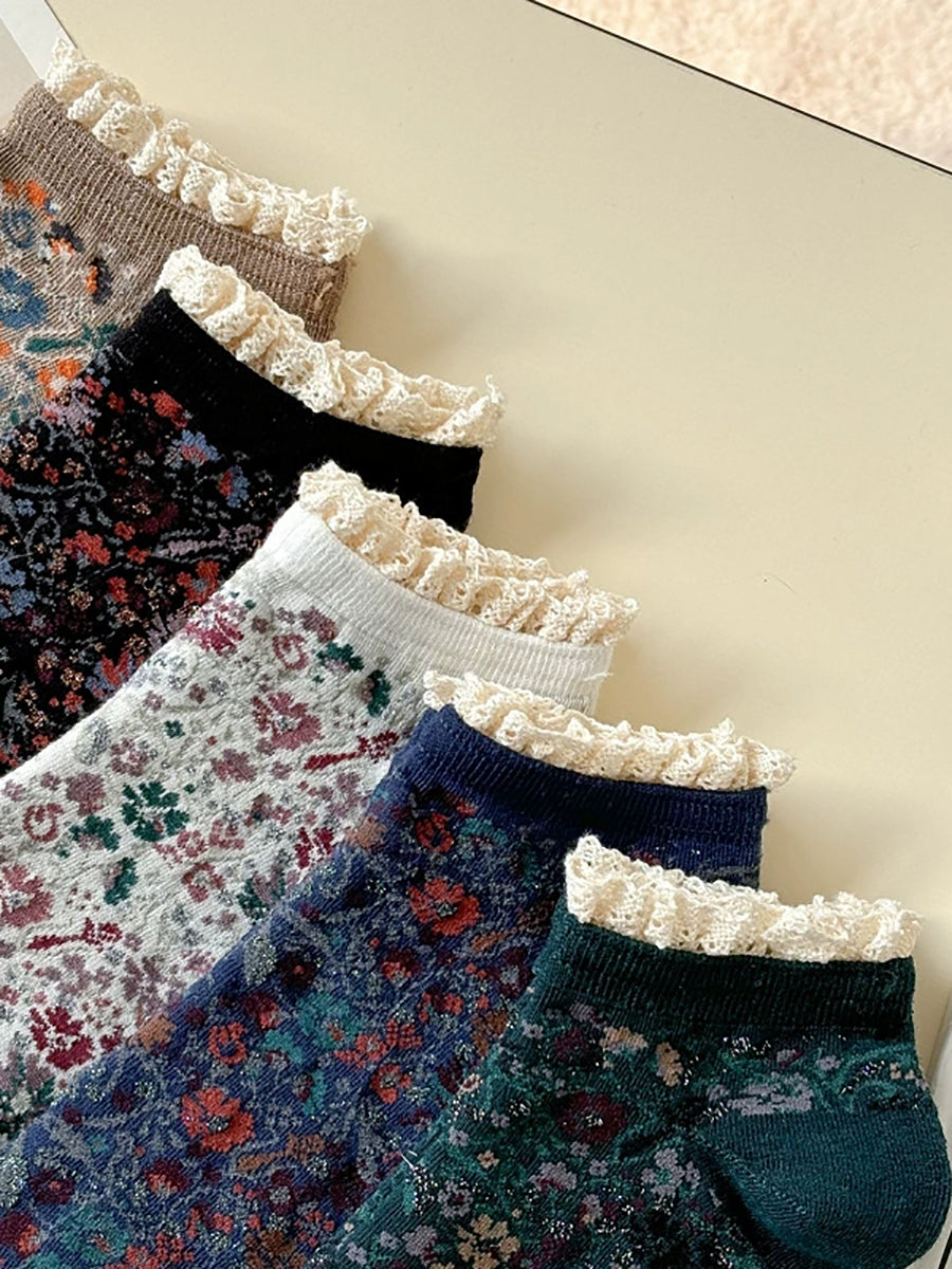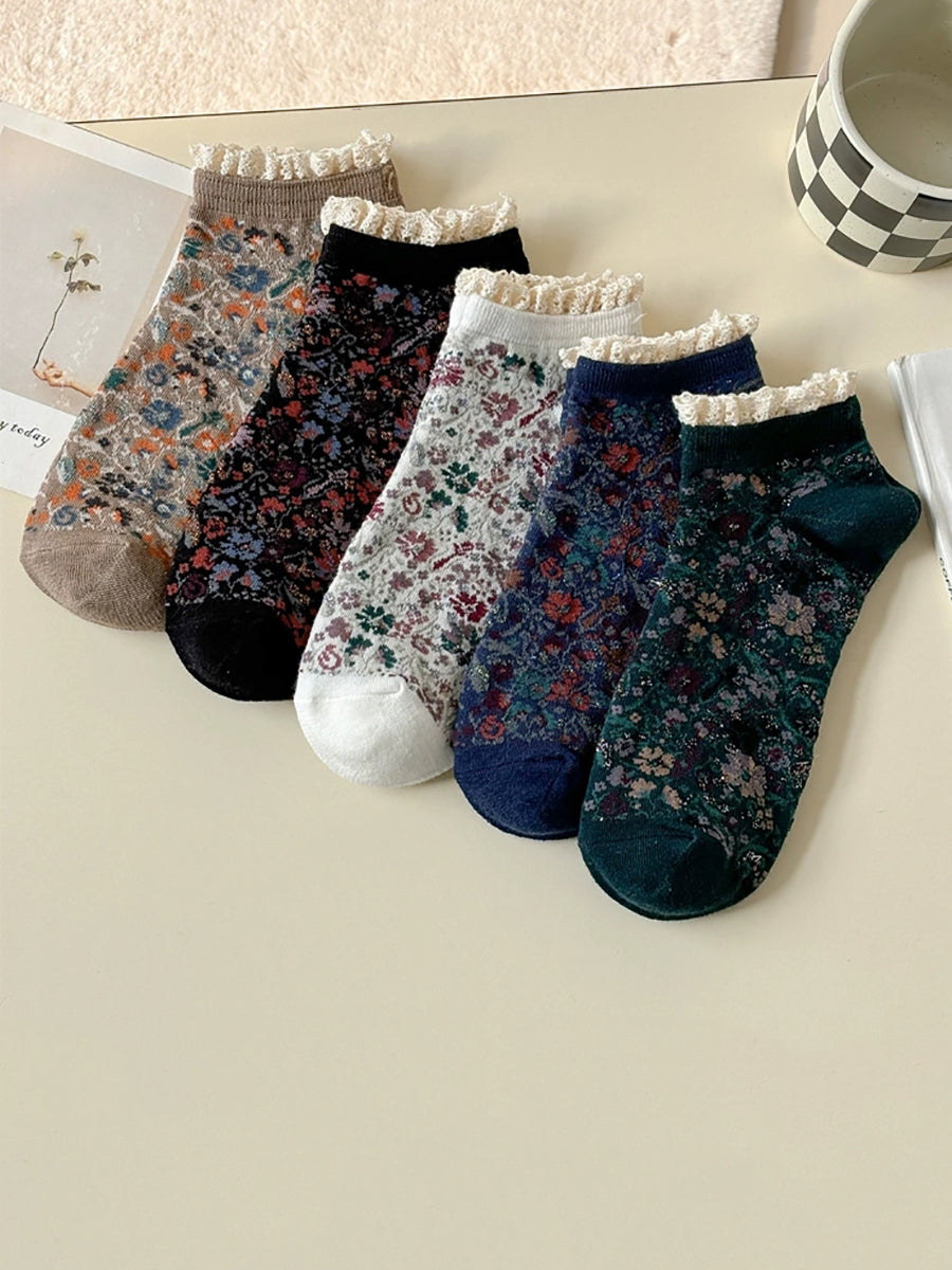 5 pares de meias femininas artísticas com detalhes florais em renda.