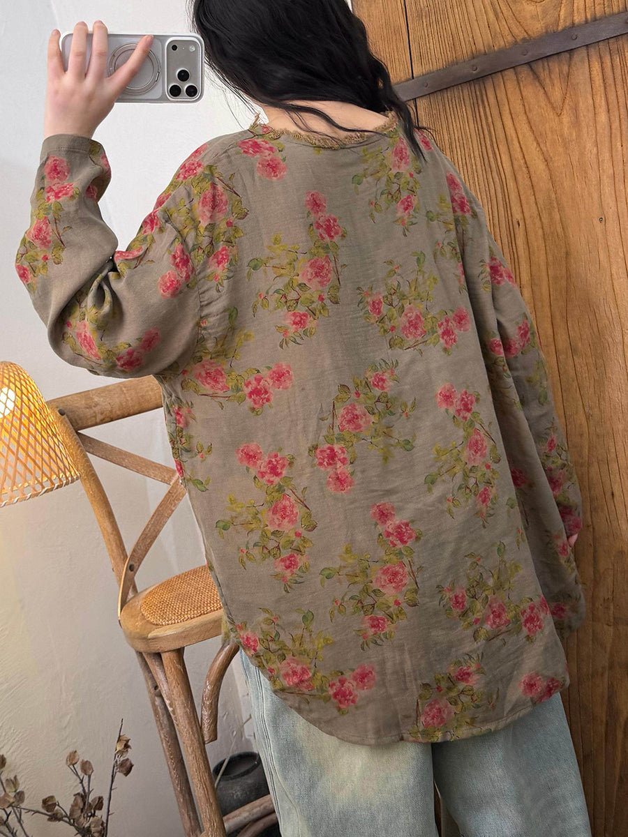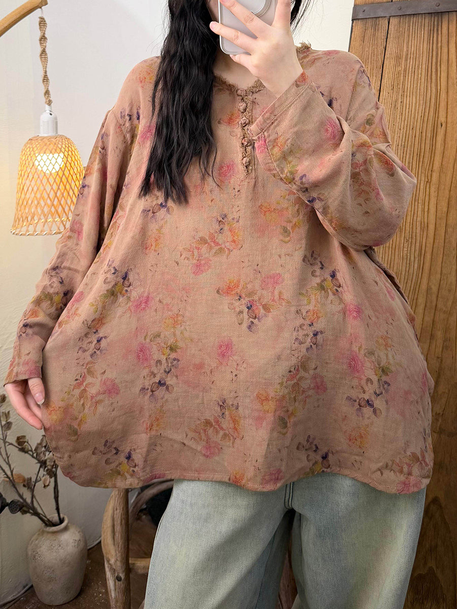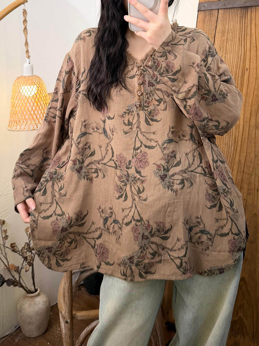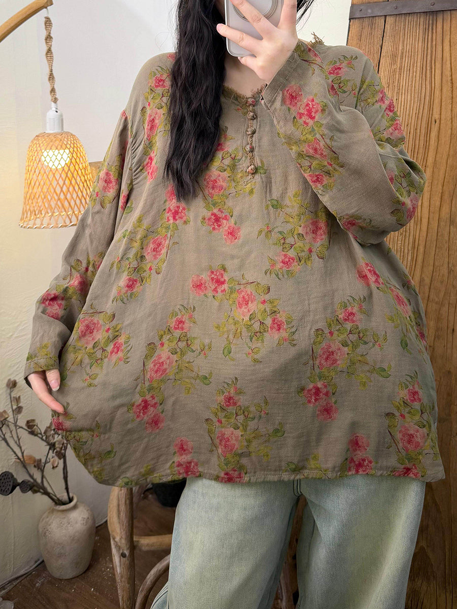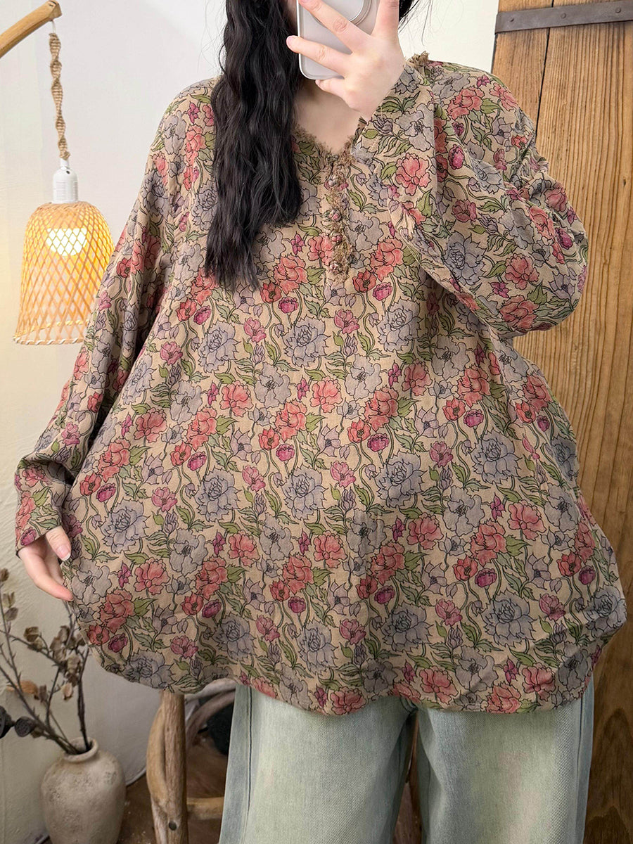 Blusa feminina retrô de algodão com decote em V e estampa floral para a primavera