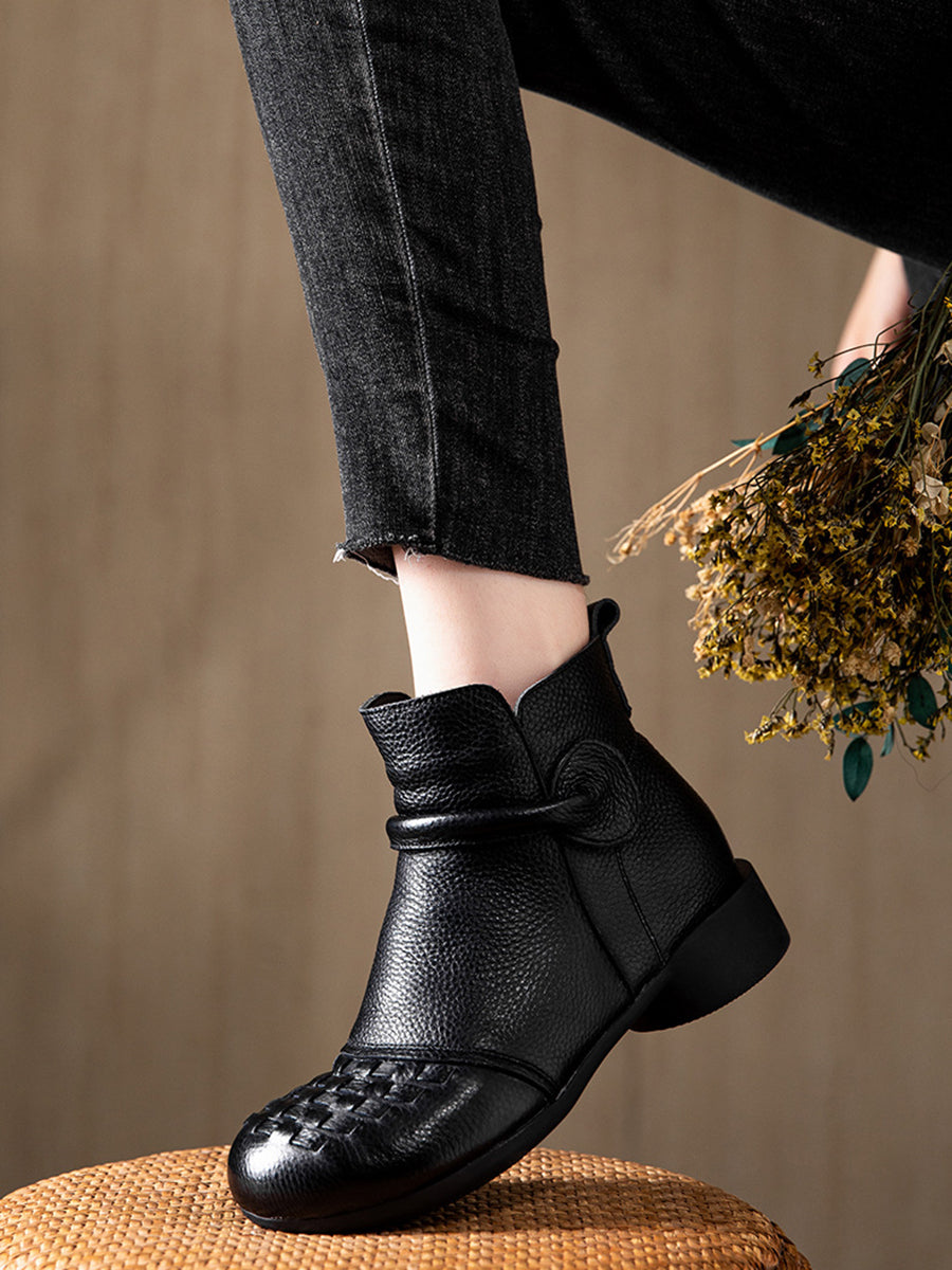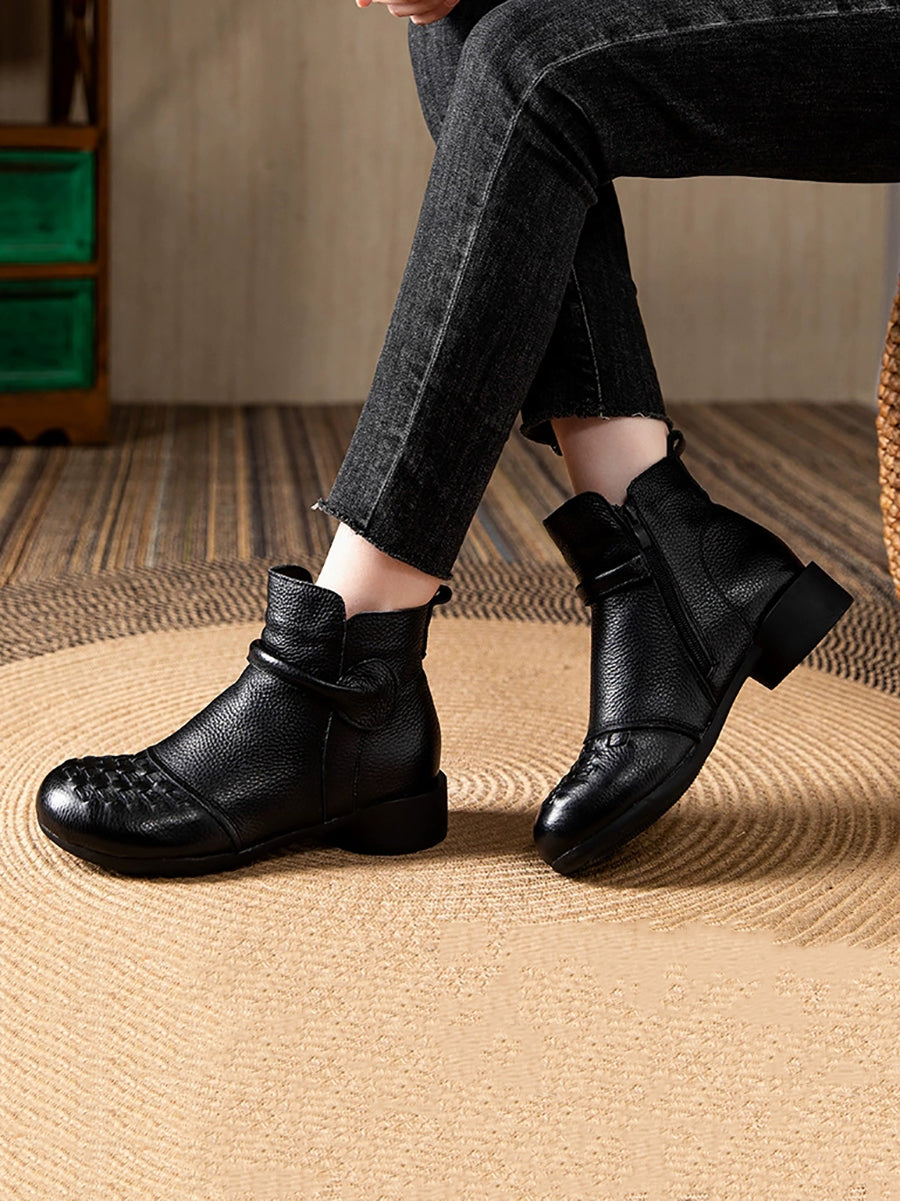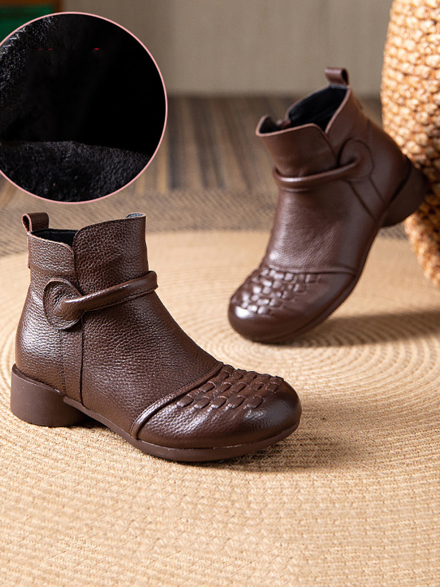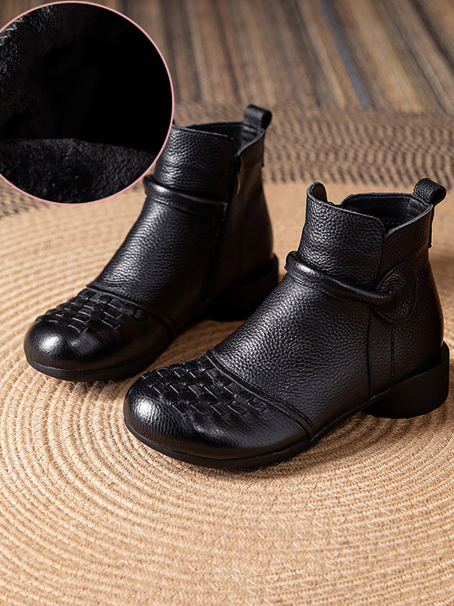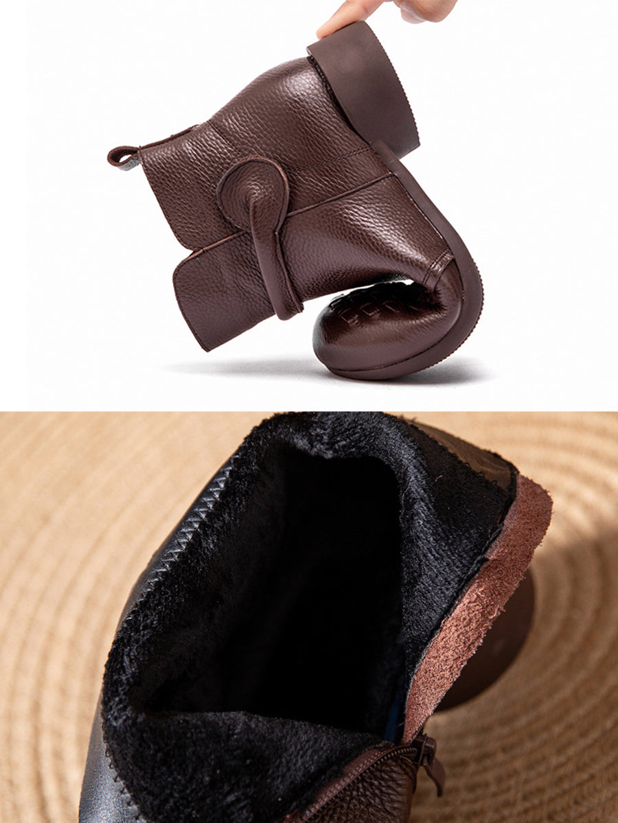 Botas femininas de inverno de couro legítimo com forro de lã e salto baixo.