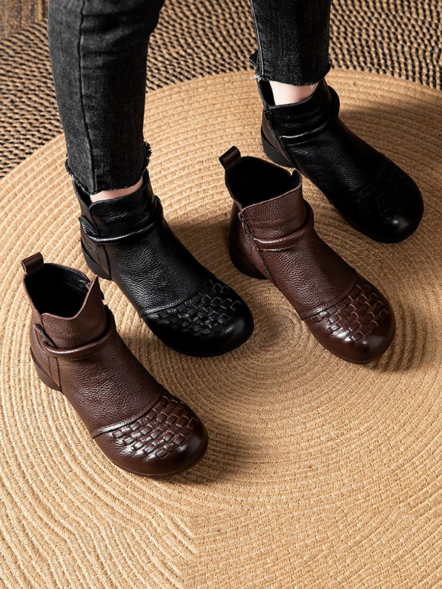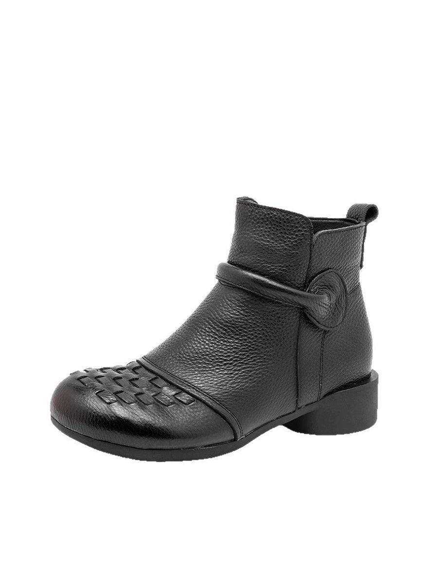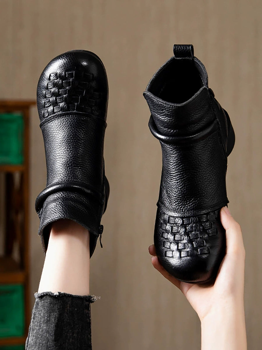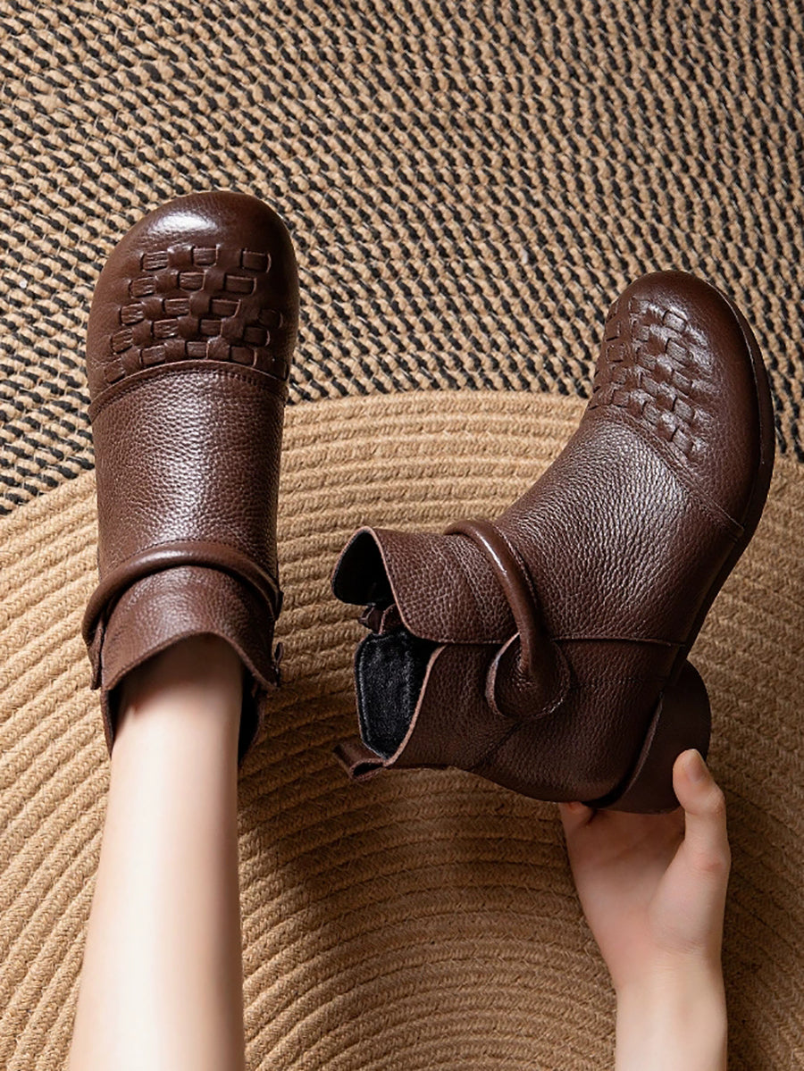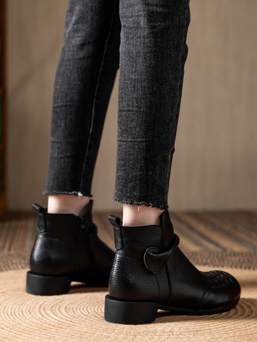 Botas femininas de inverno de couro legítimo com forro de lã e salto baixo.