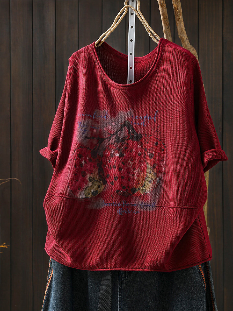 Camiseta feminina de verão com estampa artística de frutas e gola redonda em tricô