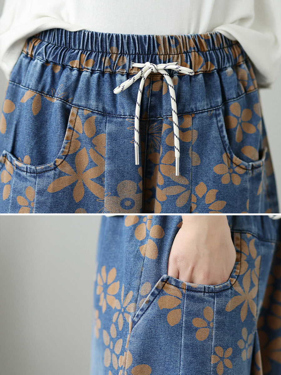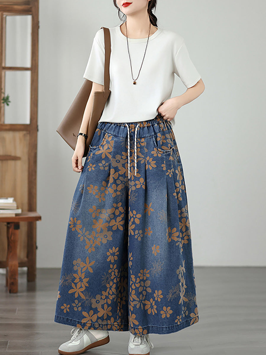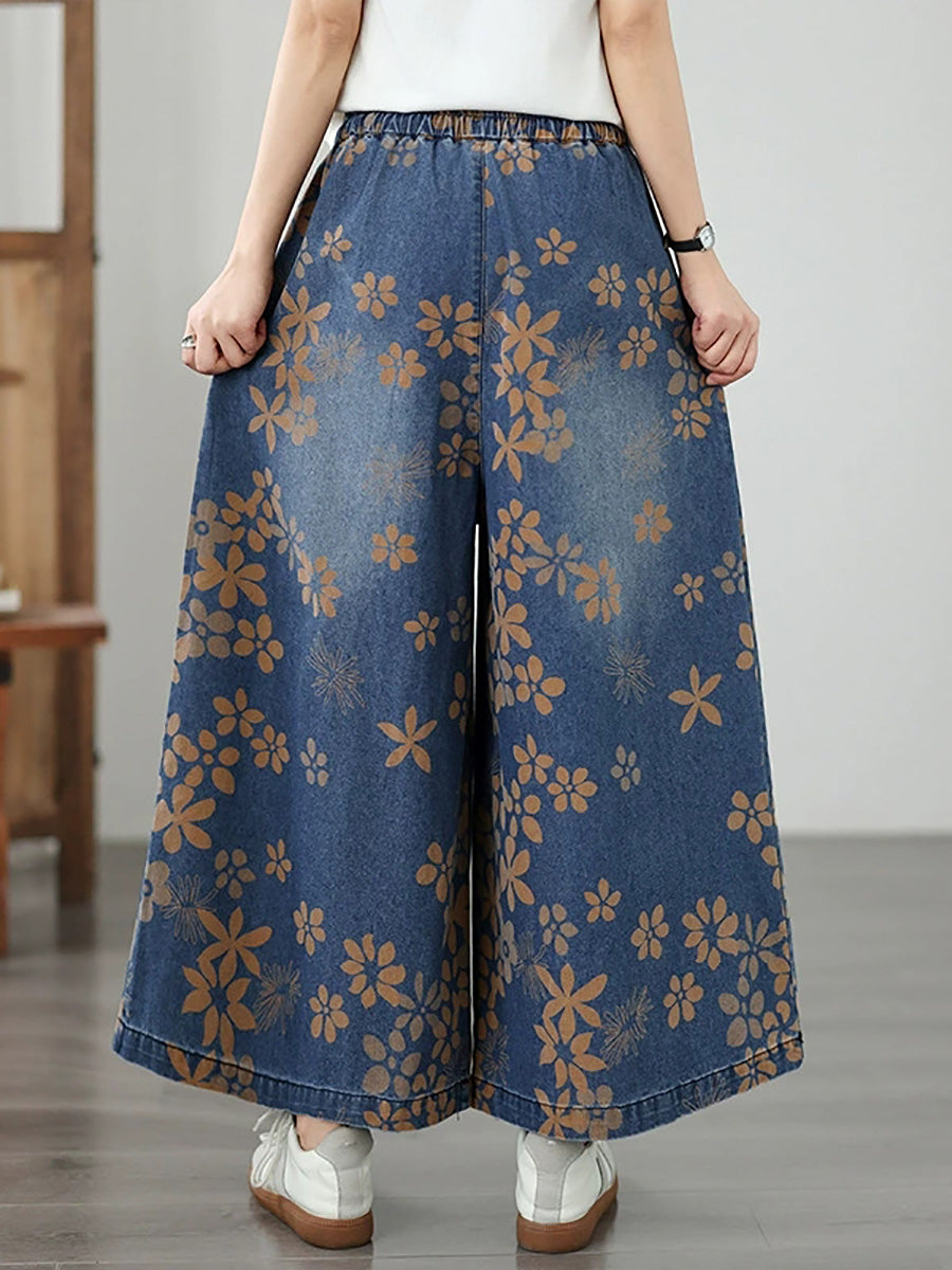 Calça jeans feminina de verão vintage com estampa floral e pernas largas