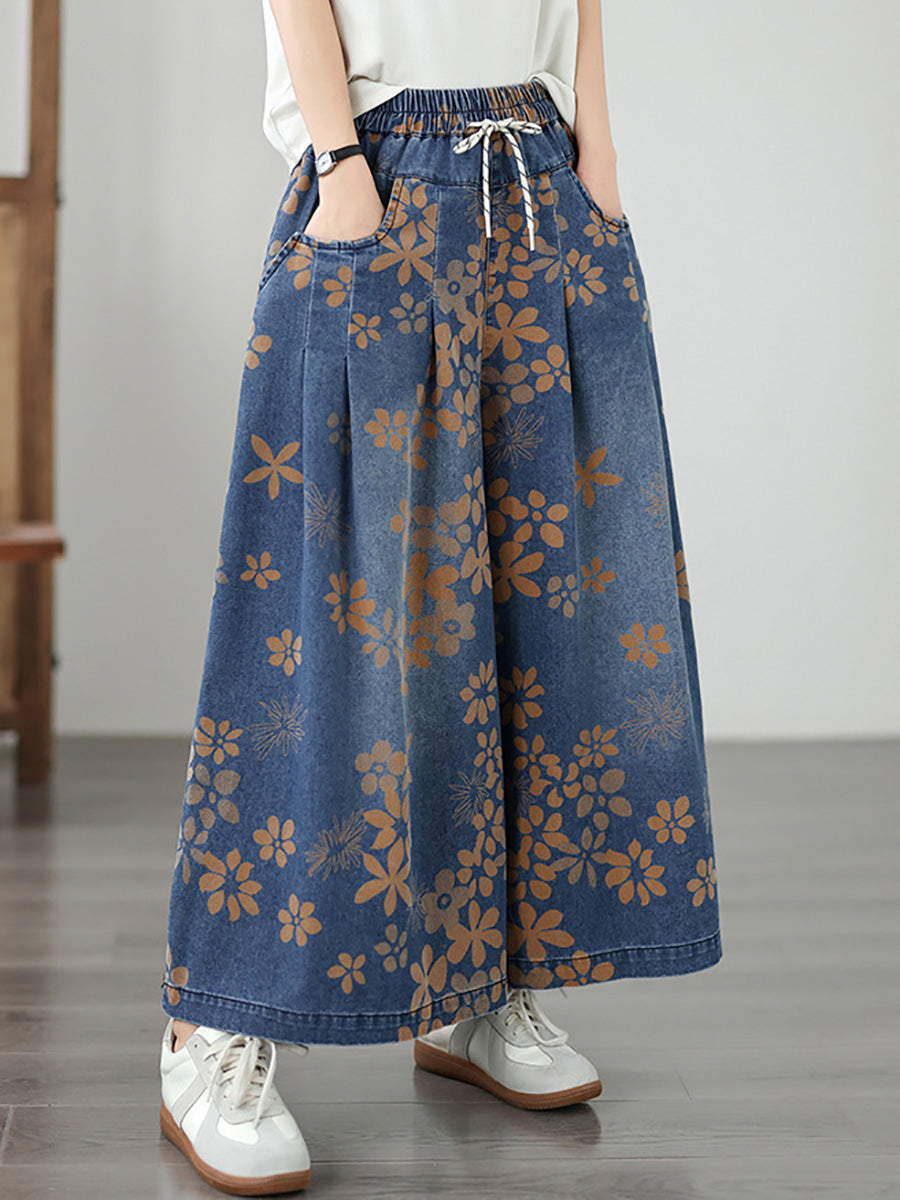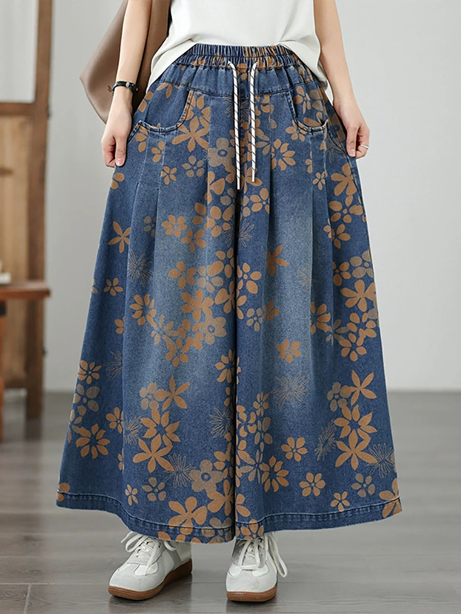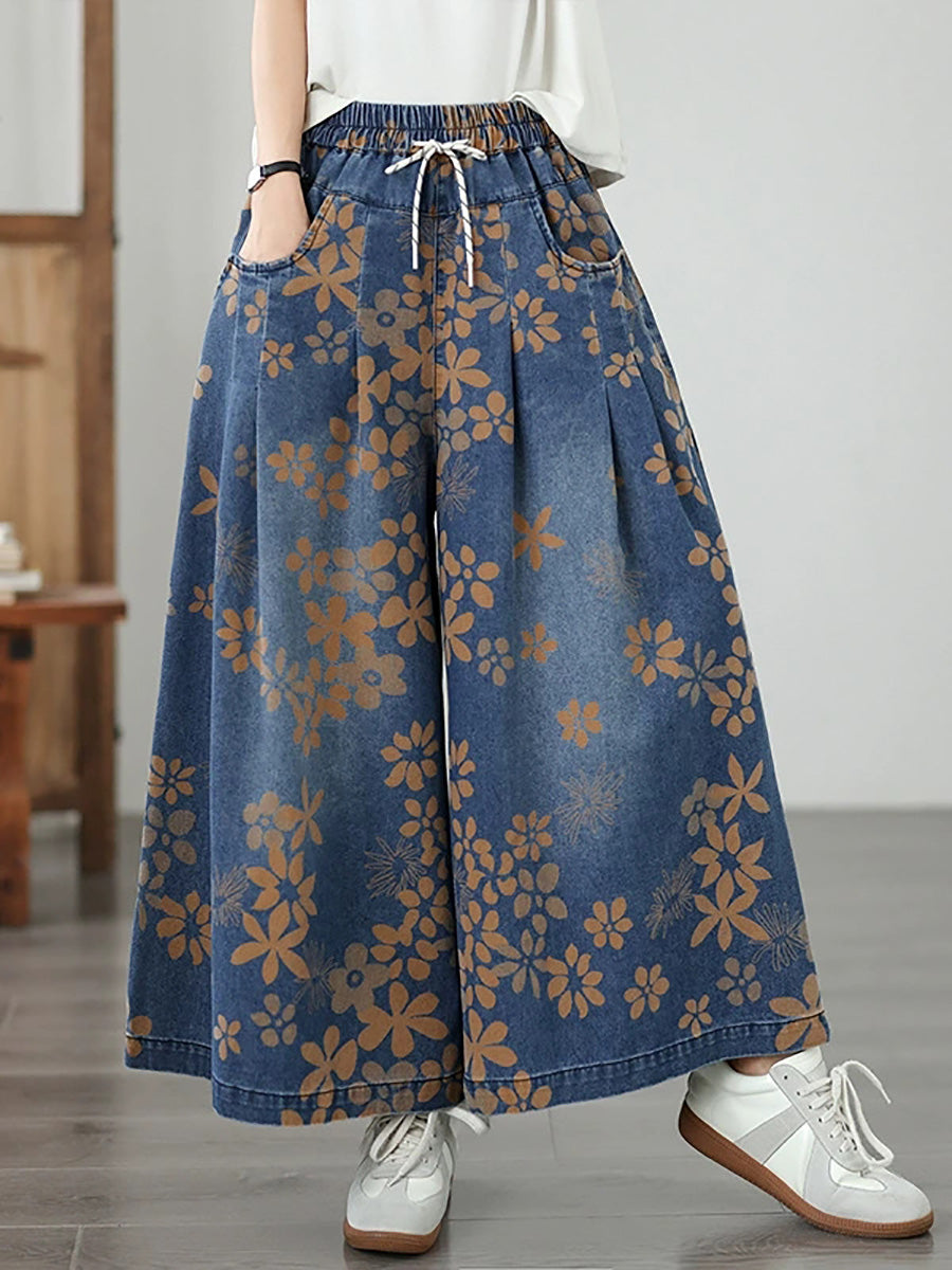 Calça jeans feminina de verão vintage com estampa floral e pernas largas