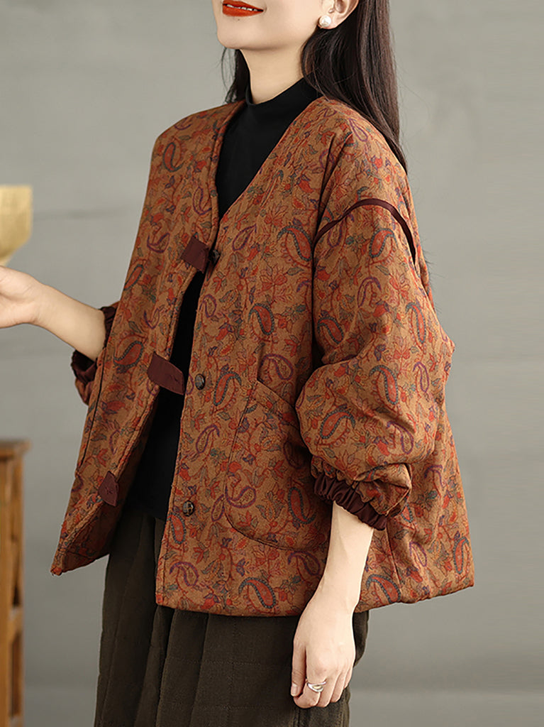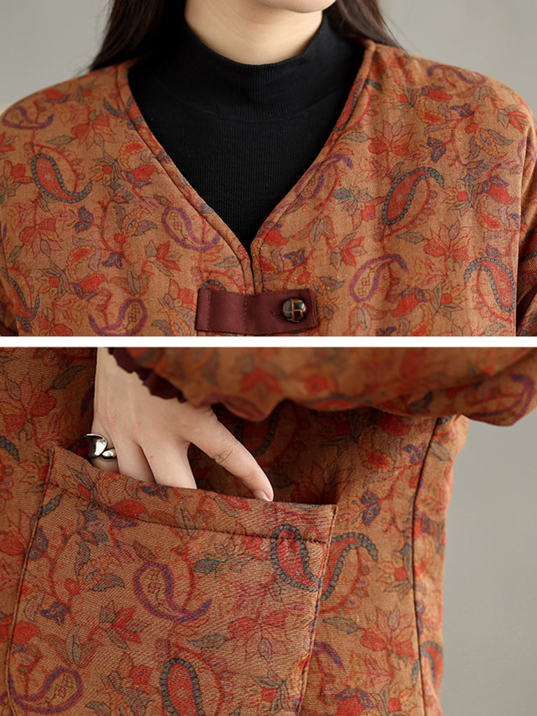 Casaco de algodão feminino retrô com decote em V e flores de outono