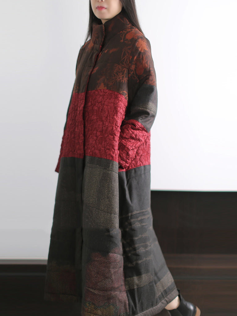 Casaco longo acolchoado com gola alta e emenda retrô para mulheres de inverno