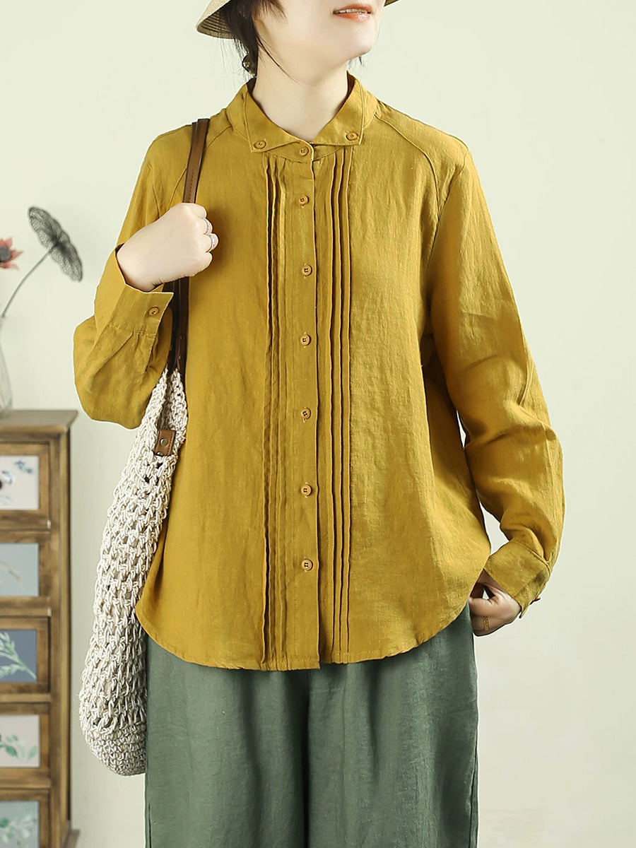 Camisa feminina Artsy Spring com franzido em cor lisa, 100% linho.
