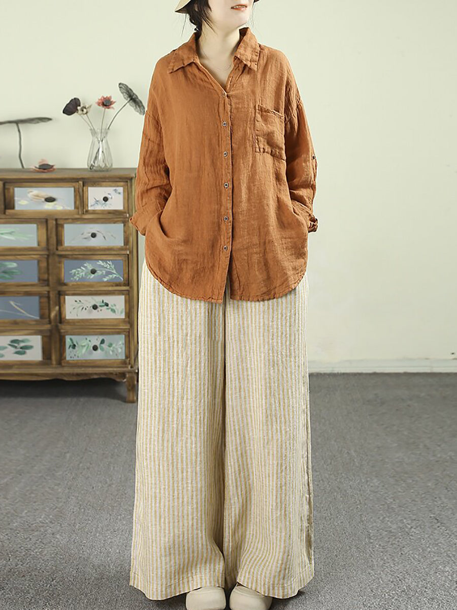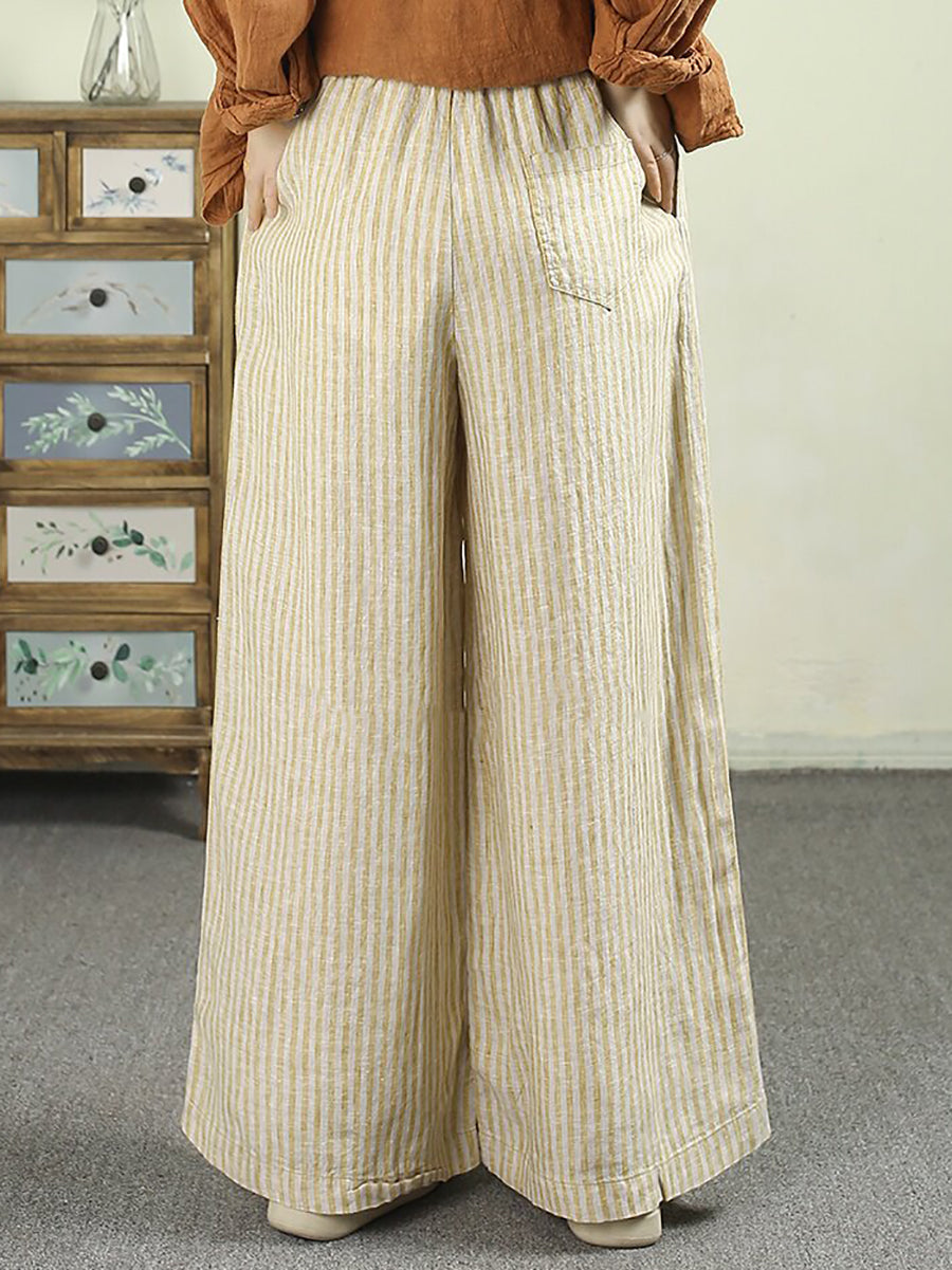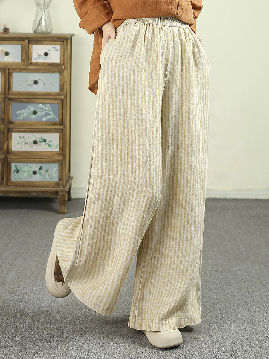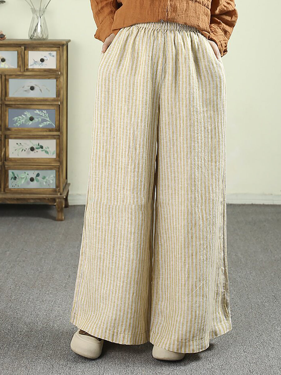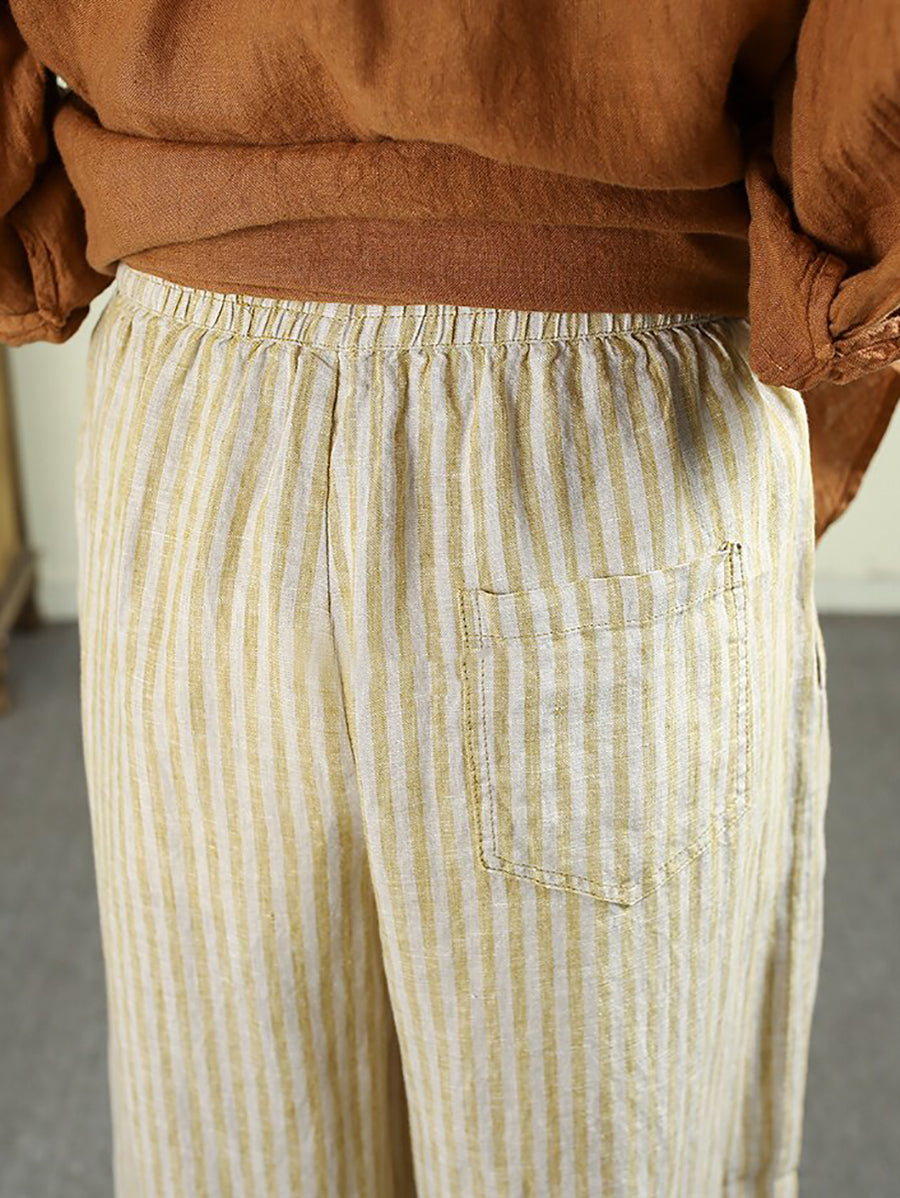 Calça feminina de linho vintage listrada para a primavera, modelo pantalona.