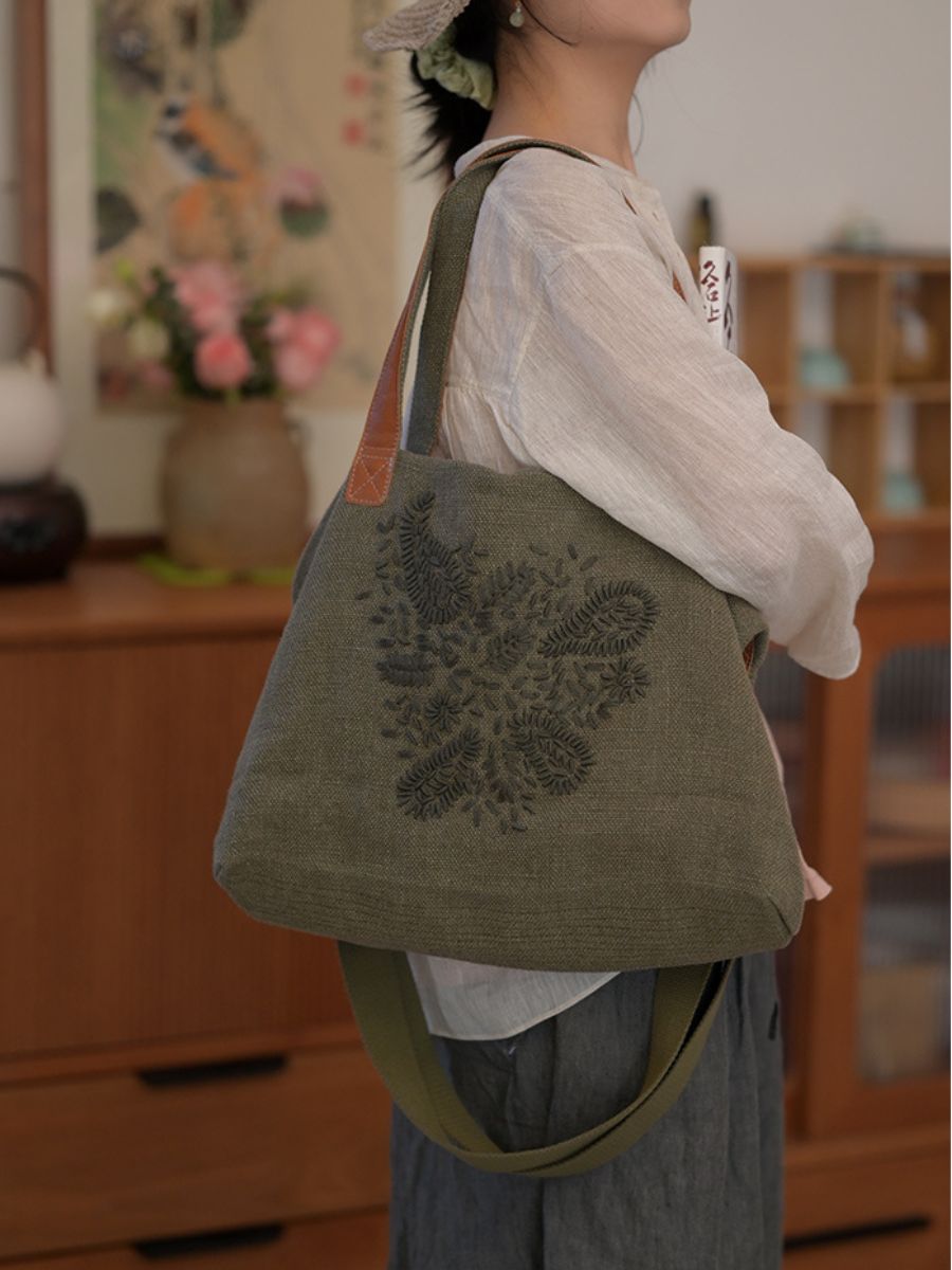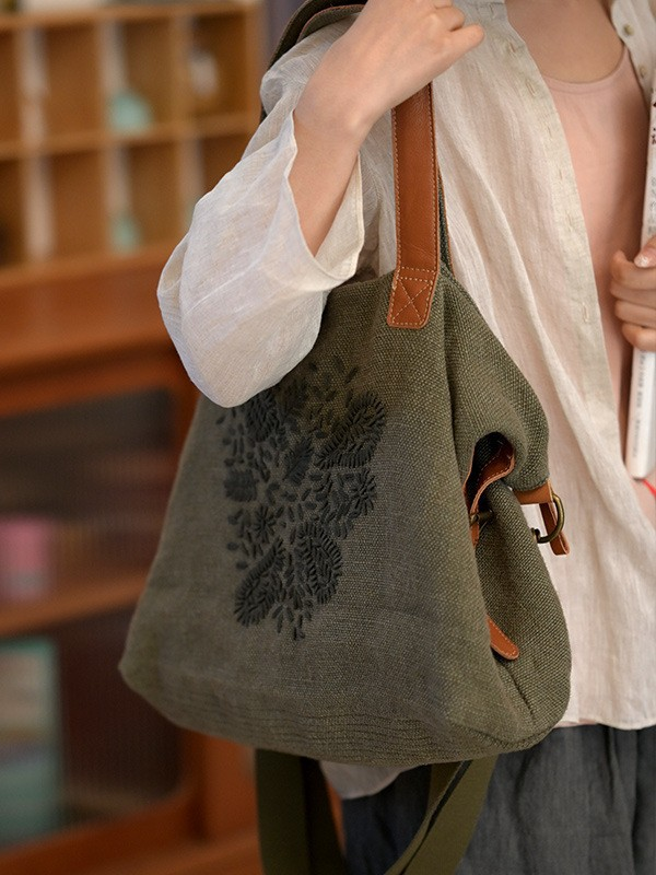 03022 Bolsa de Ombro Vintage Bordada em Algodão e Linho
