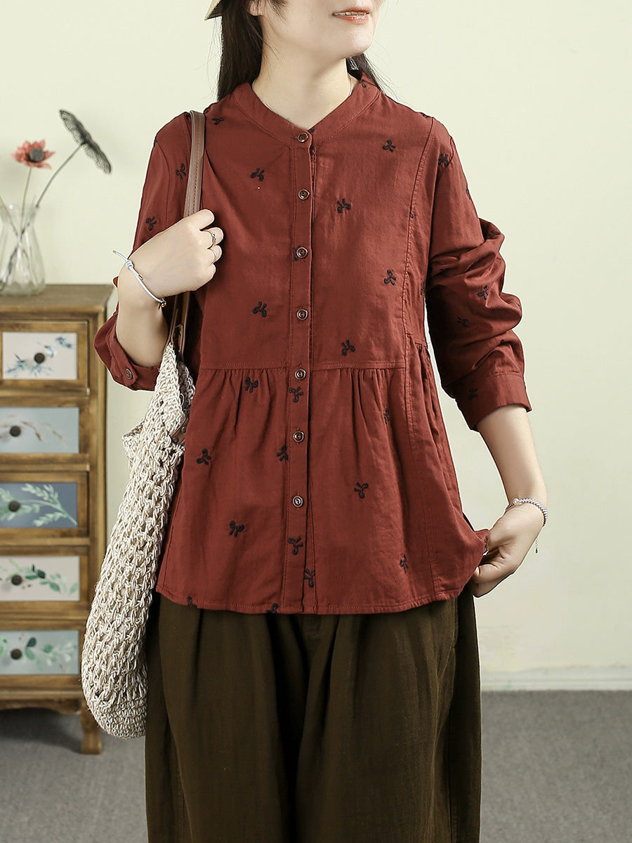 Camisa feminina de outono vintage bordada 100% algodão com gola alta
