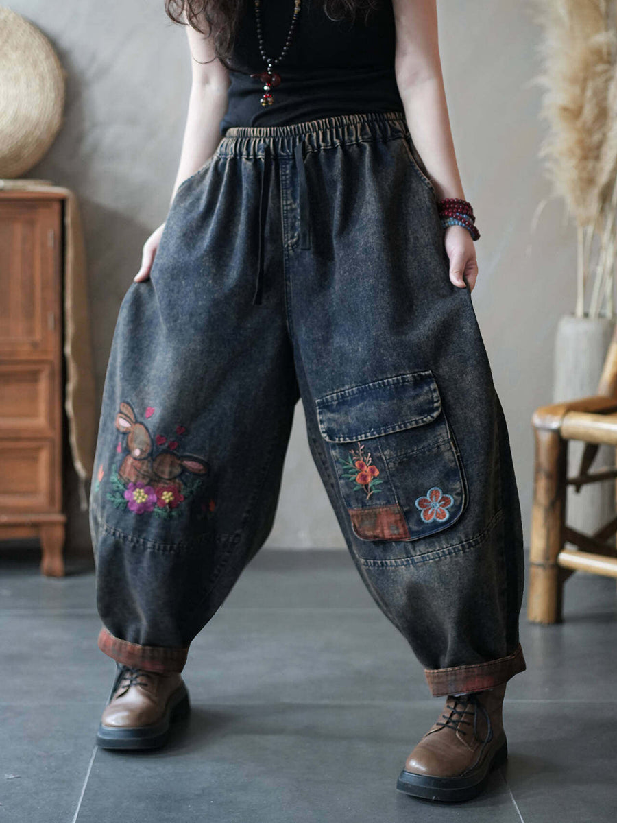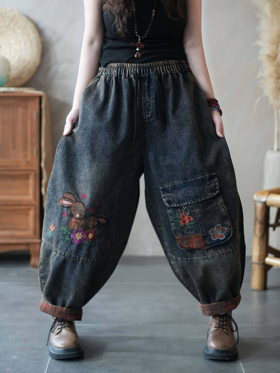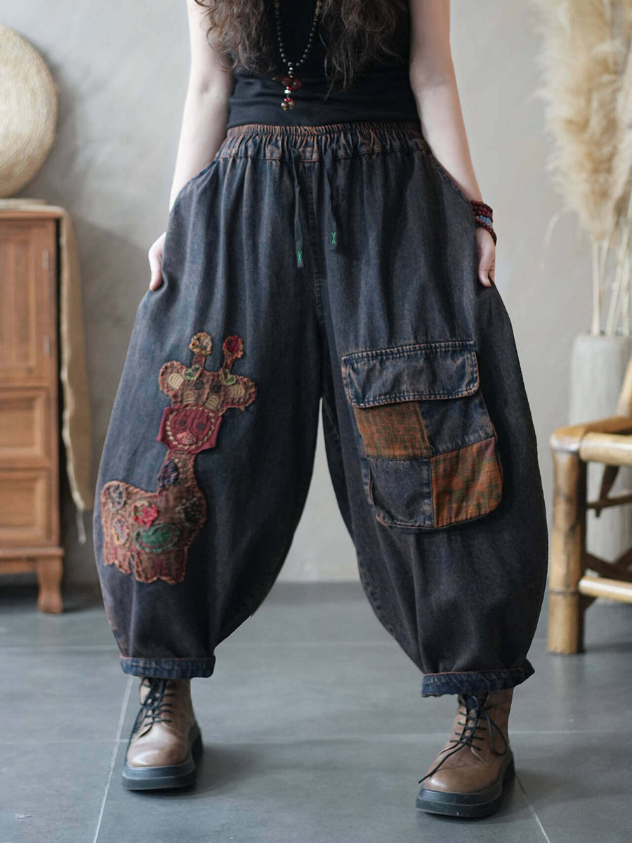 Calça Harem Jeans Feminina de Verão com Aplique de Girafa