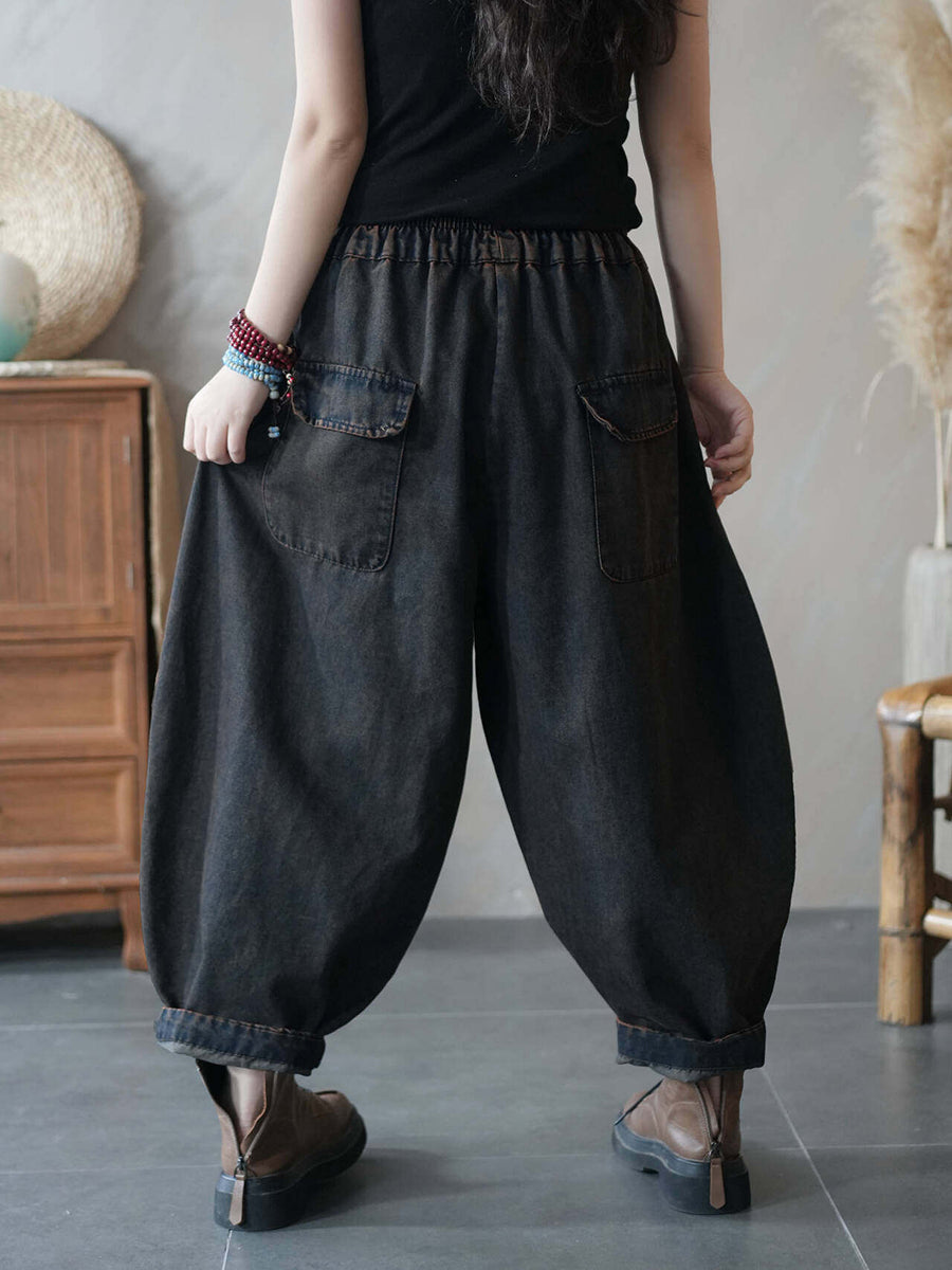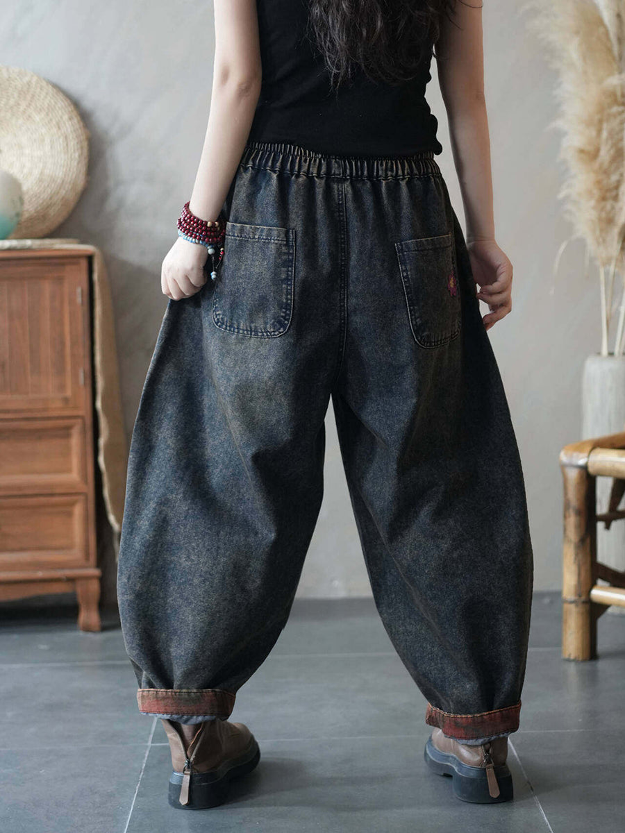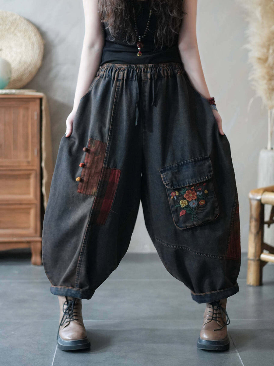 Calça Harem Jeans Feminina de Verão com Aplique de Girafa