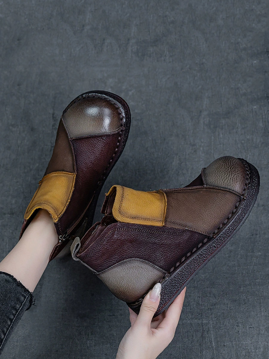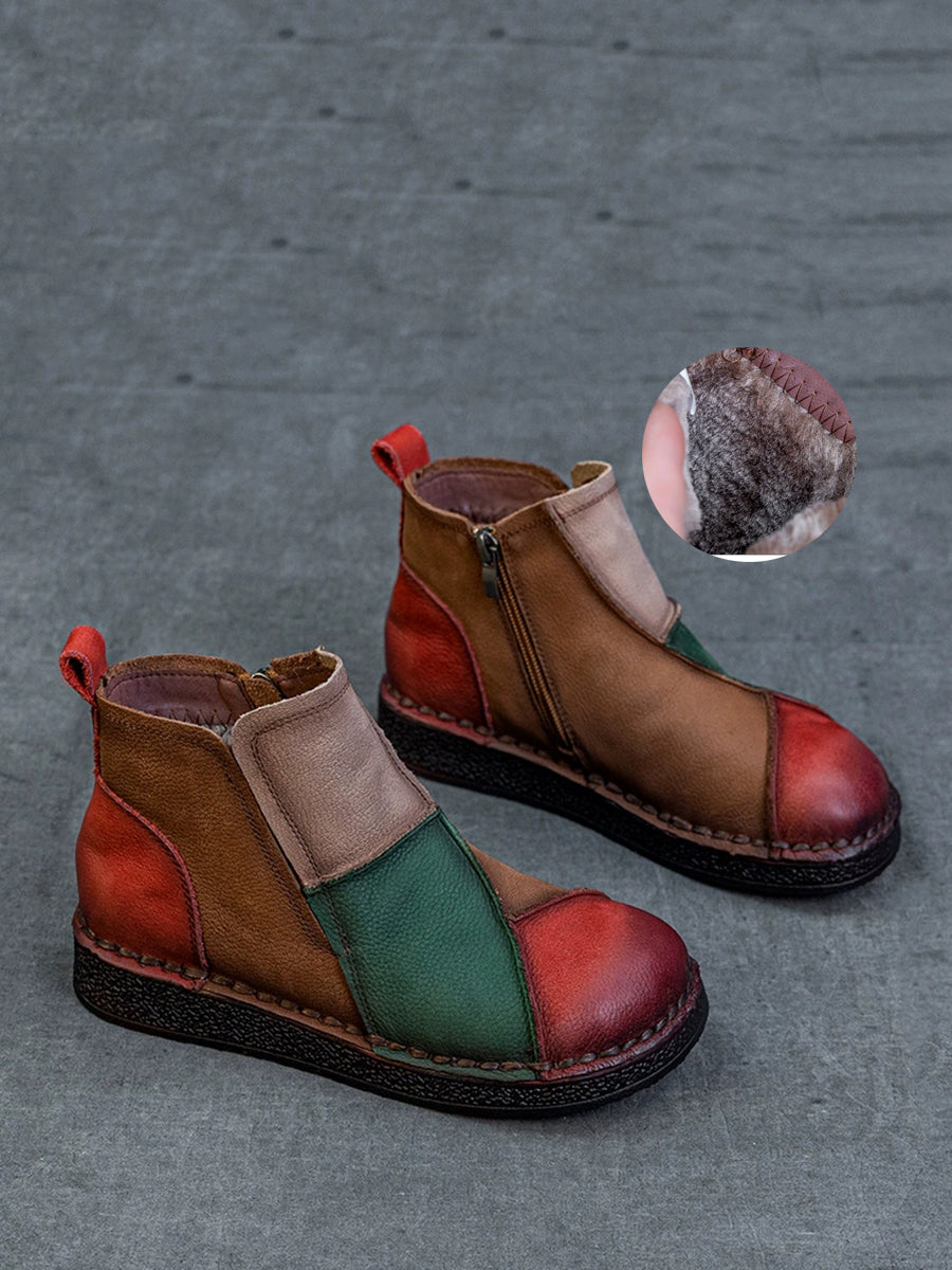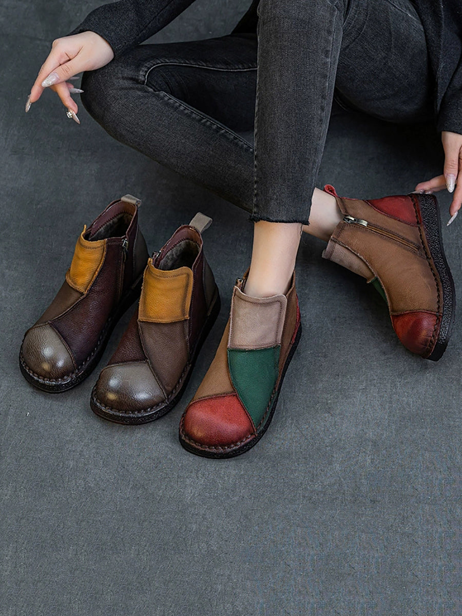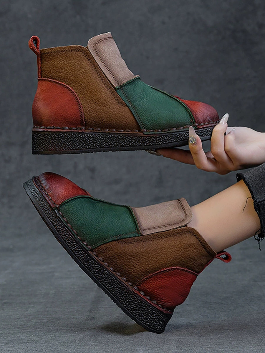 Botas de cano curto femininas de inverno em couro legítimo com blocos de cores