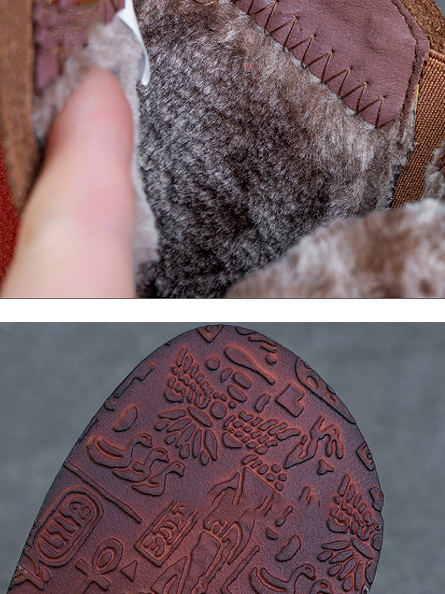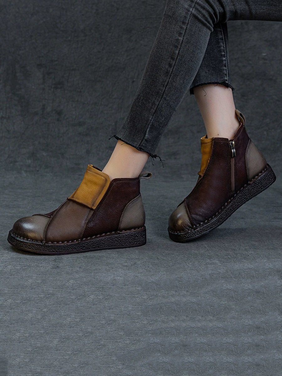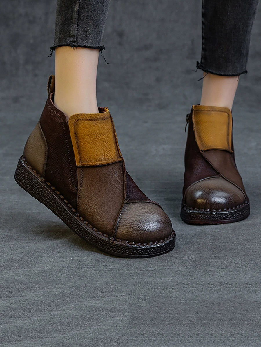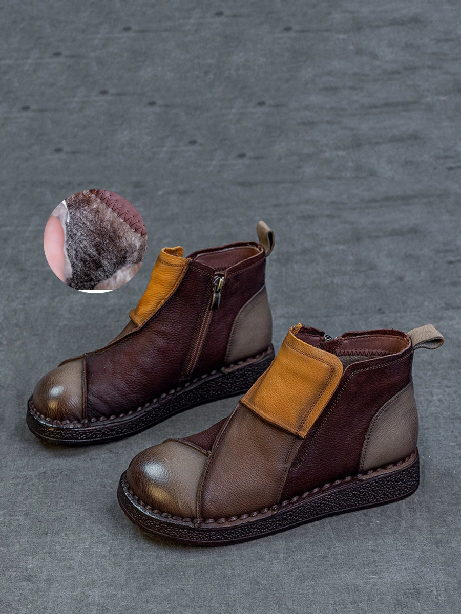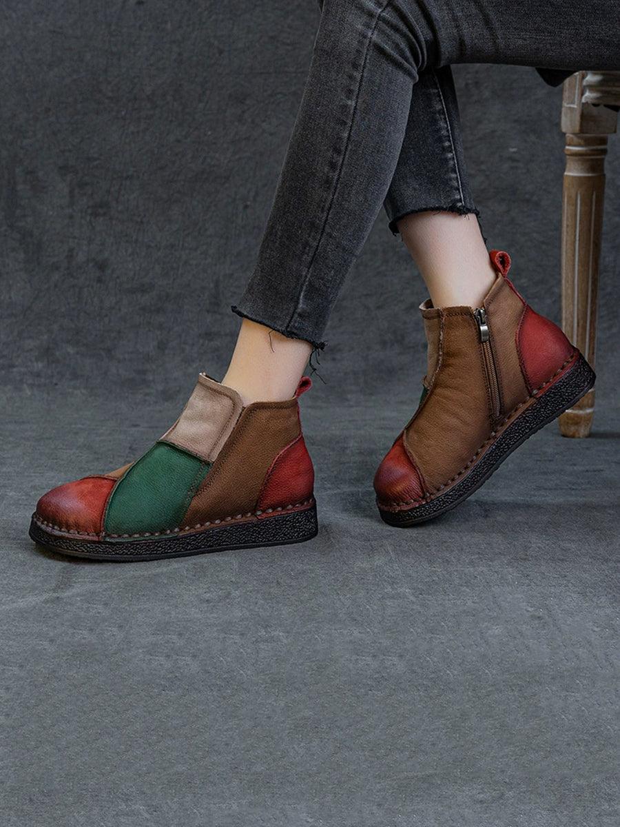 Botas de cano curto femininas de inverno em couro legítimo com blocos de cores