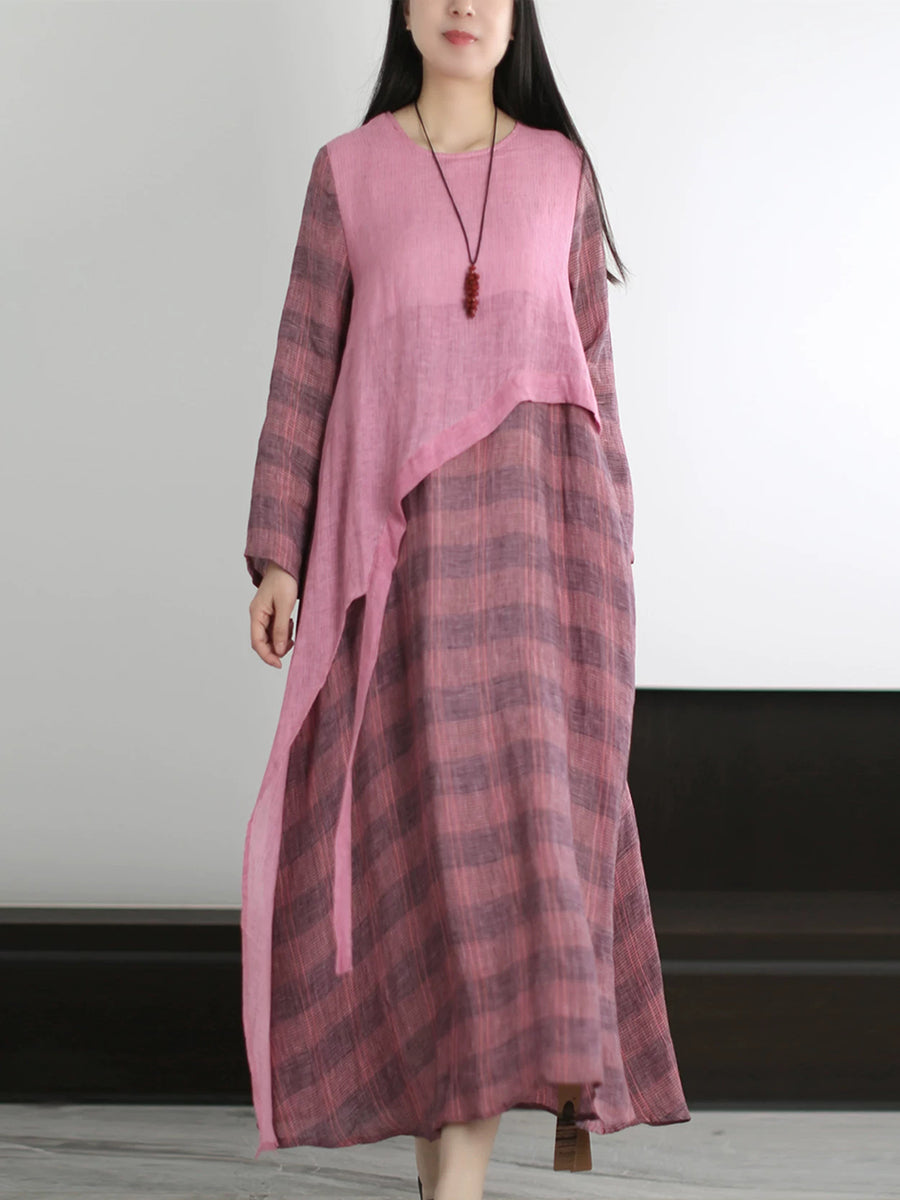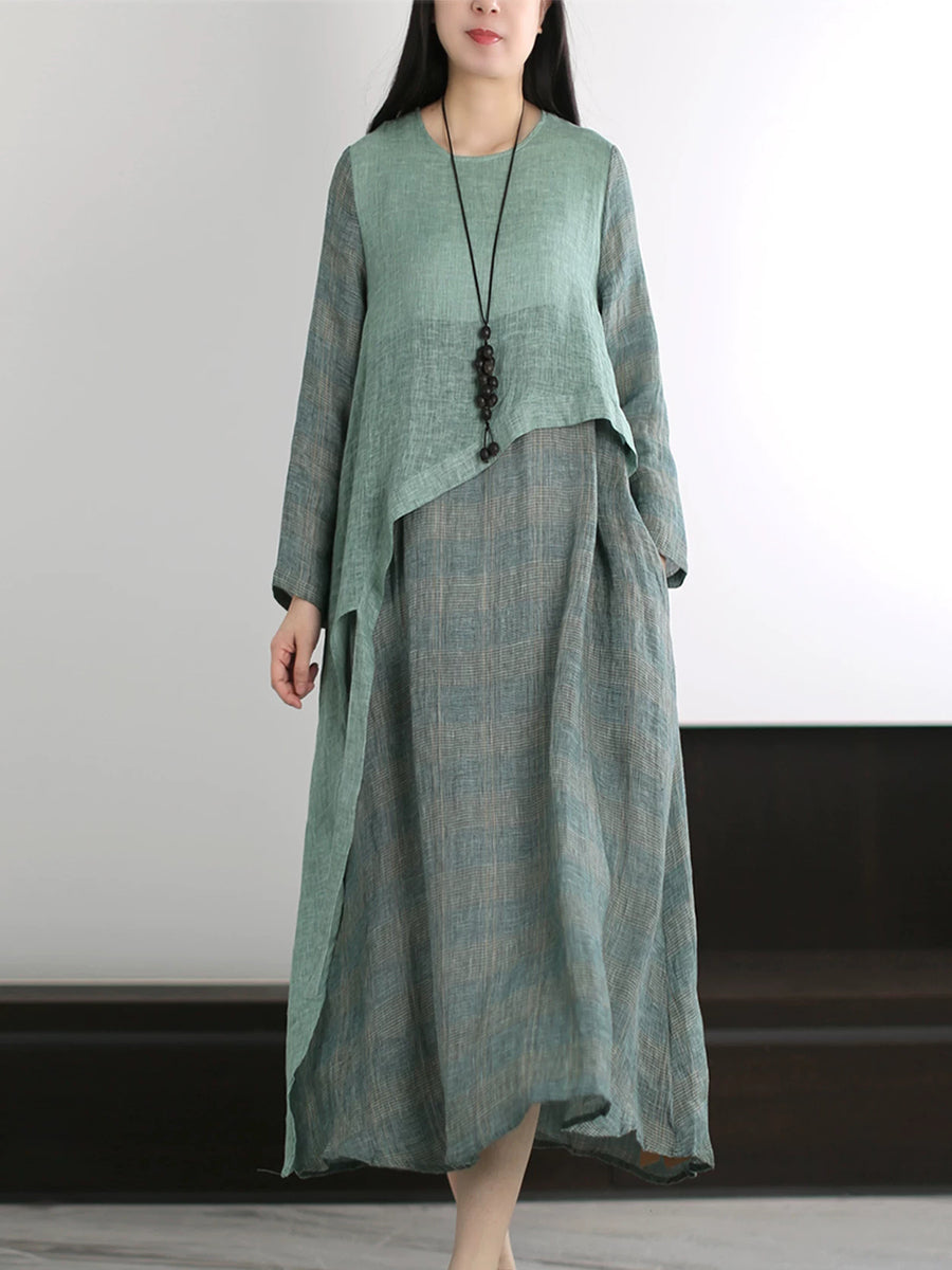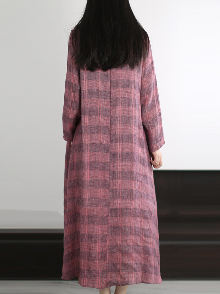 Vestido feminino de linho listrado com decote redondo para o verão.