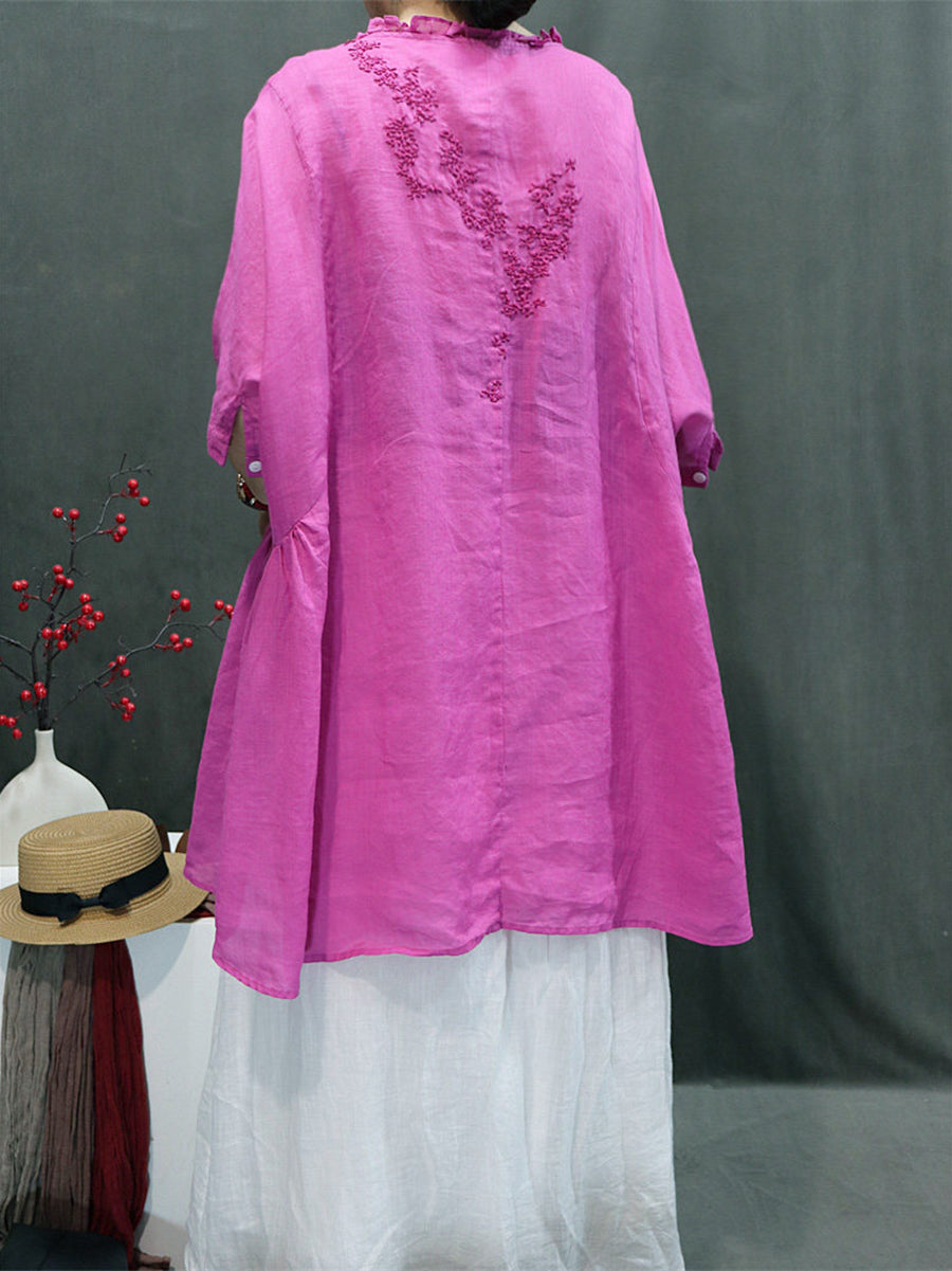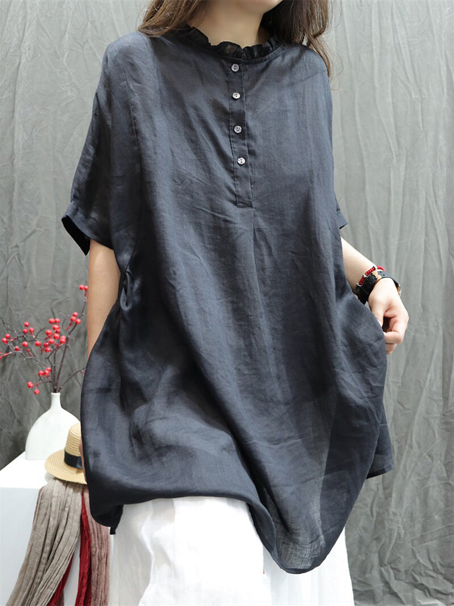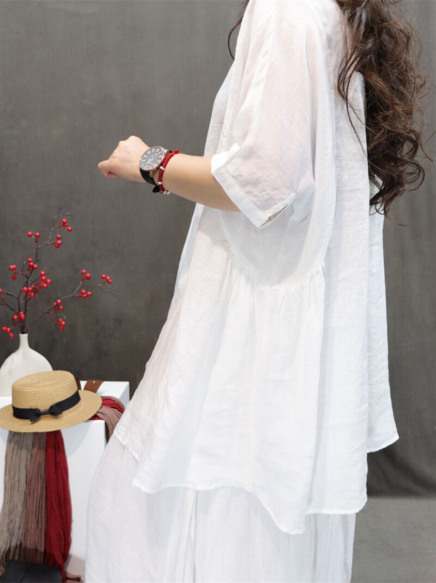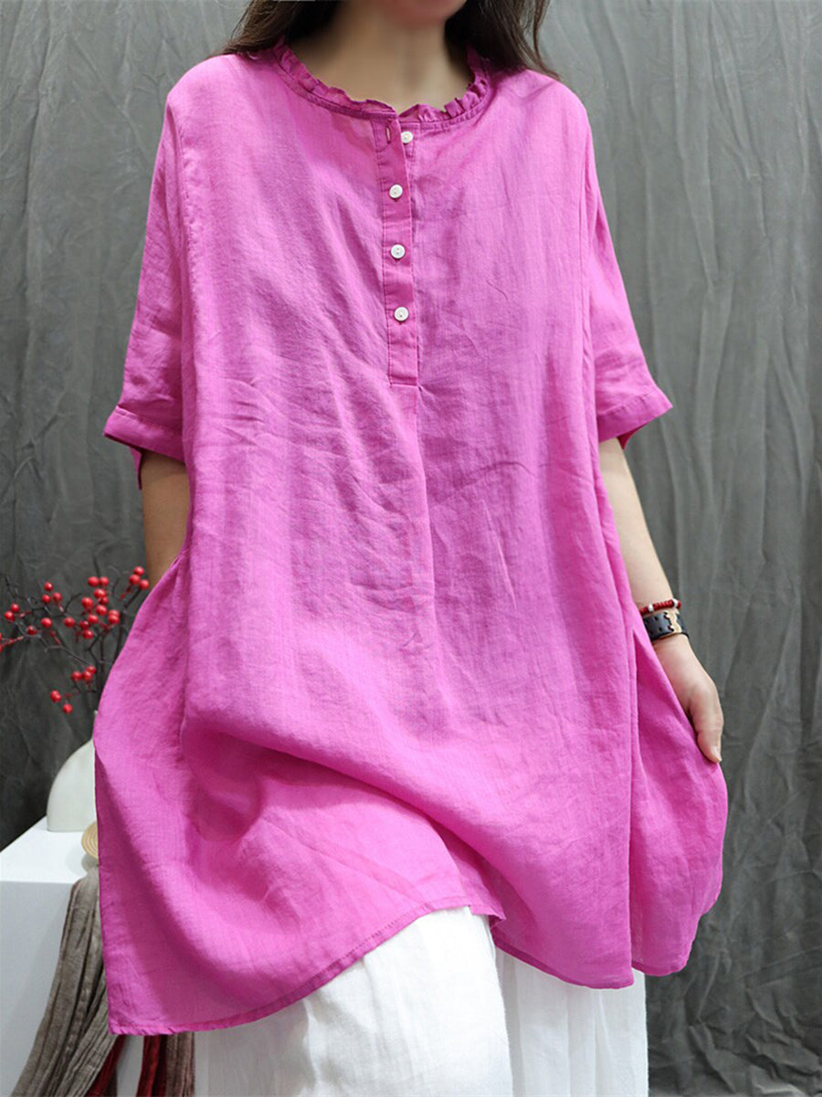 Blusa feminina de verão com decote redondo, estilo artístico, 100% rami.