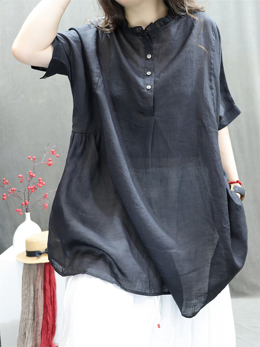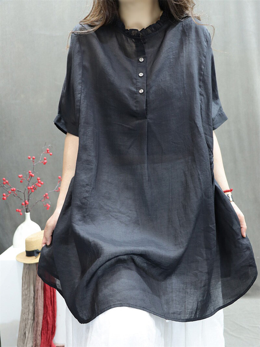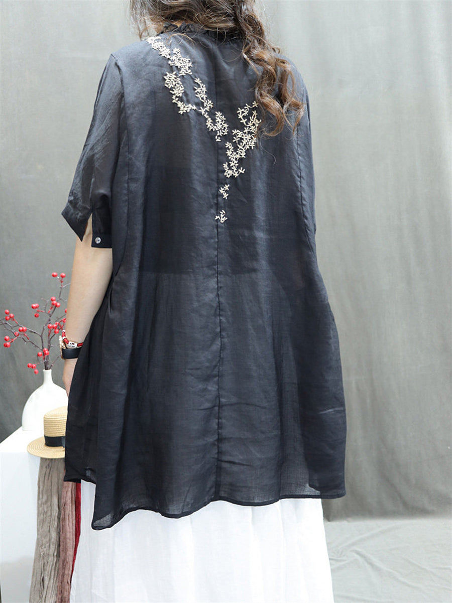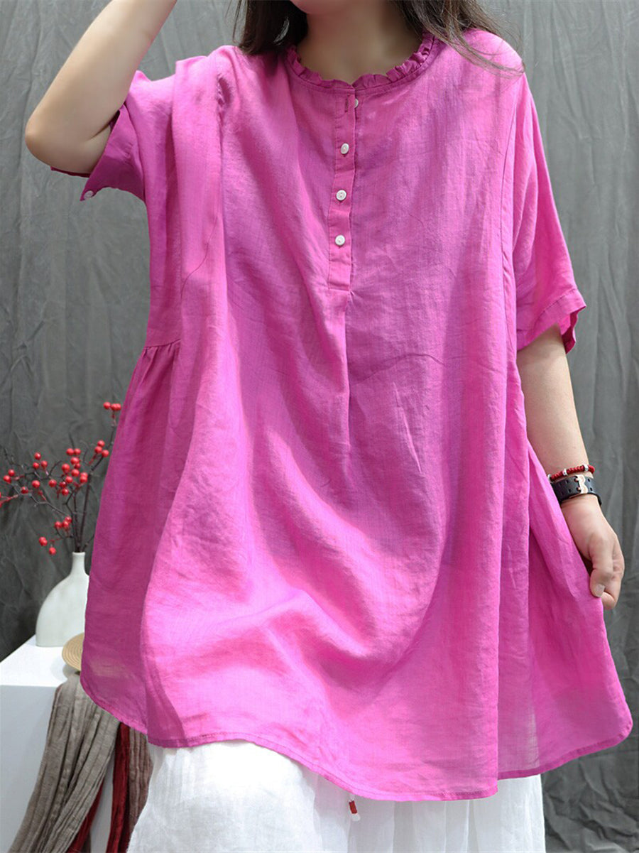 Blusa feminina de verão com decote redondo, estilo artístico, 100% rami.