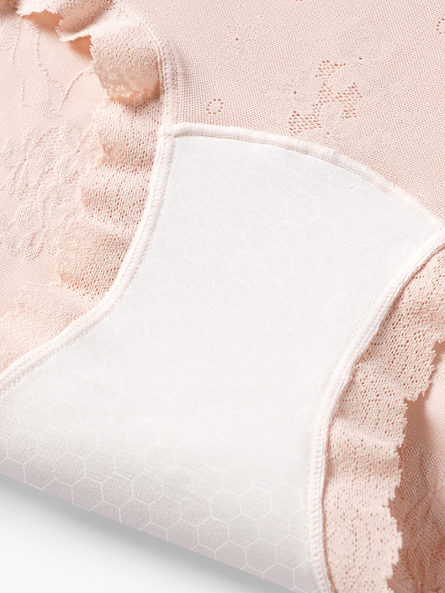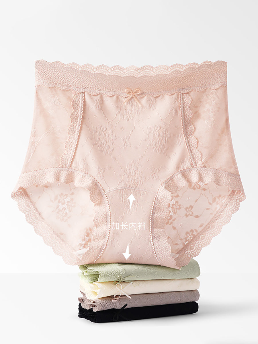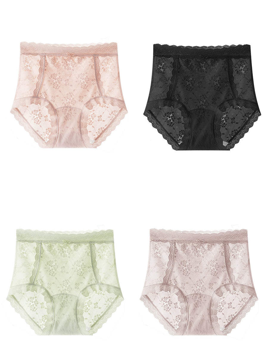 Conjunto de 4 peças de calcinha feminina de cintura alta com renda floral artística.