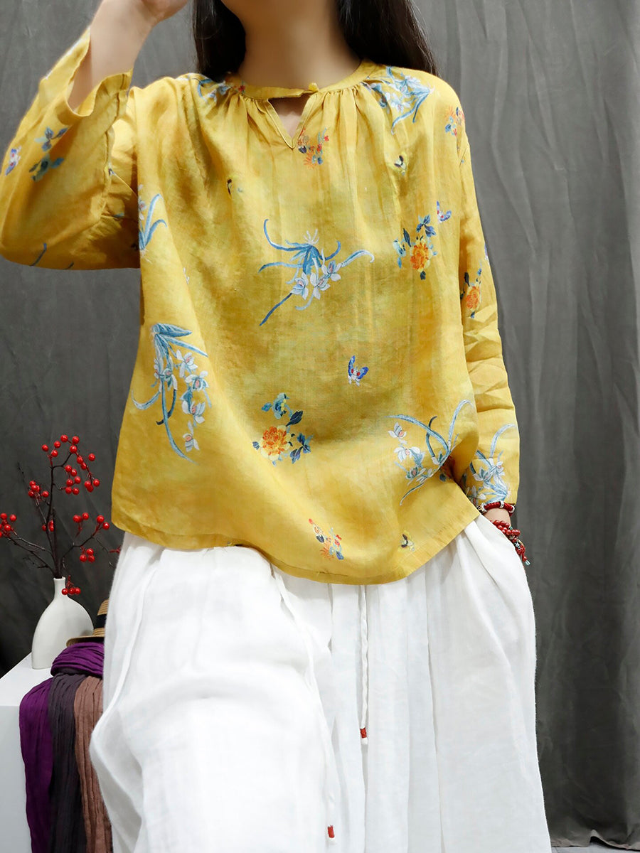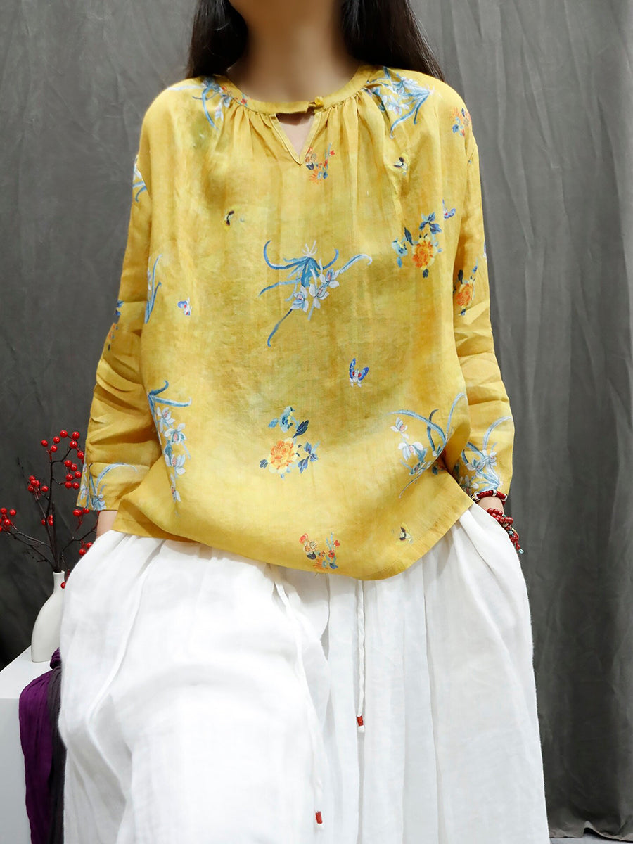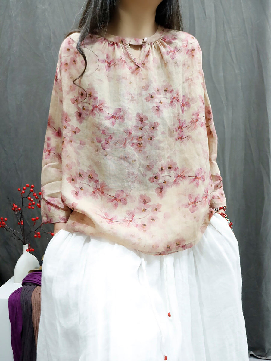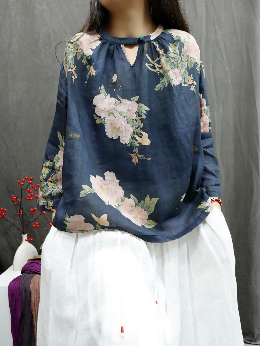Camisa feminina de verão com estampa floral artística e gola redonda, 100% rami.
