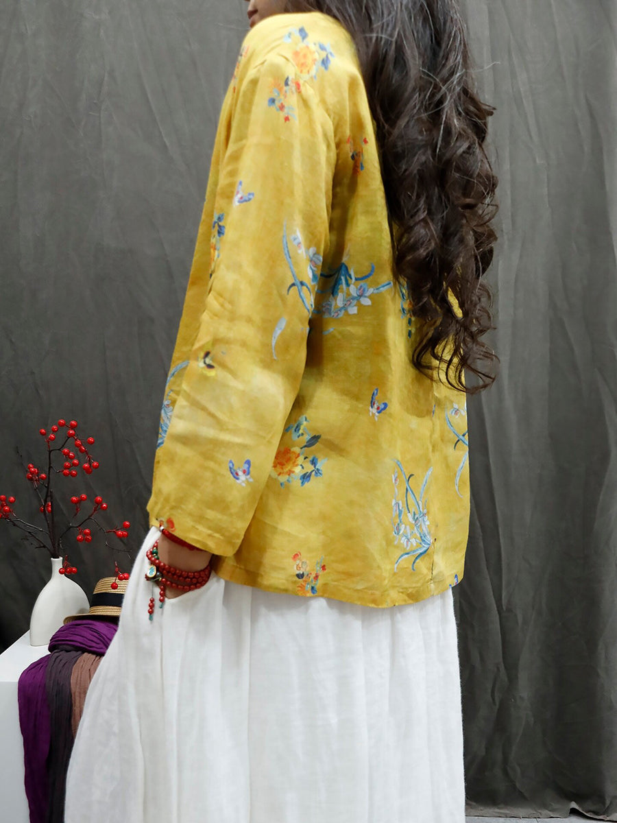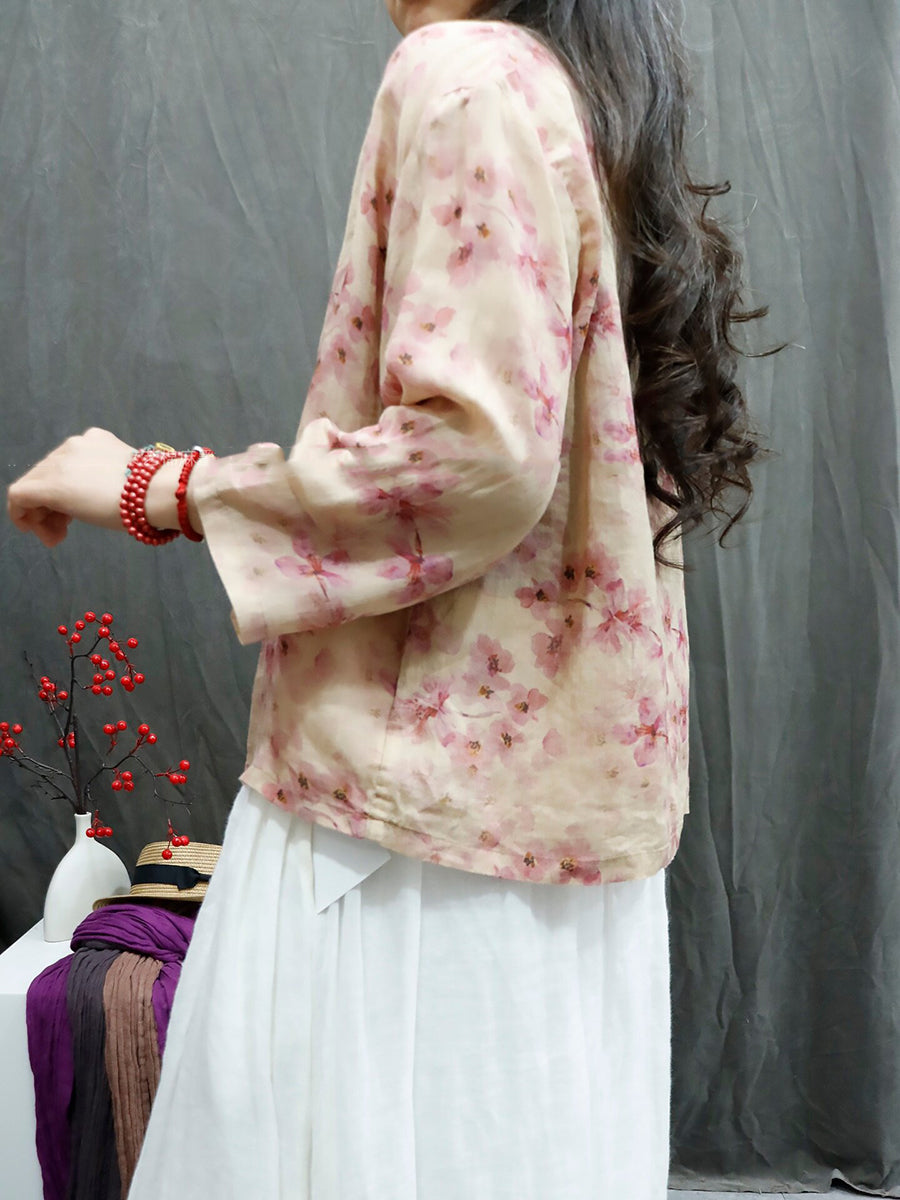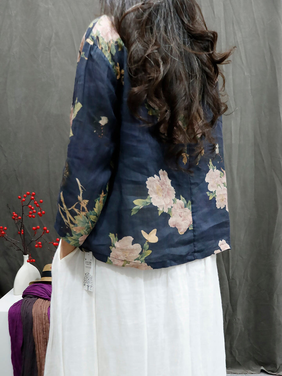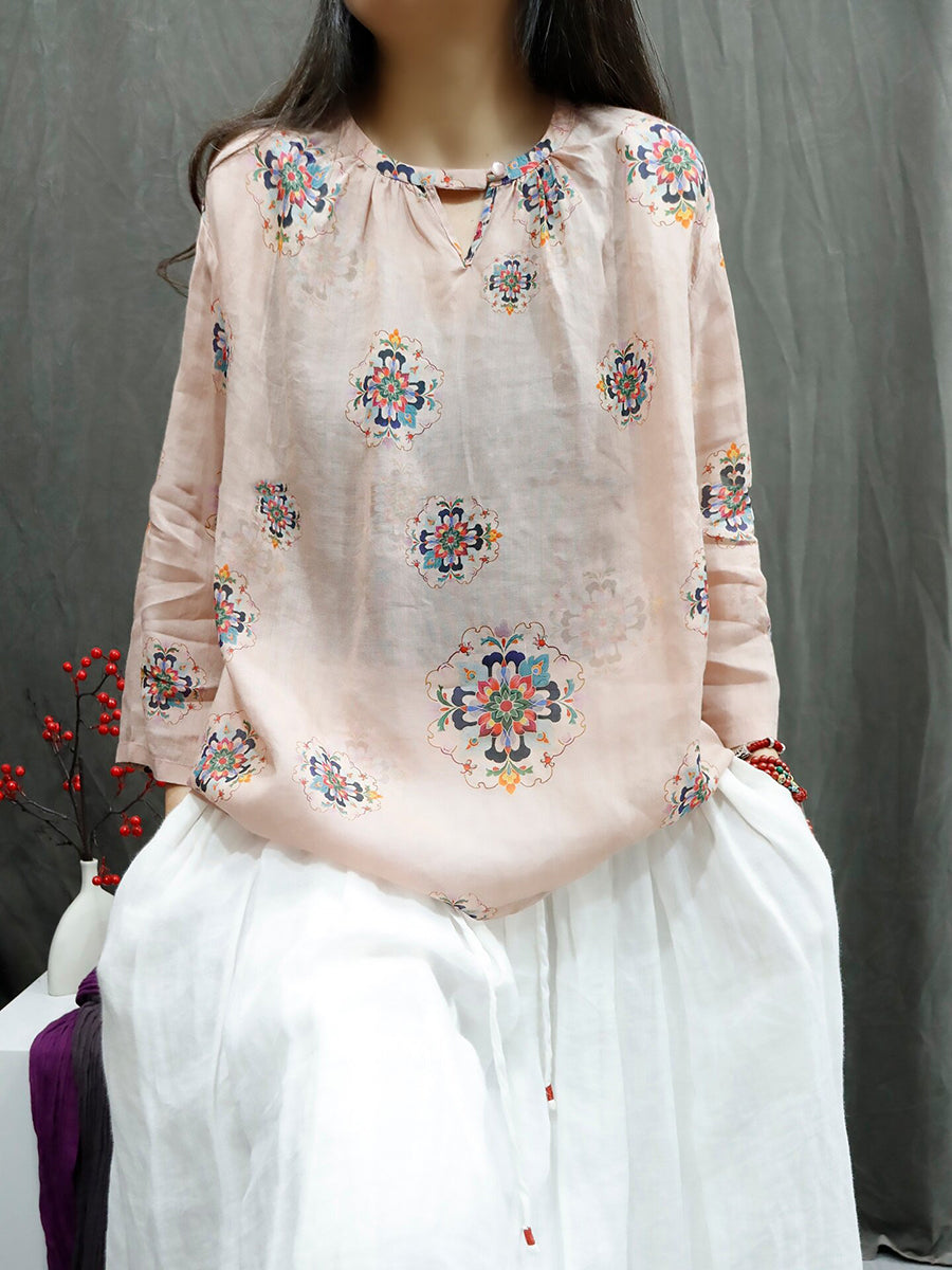 Camisa feminina de verão com estampa floral artística e gola redonda, 100% rami.