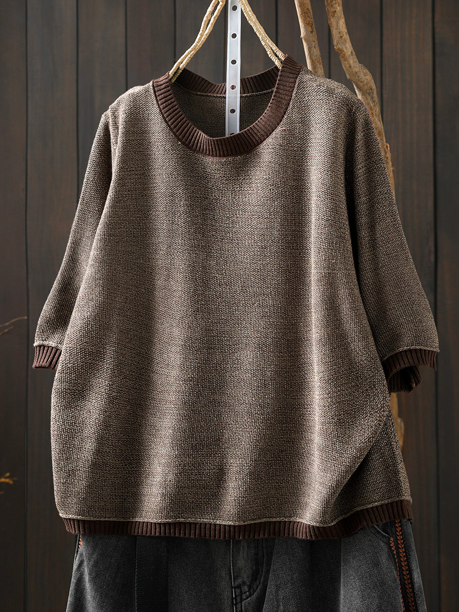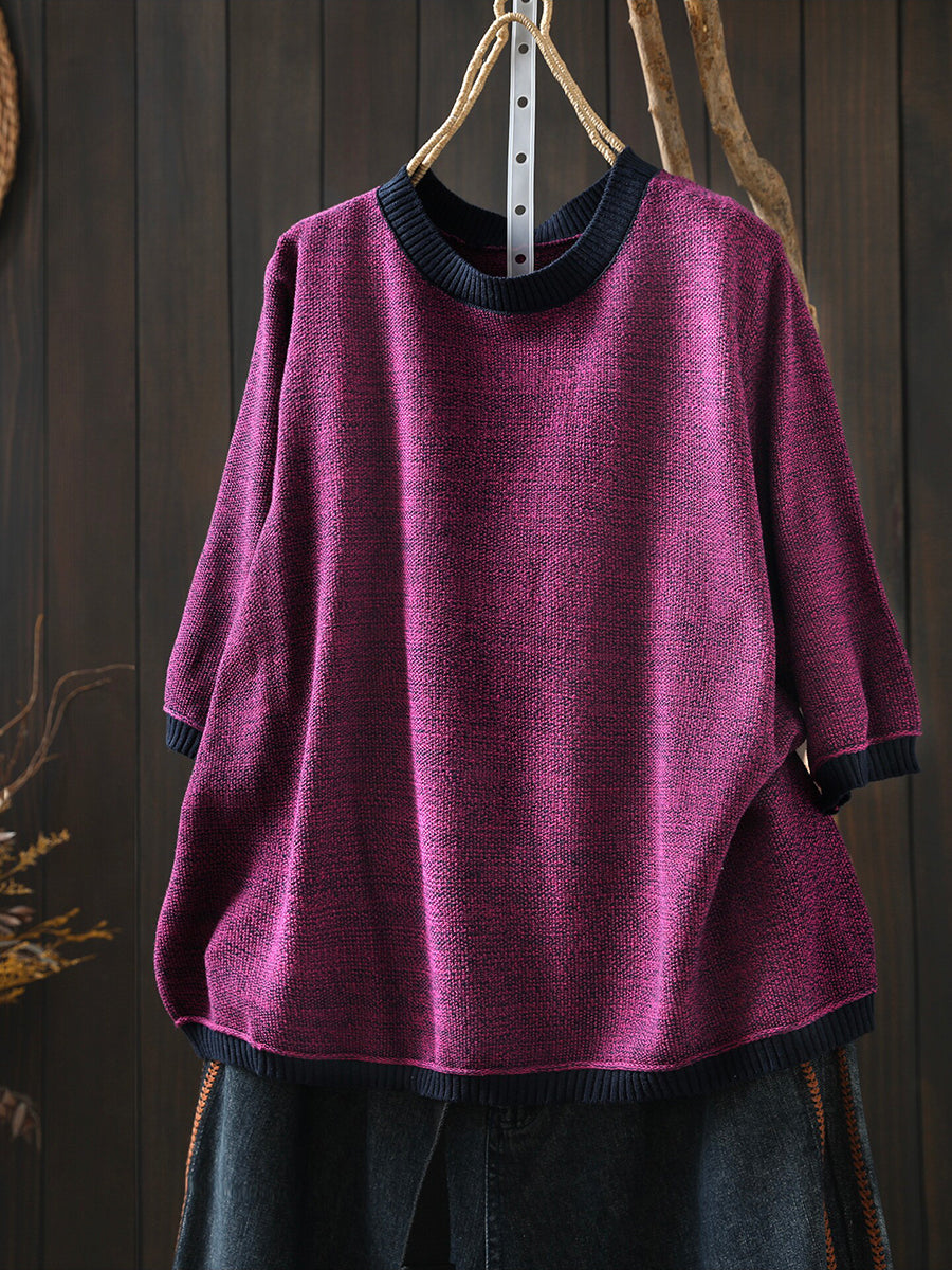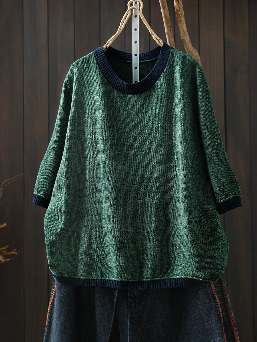 Camisa feminina casual de verão com decote redondo e blocos de cores