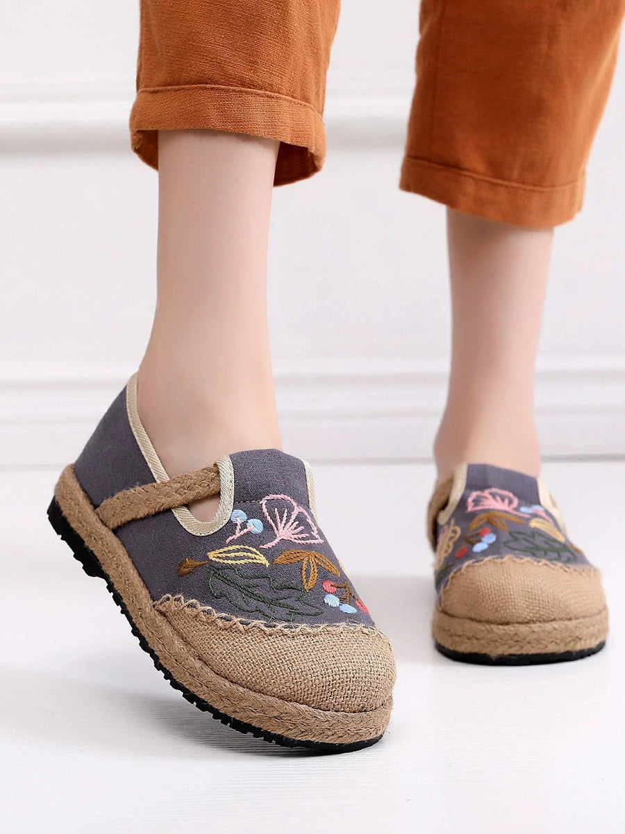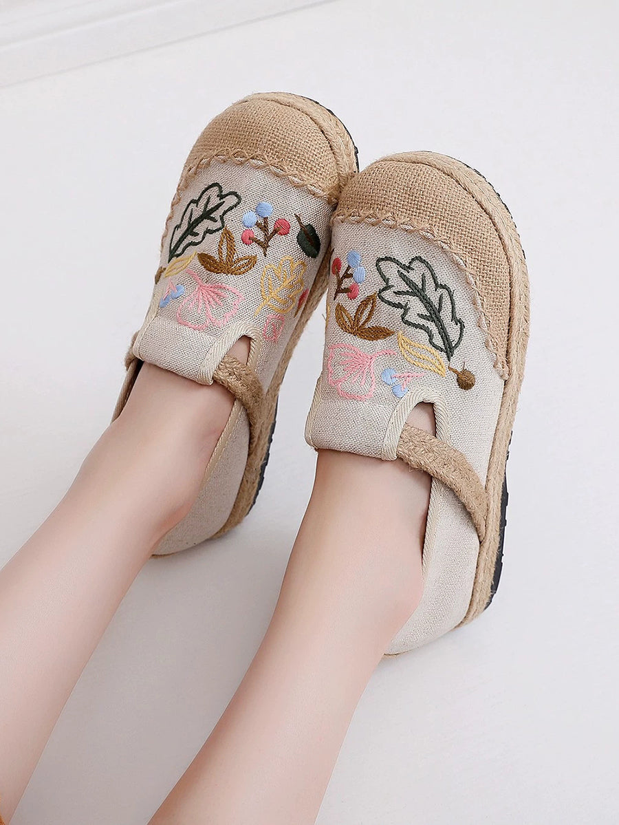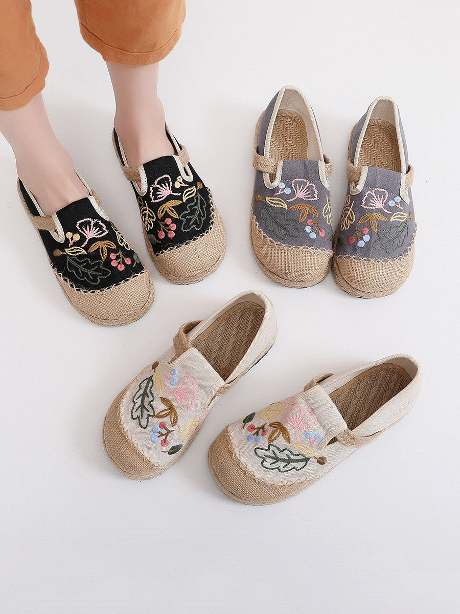 Sapatos de linho bordados com flores para mulheres, ideais para o verão.