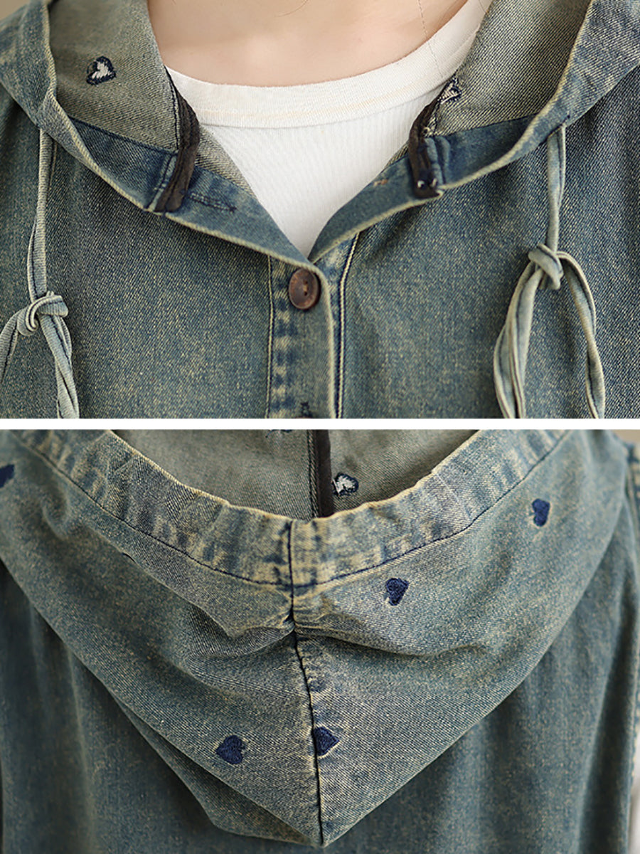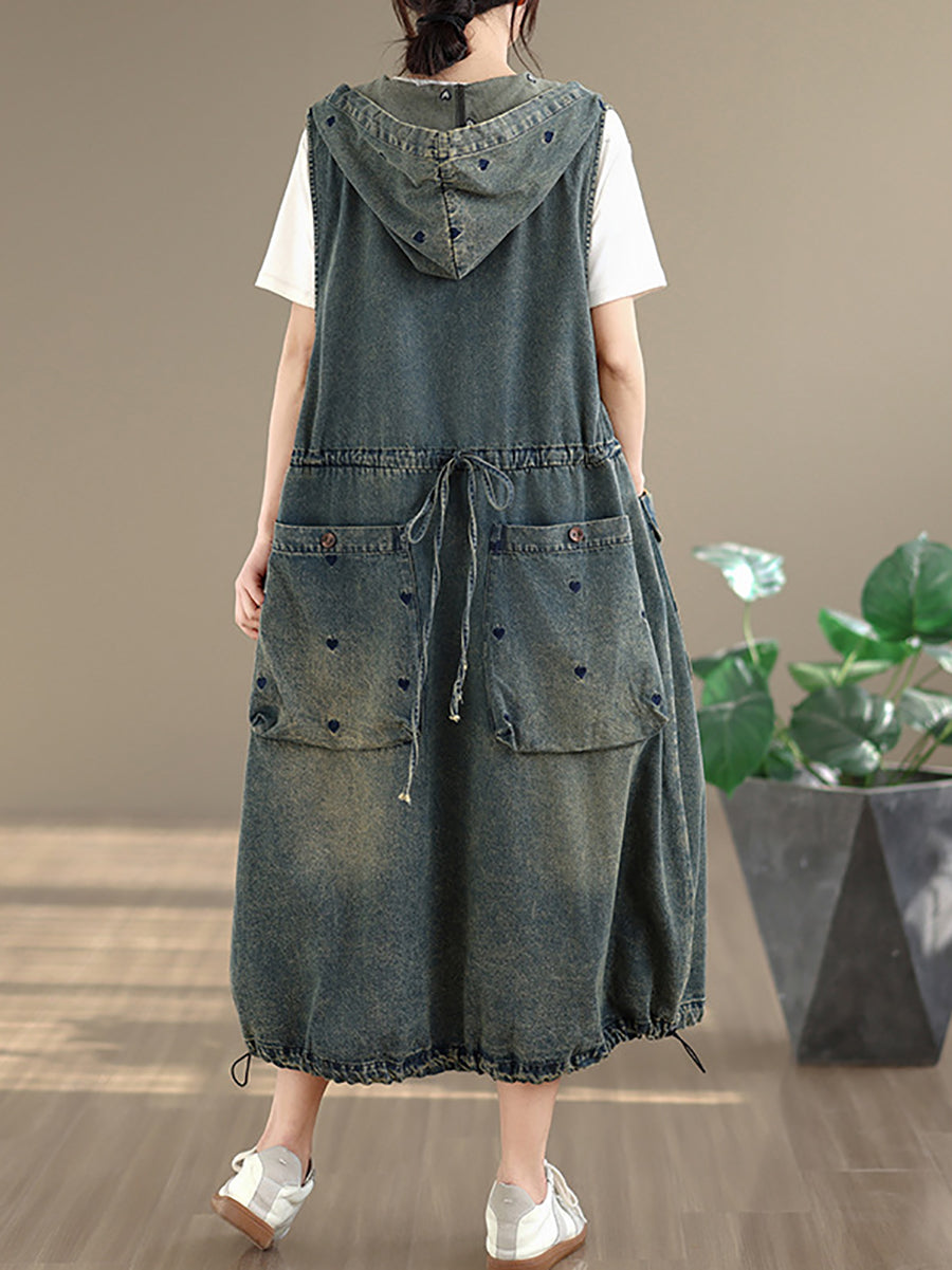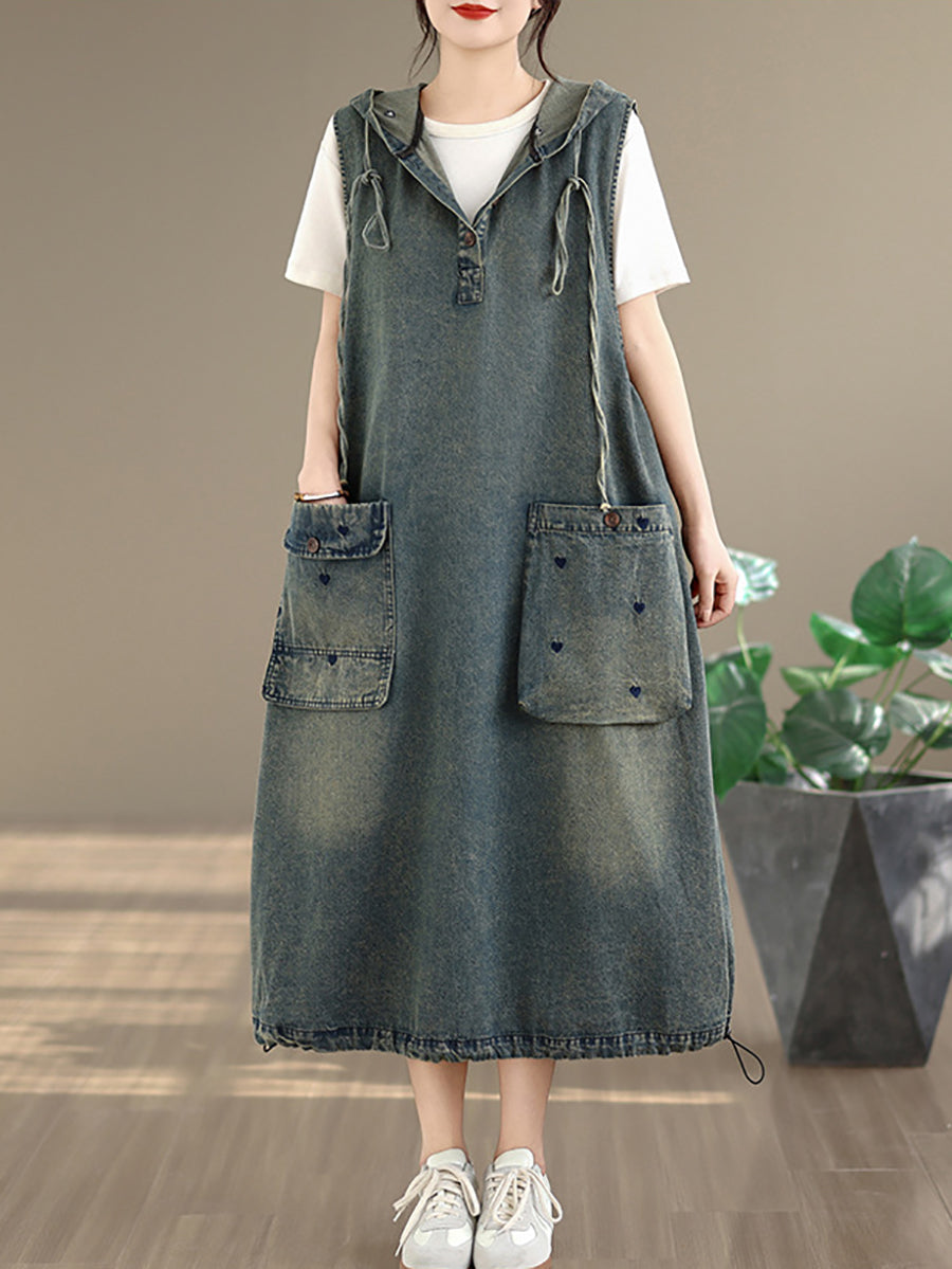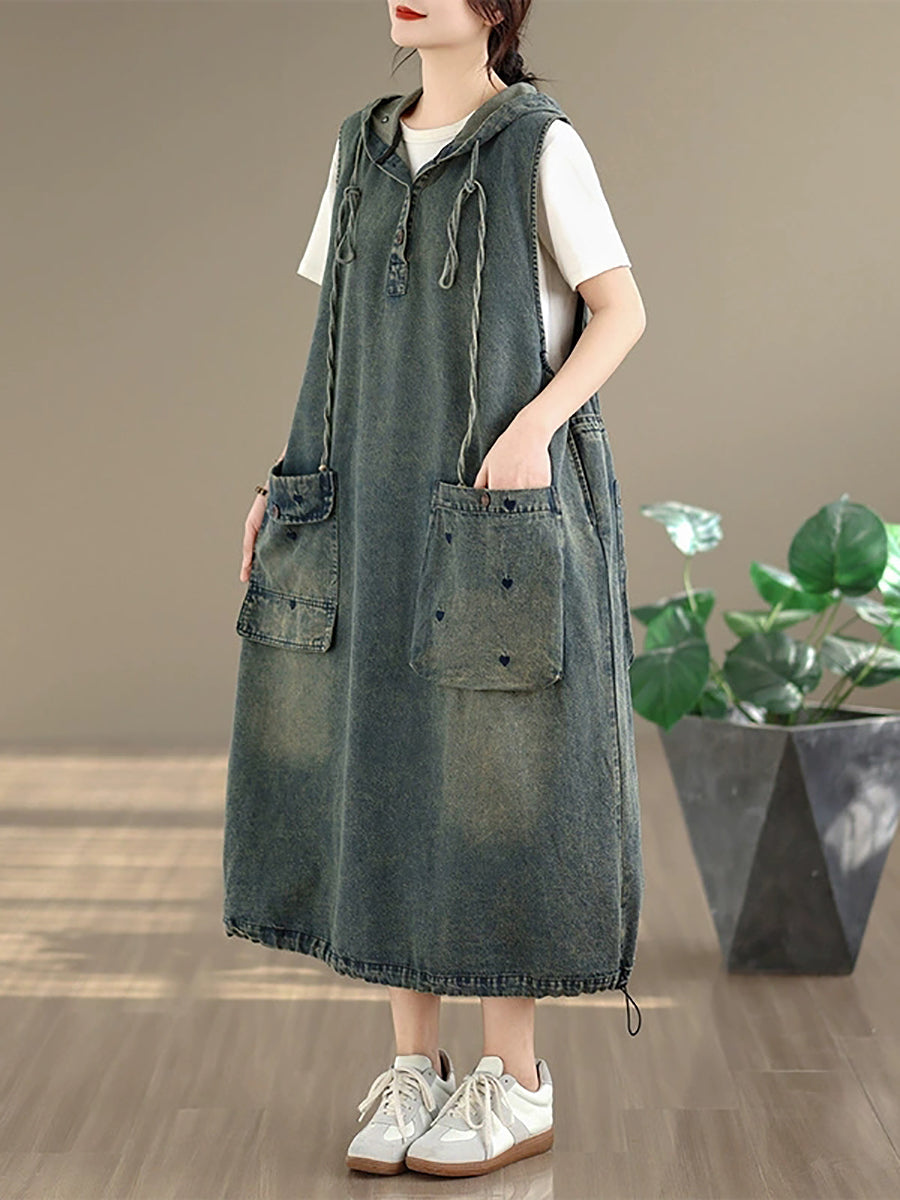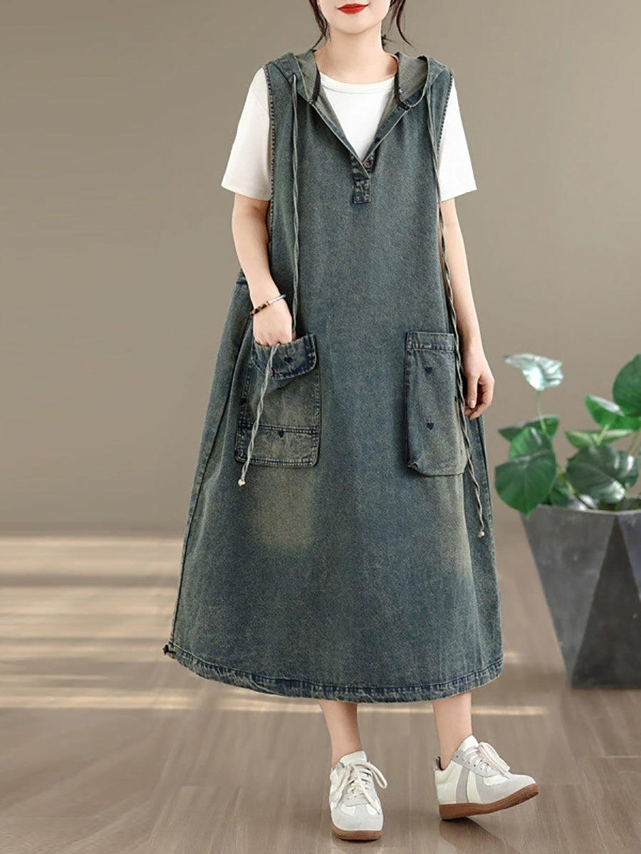 Vestido feminino de verão vintage com colete jeans e capuz