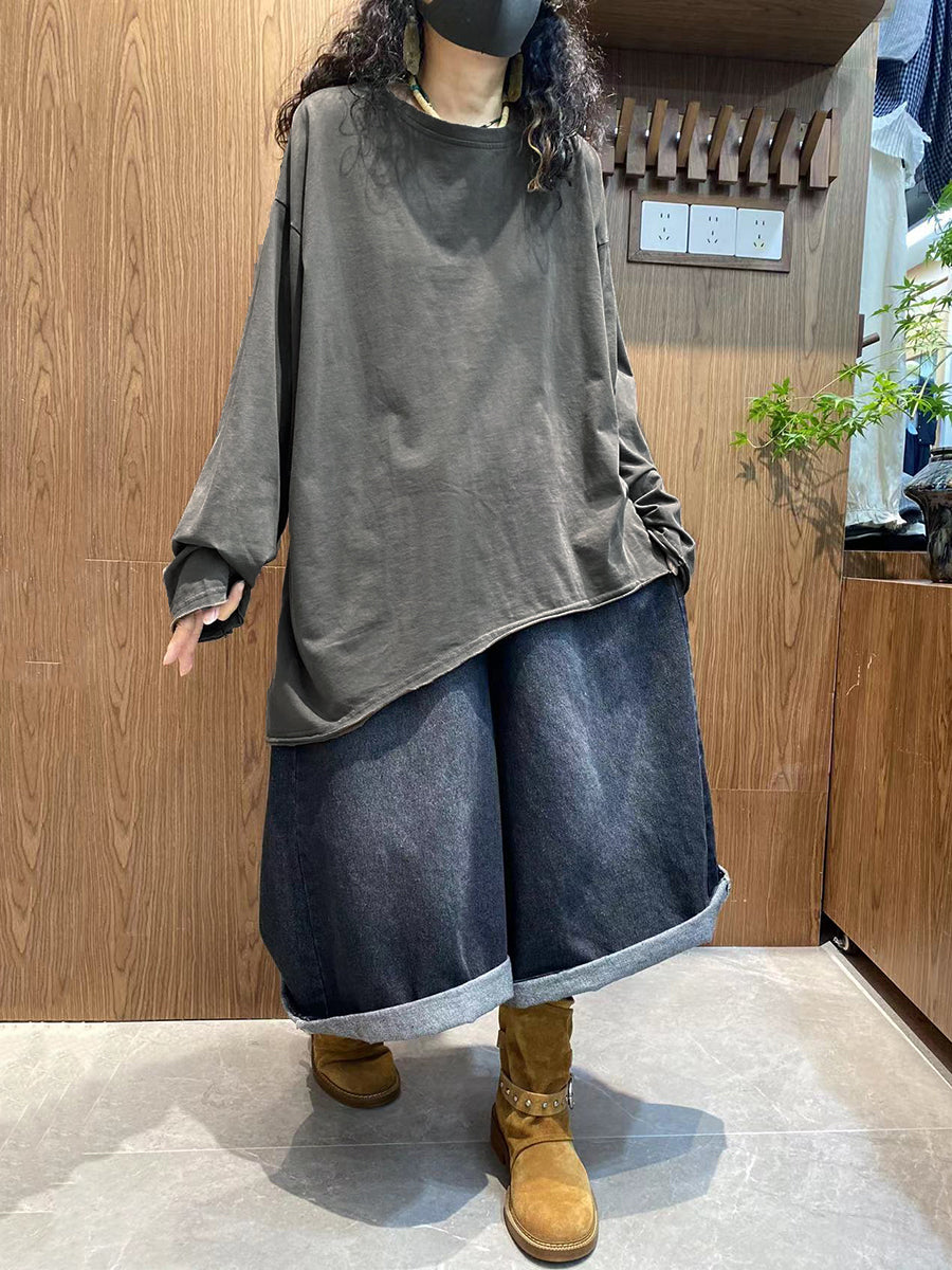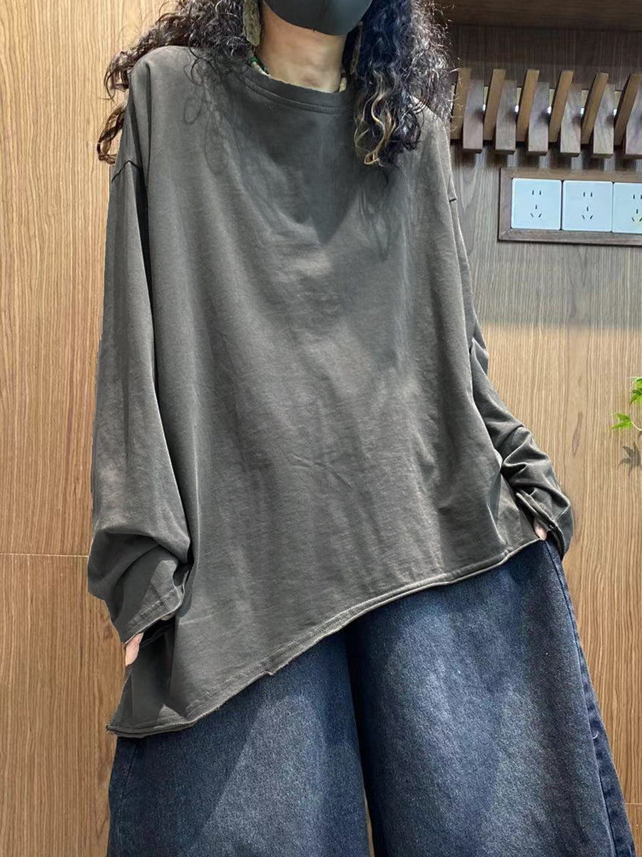 Camisa feminina casual de outono, cor pura, 100% algodão, gola redonda