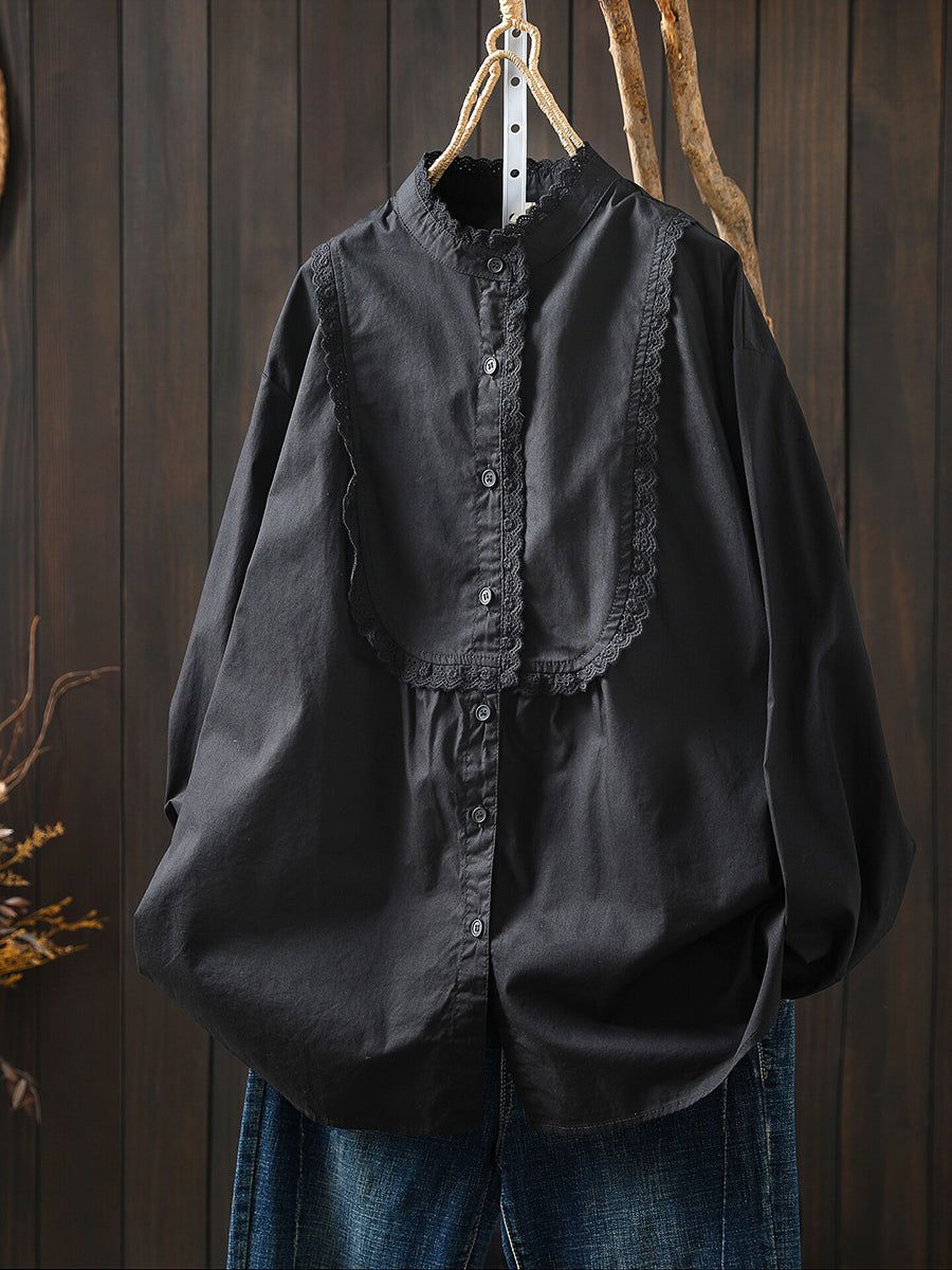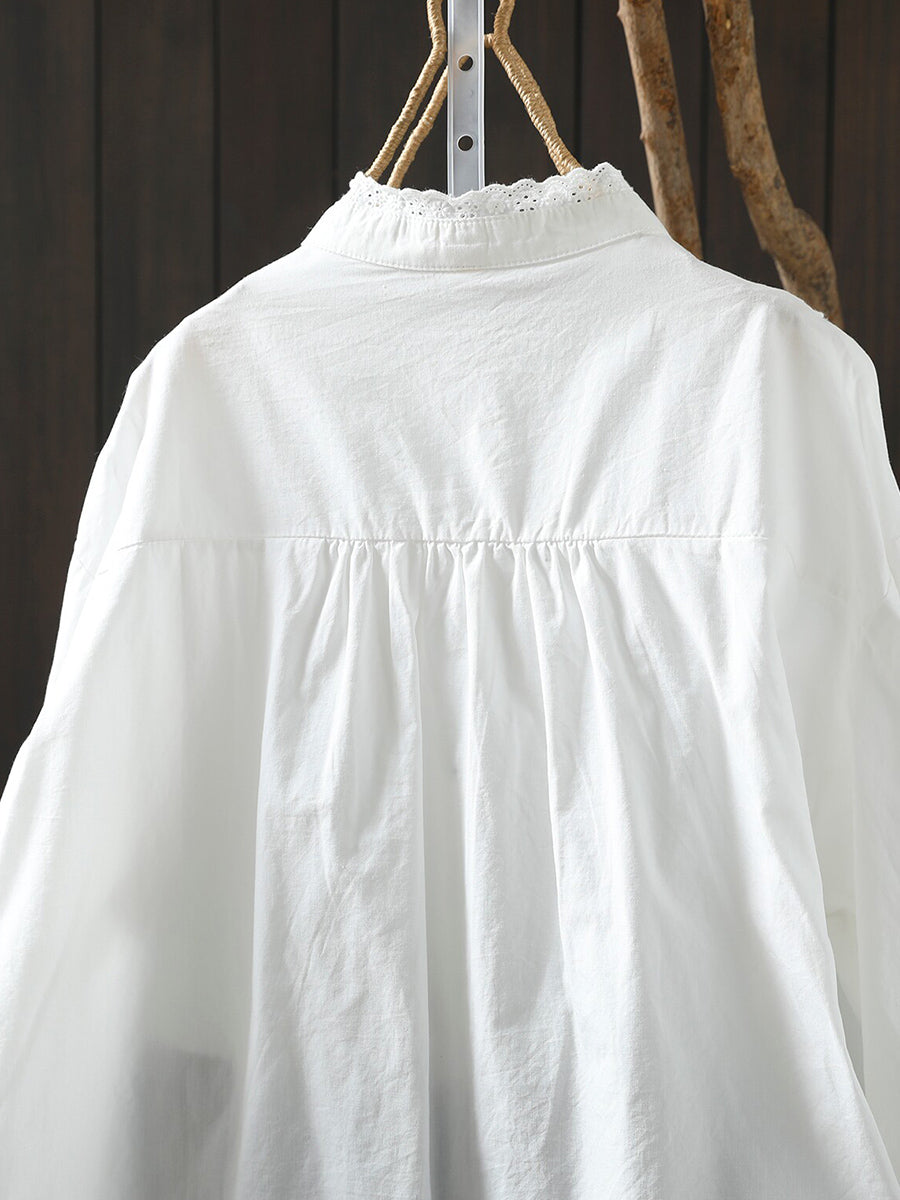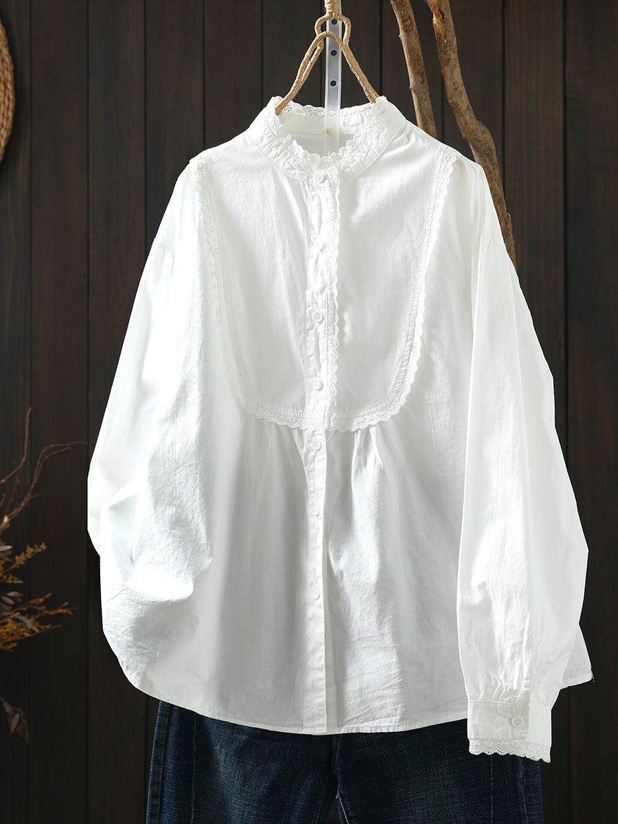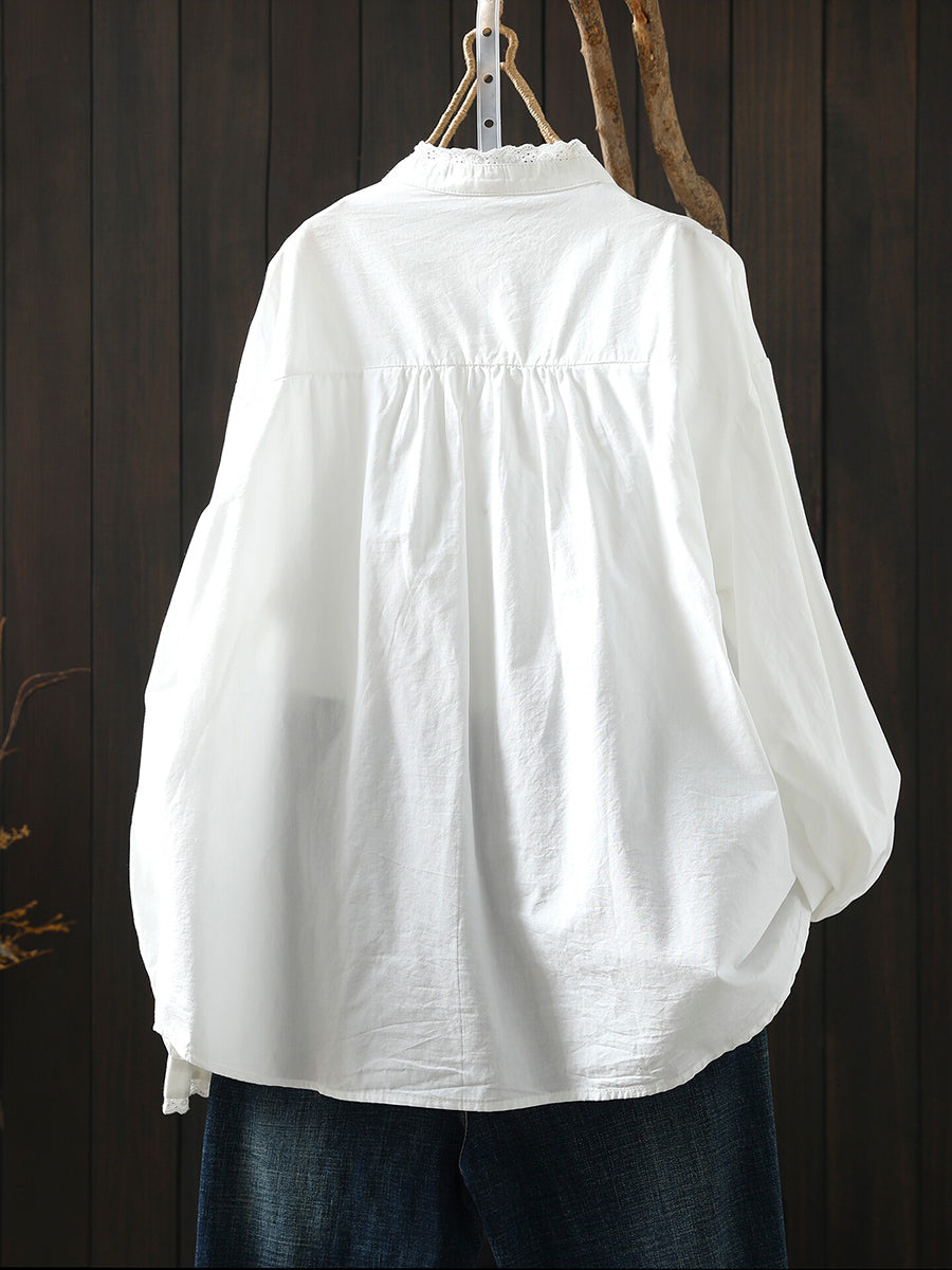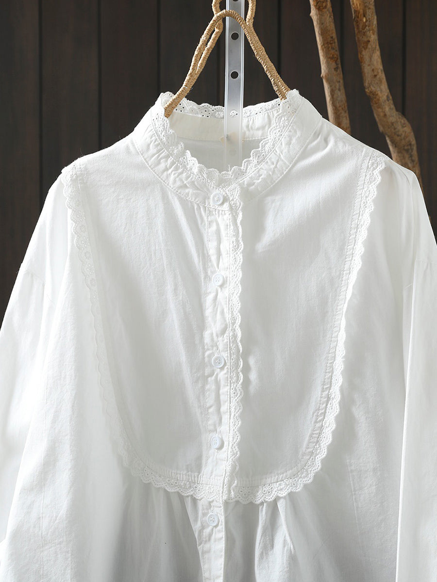 Camisa feminina de primavera com detalhes em renda artística, 100% algodão.