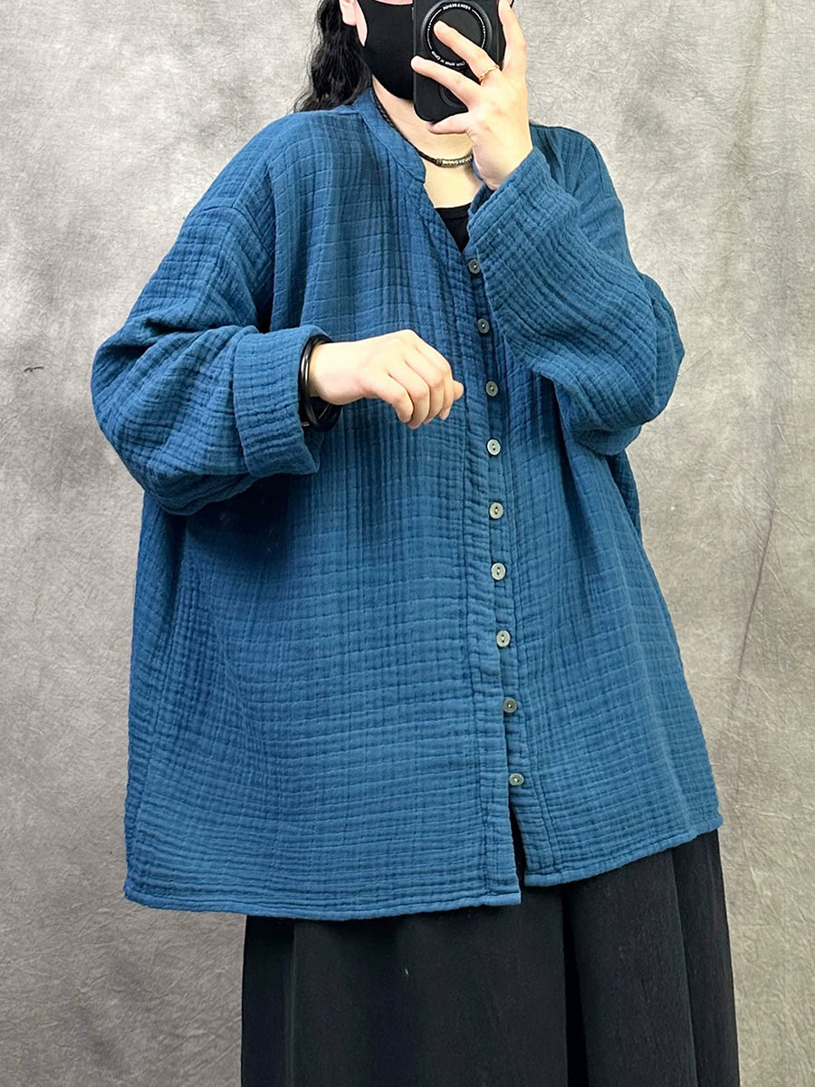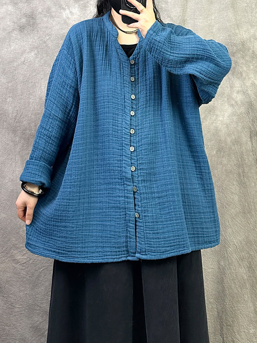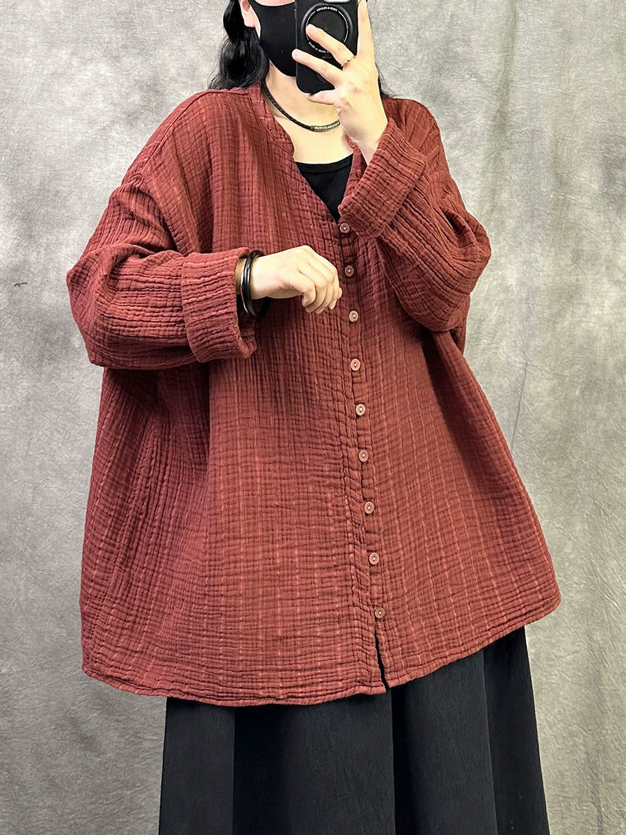 Camisa feminina de primavera com decote em V em cores lisas e estilo artístico.