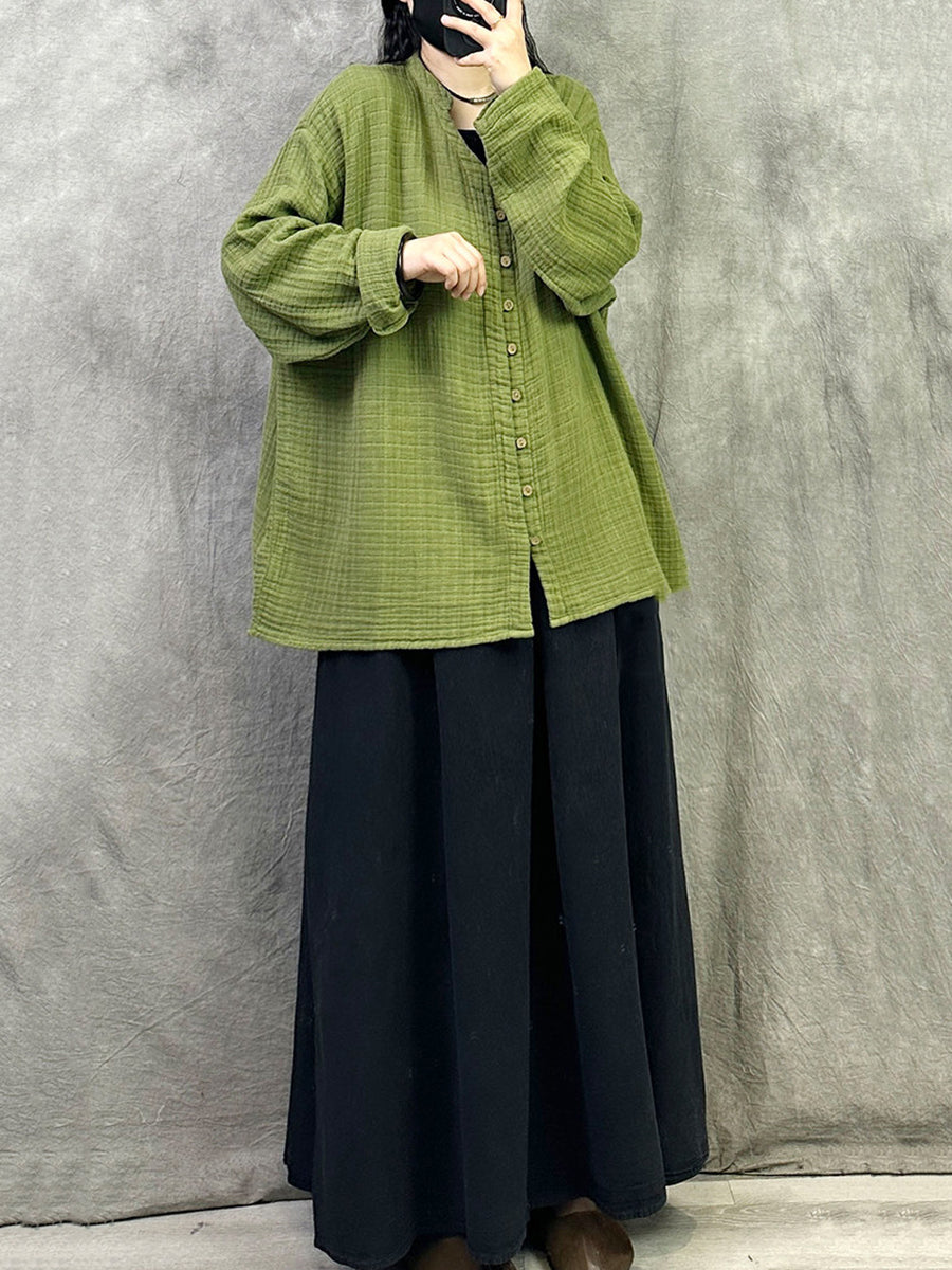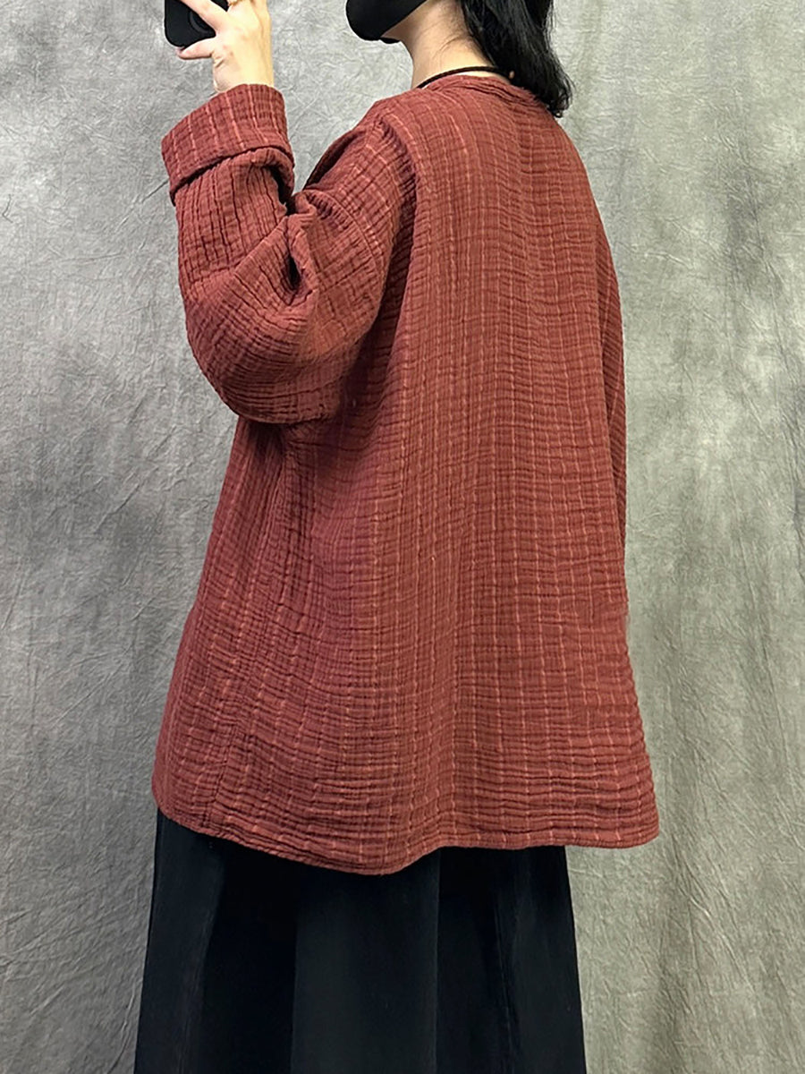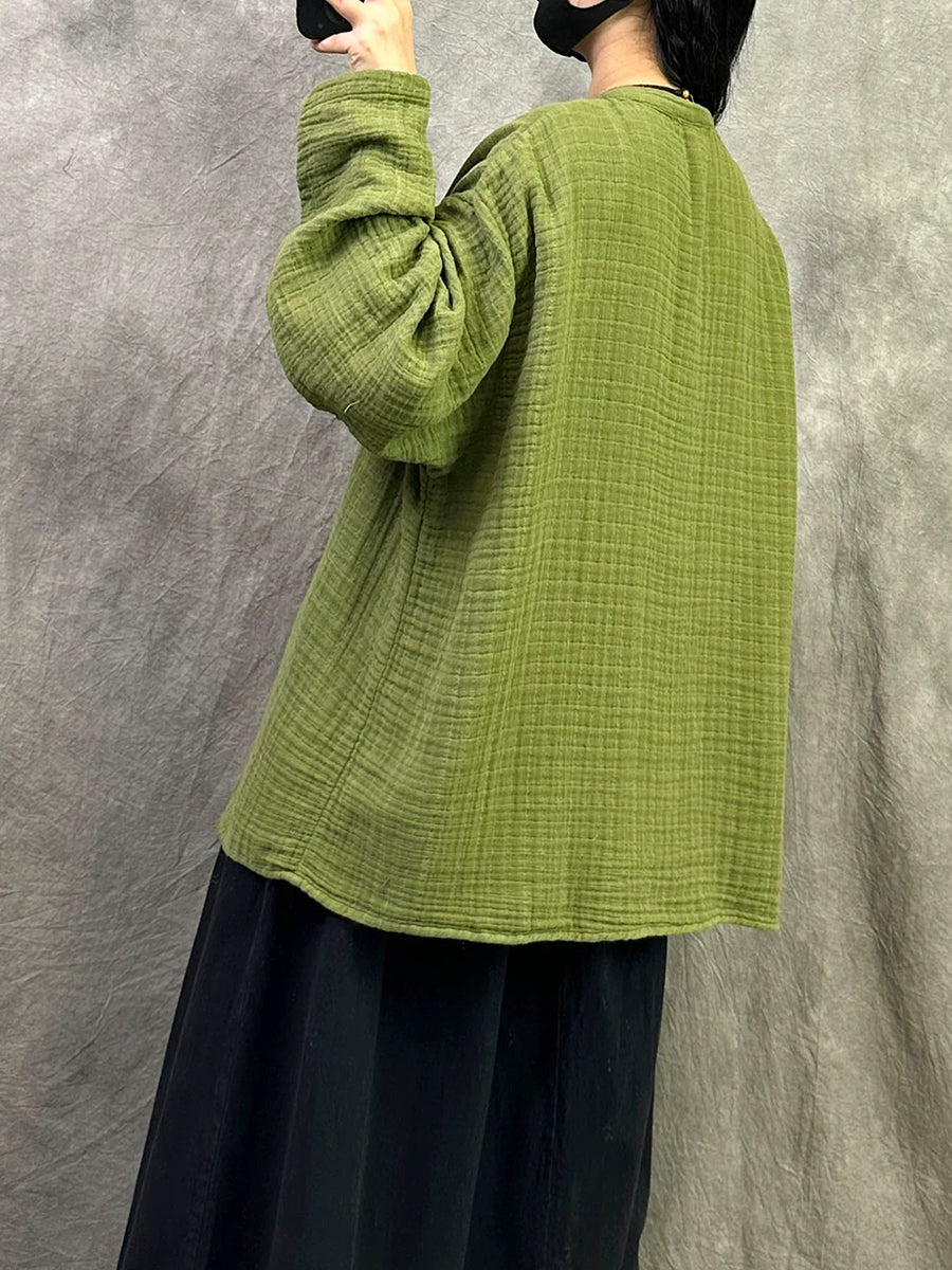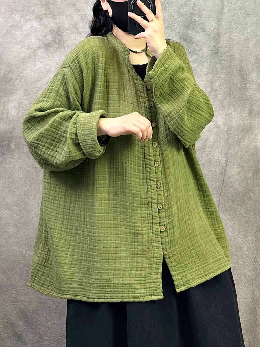 Camisa feminina de primavera com decote em V em cores lisas e estilo artístico.