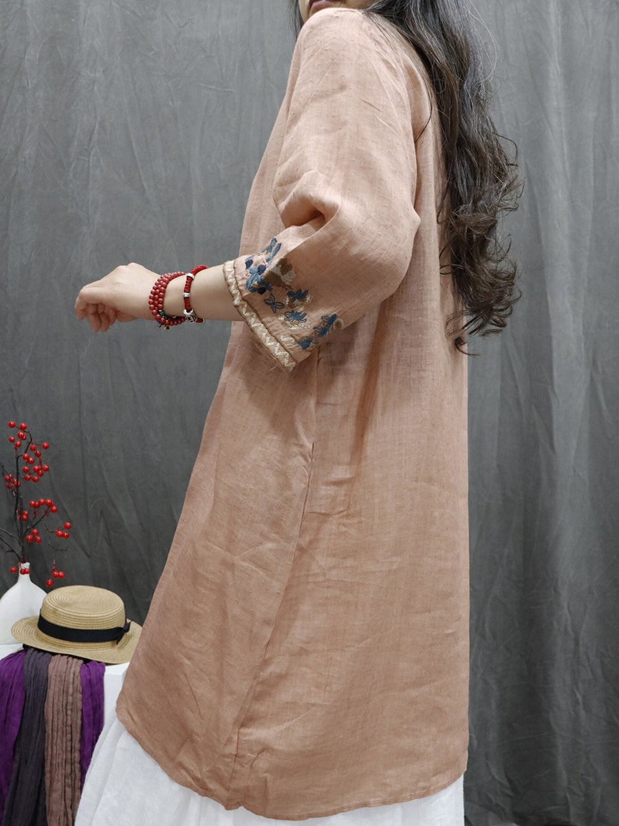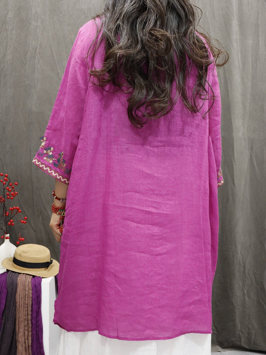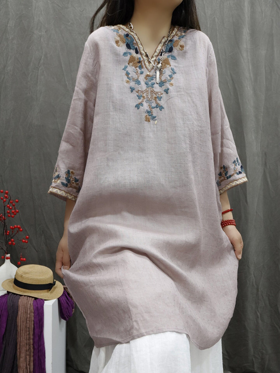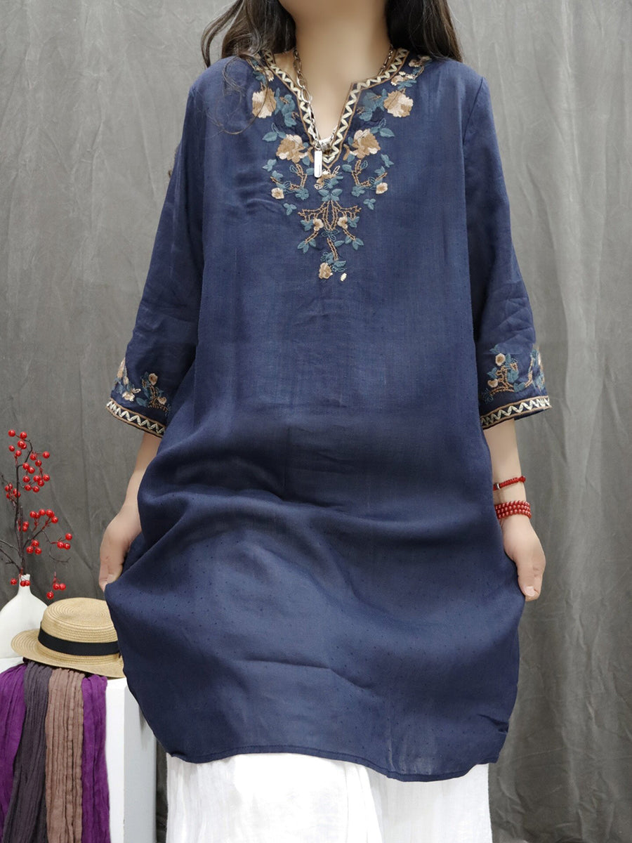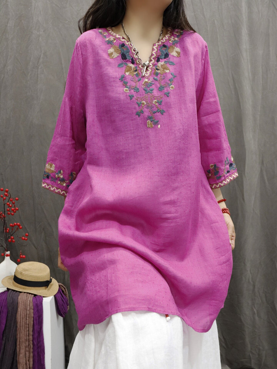 Blusa feminina de verão com bordado floral, decote em V, 100% rami.