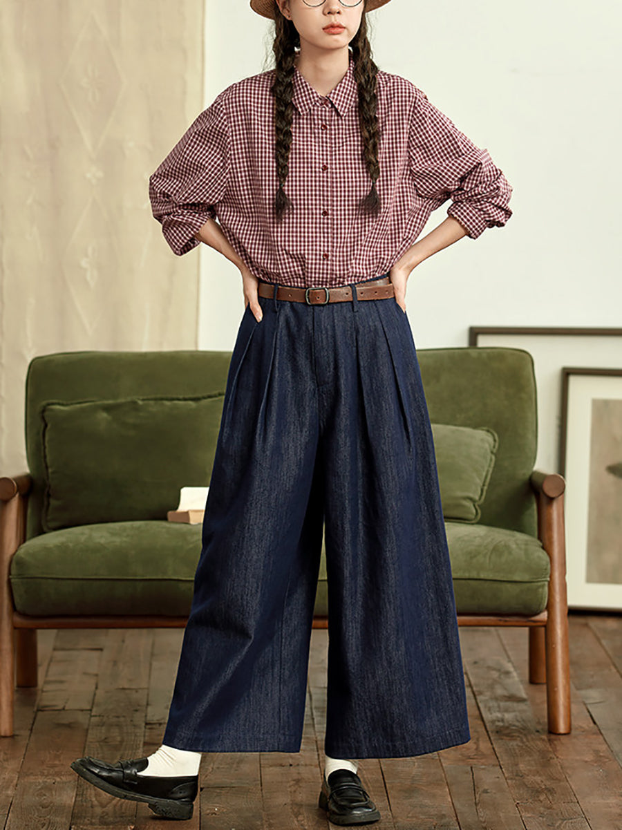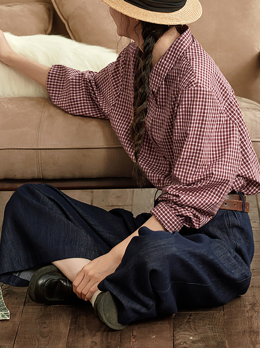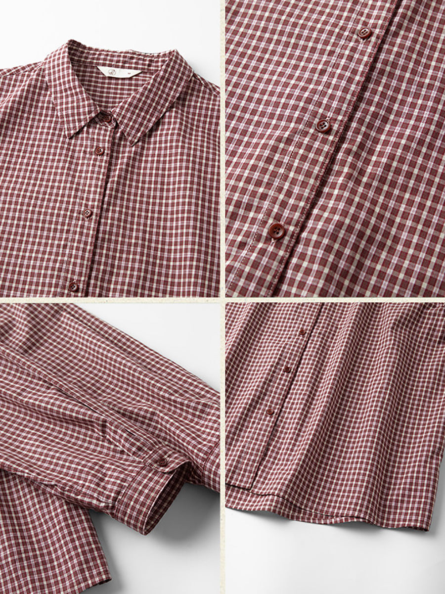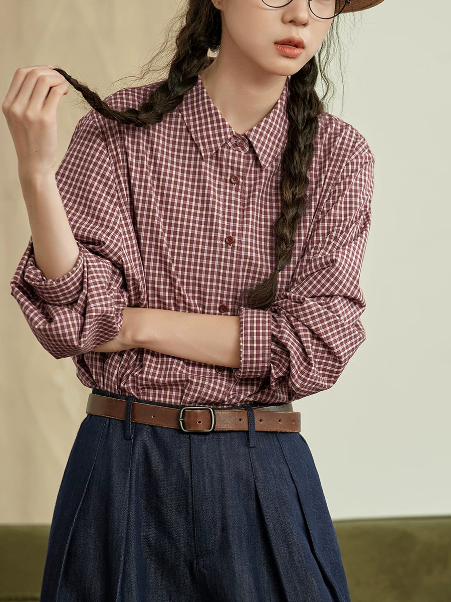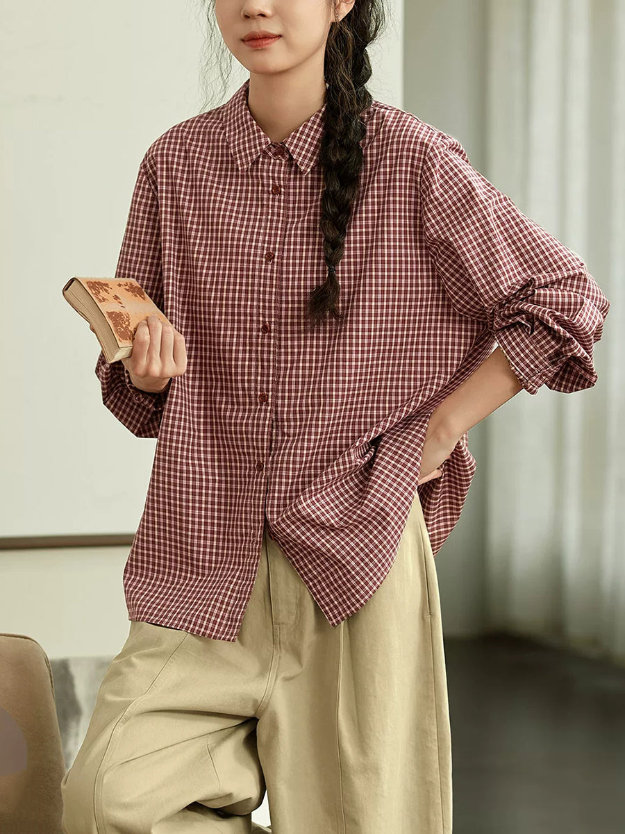 Blusa feminina de verão xadrez com gola dobrável, 100% algodão.
