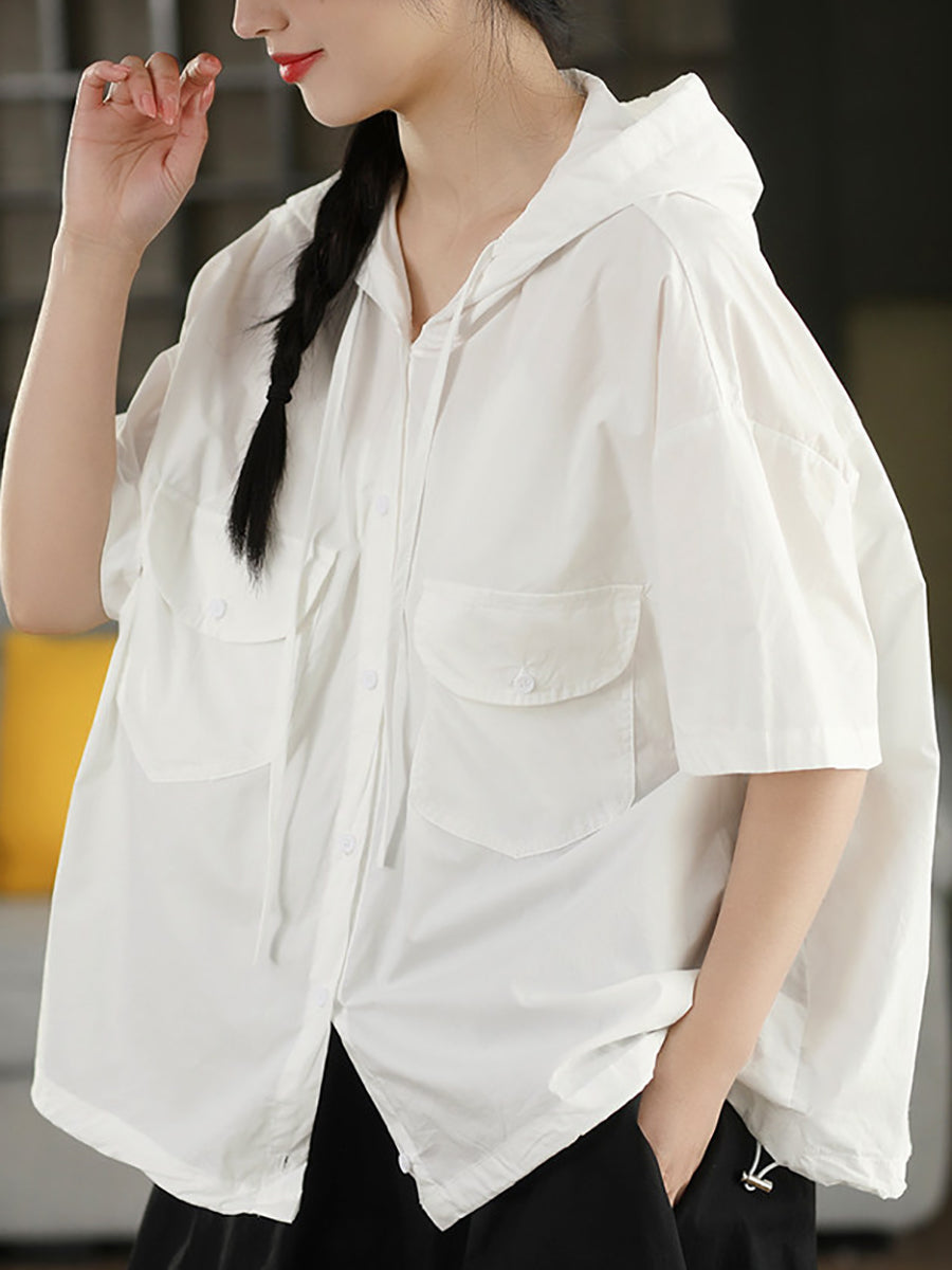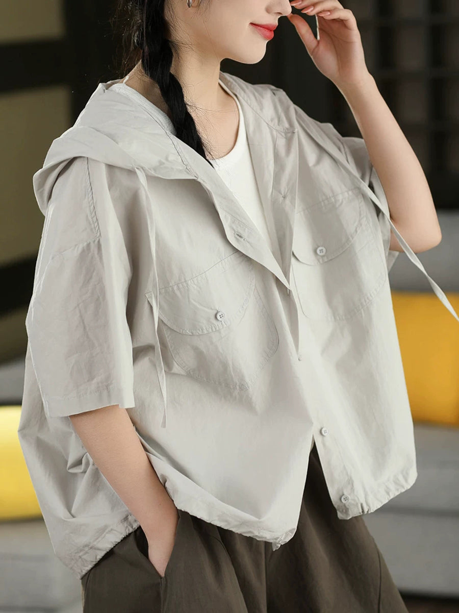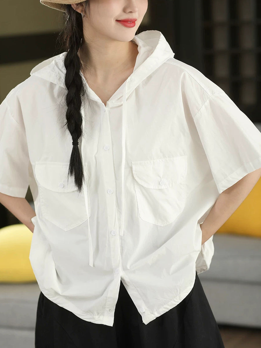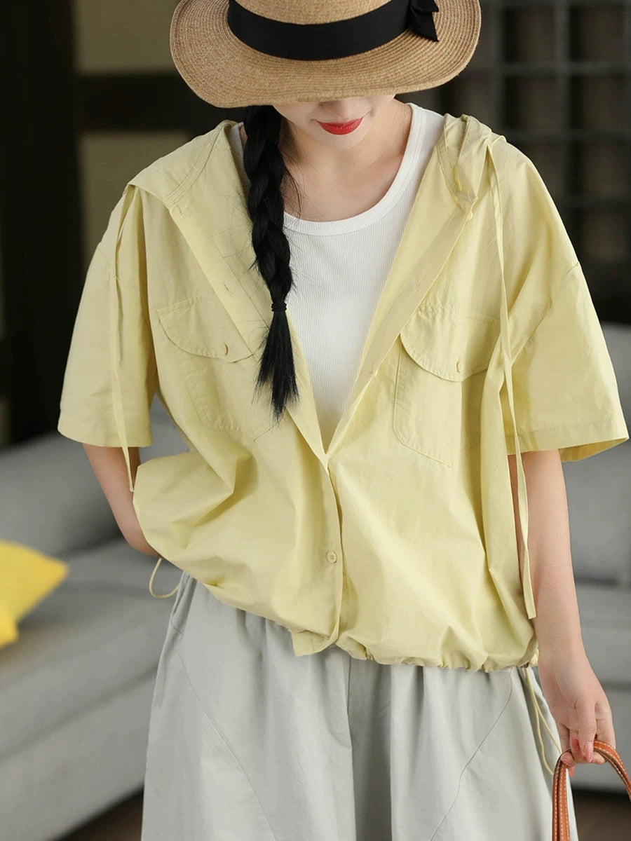 Camisa feminina de verão casual de cor lisa, 100% algodão, com capuz.