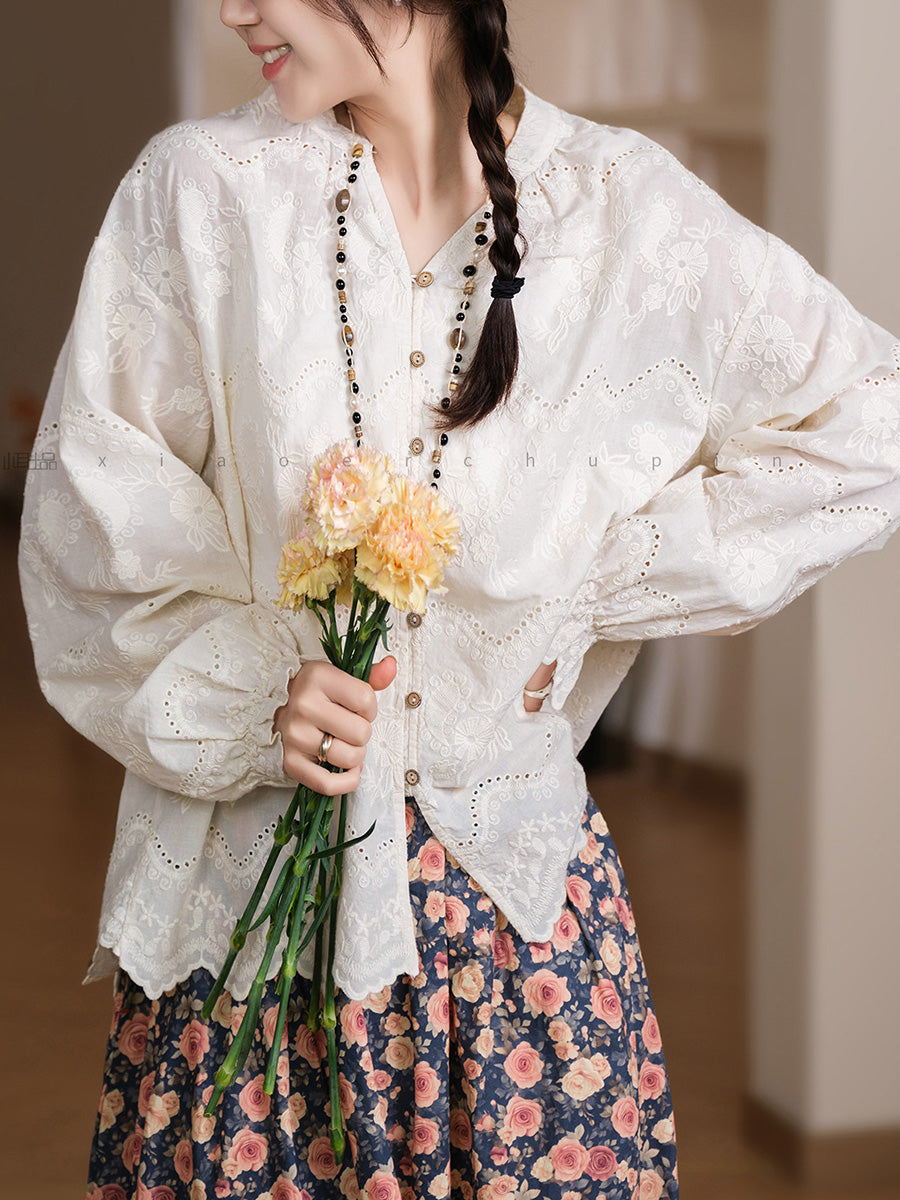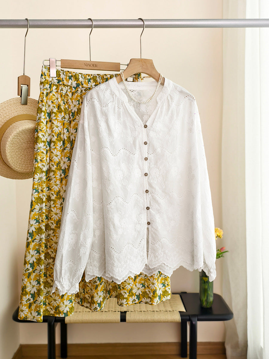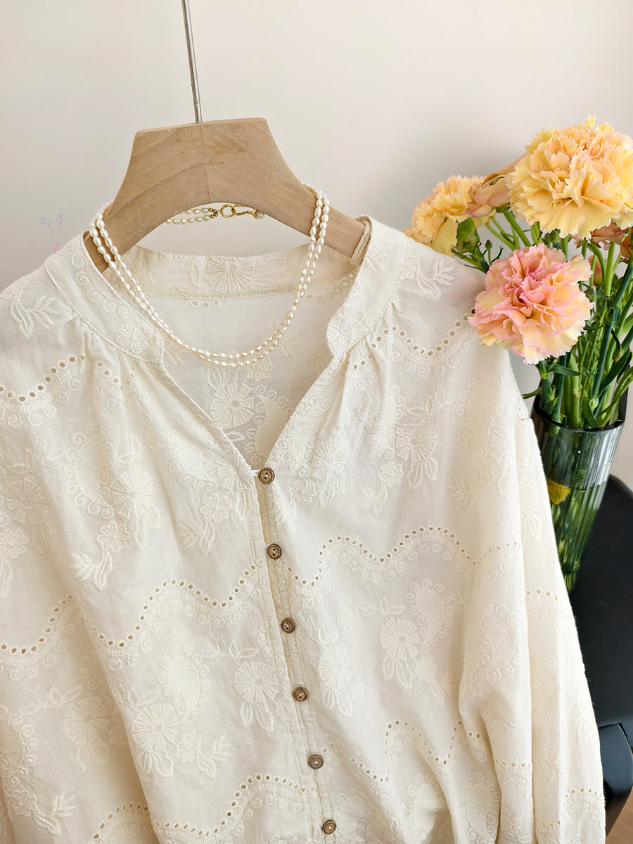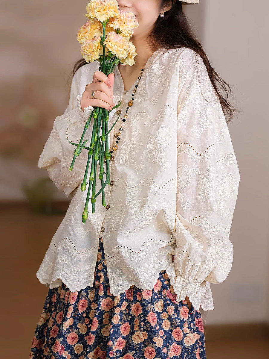Camisa feminina de primavera com bordado artístico, 100% algodão.