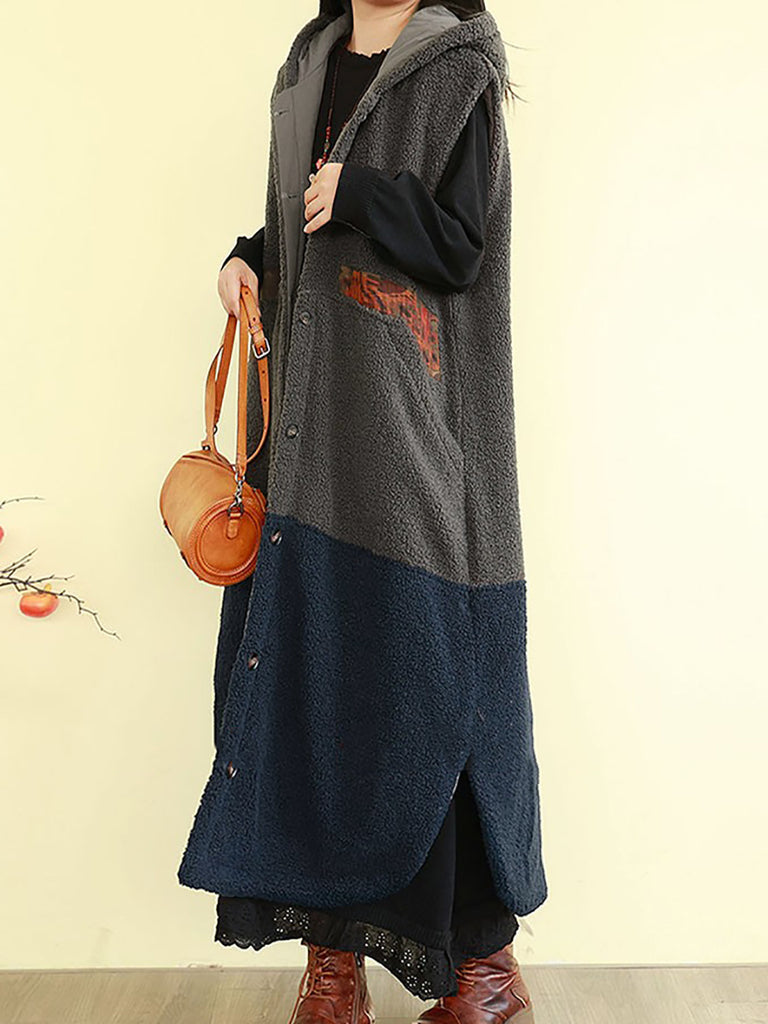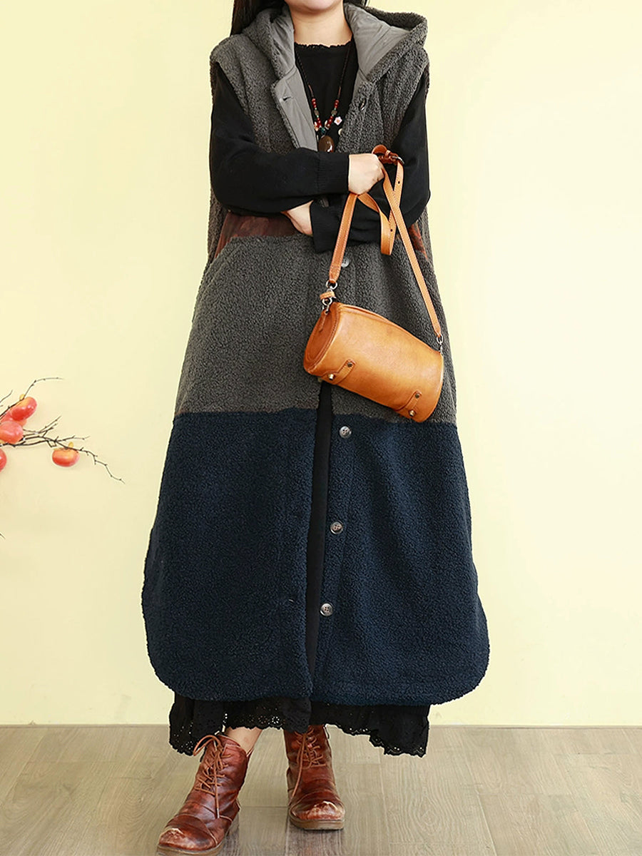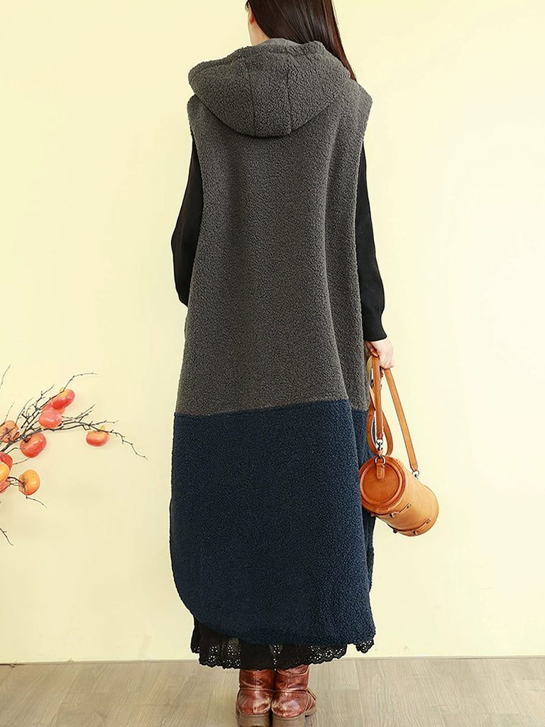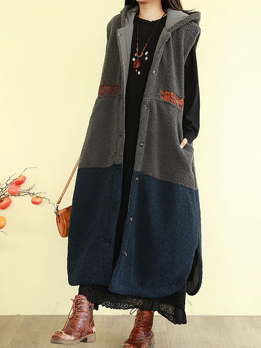 Colete acolchoado com capuz e bloco de cores de lã feminino para inverno
