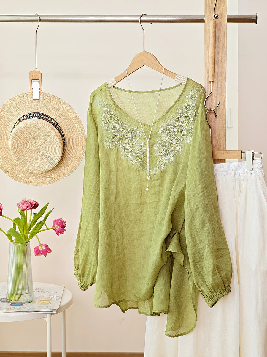 Blusa feminina de verão com bordado artístico de miçangas, 100% rami.
