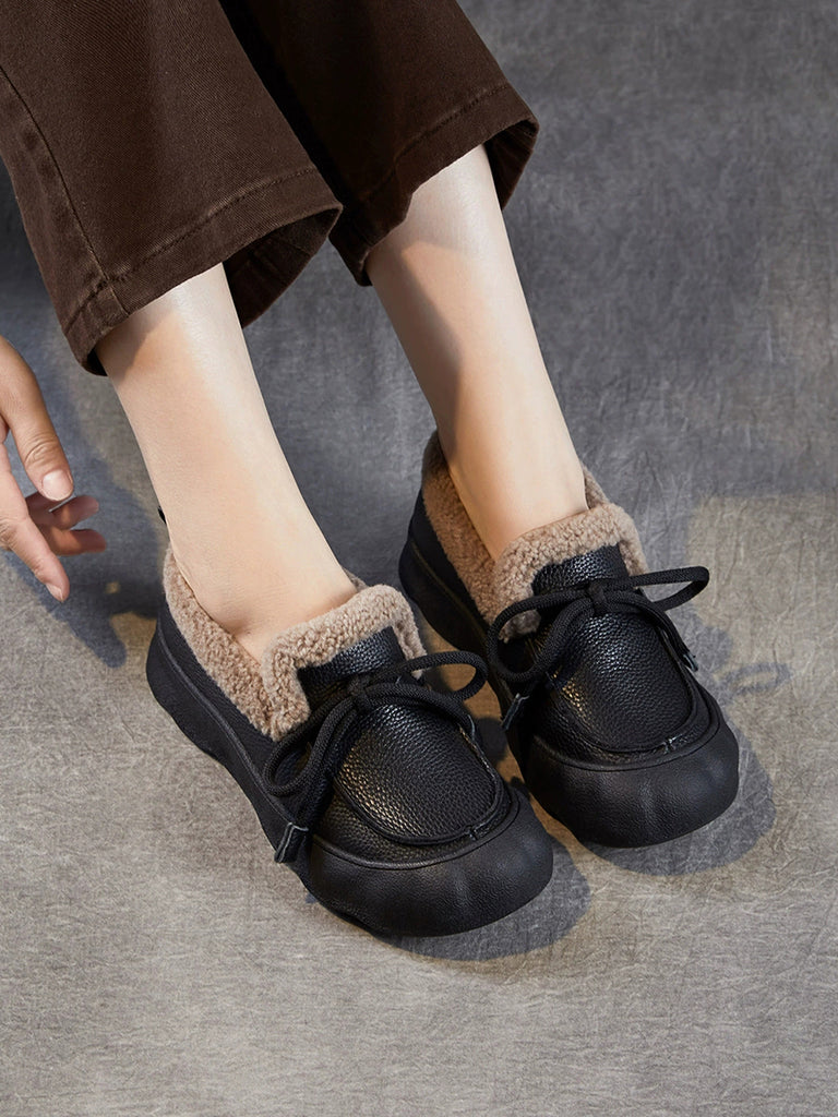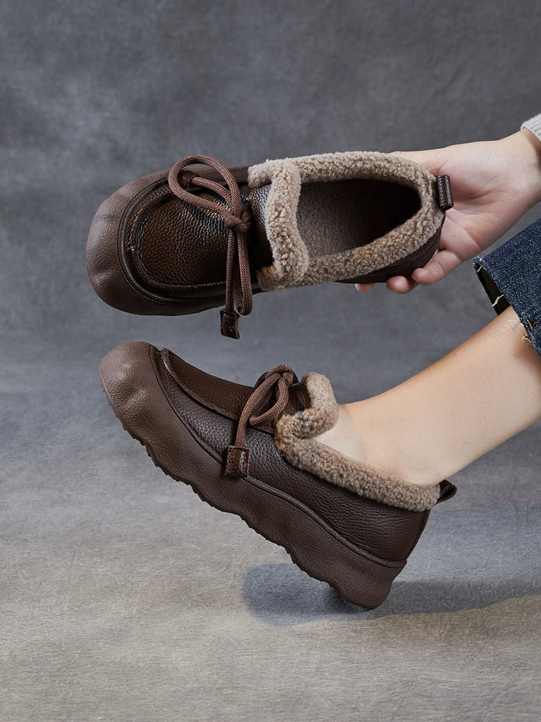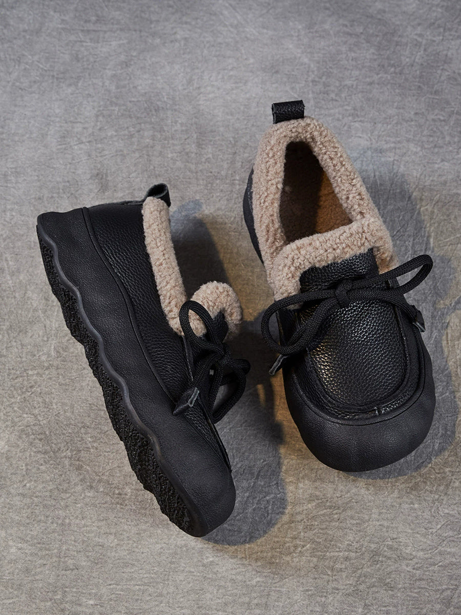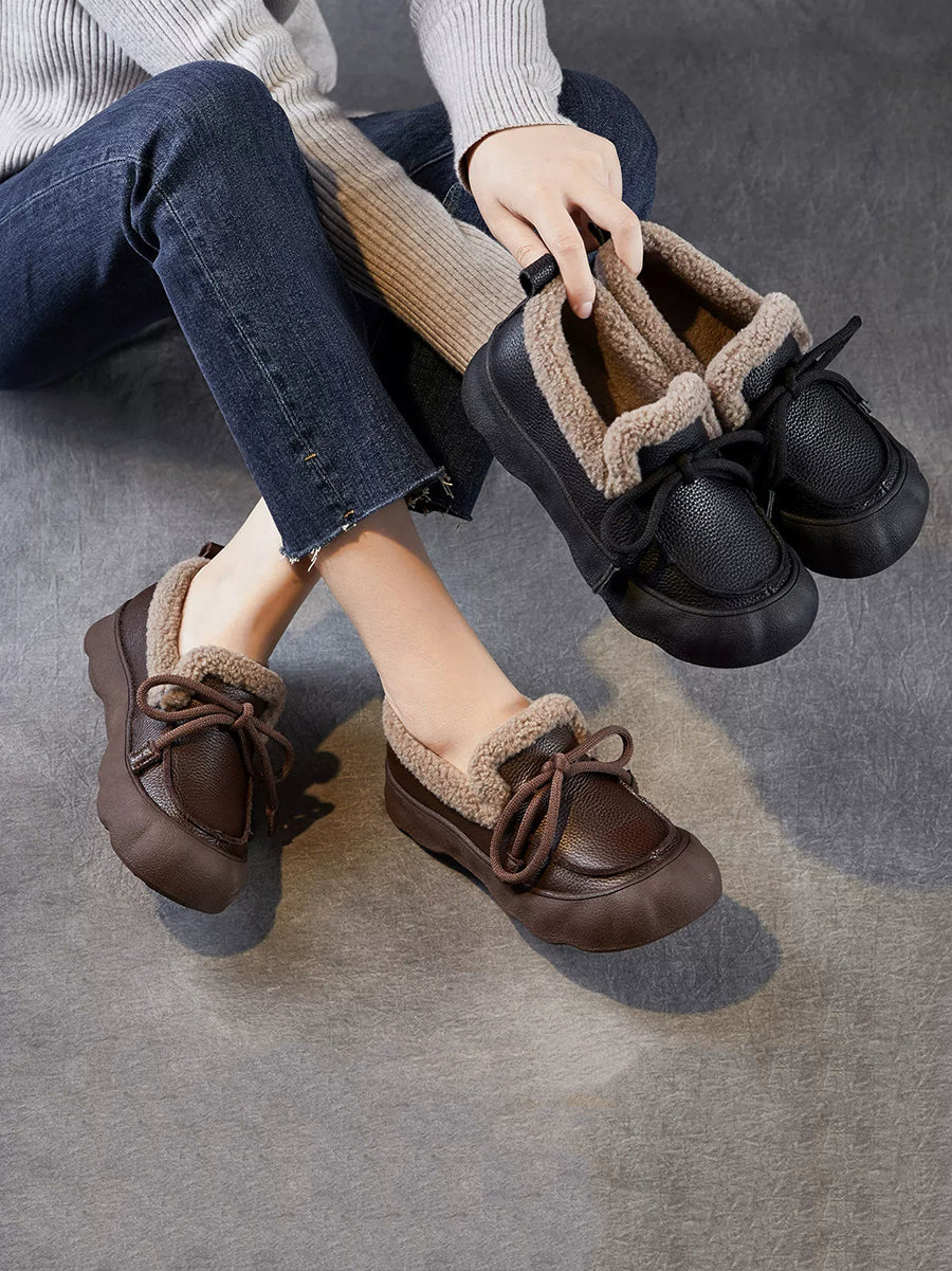 Sapatos femininos de inverno vintage em couro com forro de lã