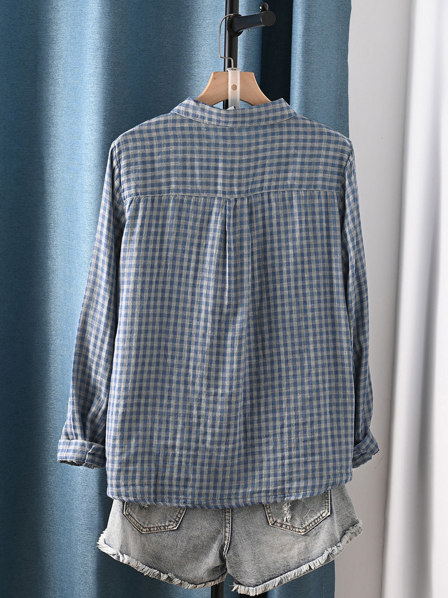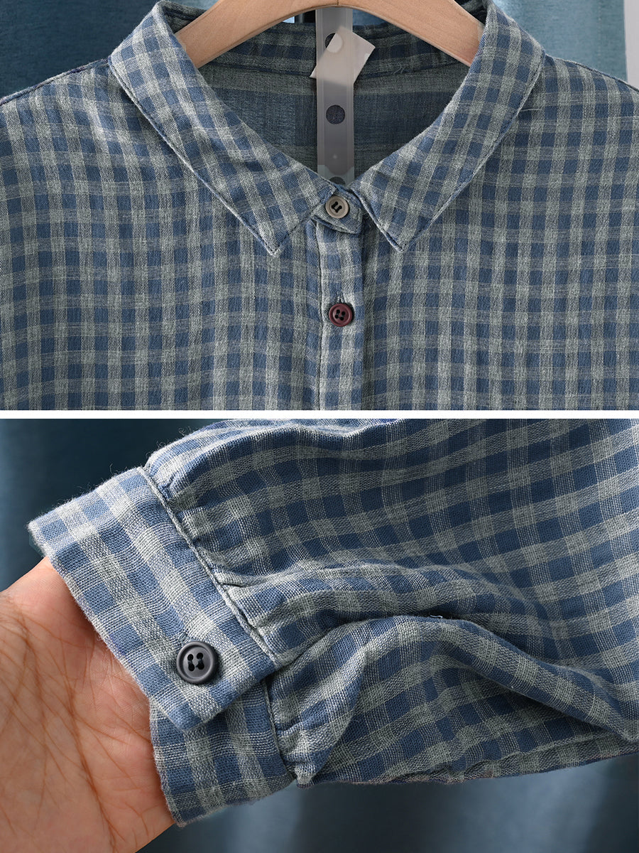 Camisa feminina xadrez de outono com gola virada para baixo 100% algodão